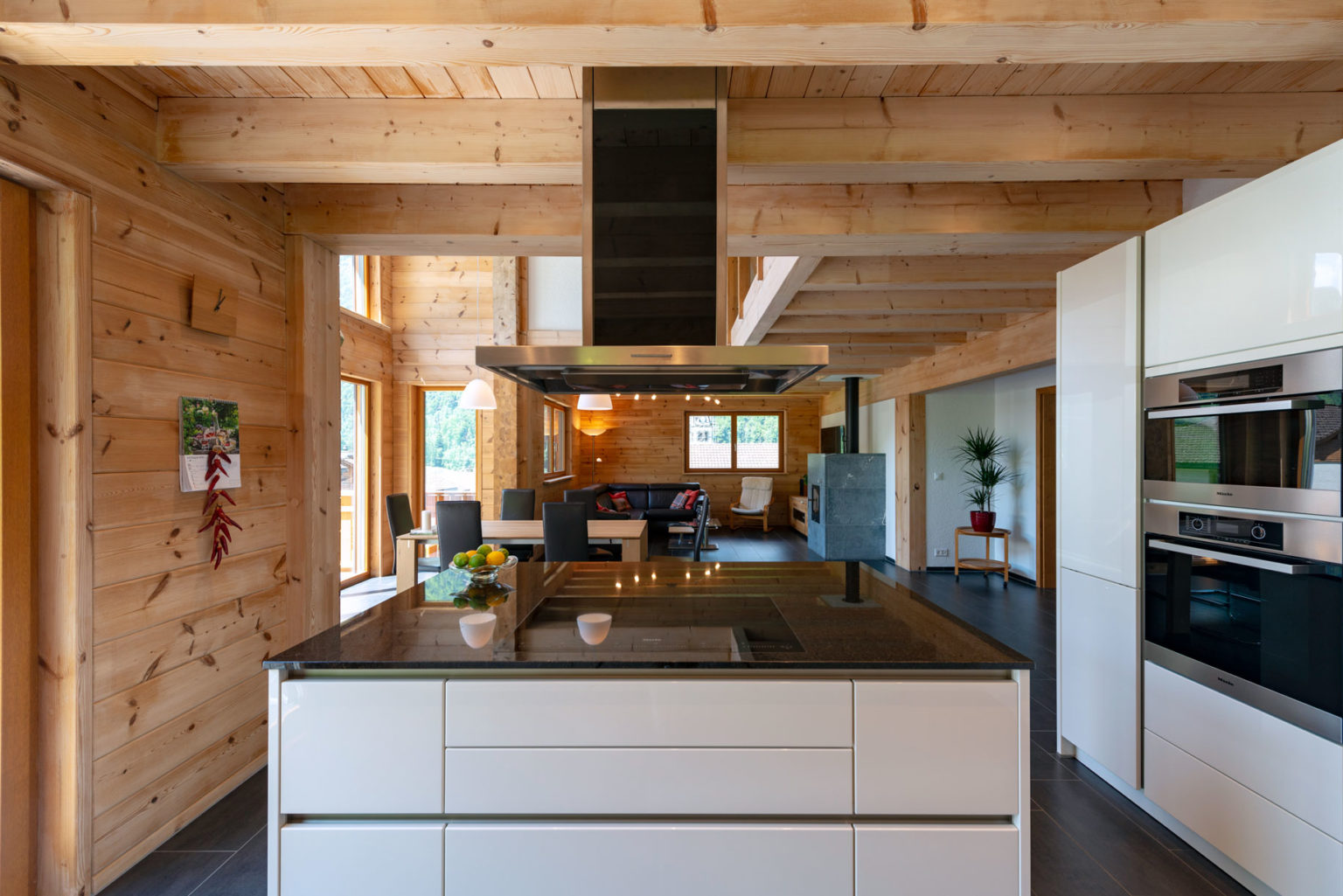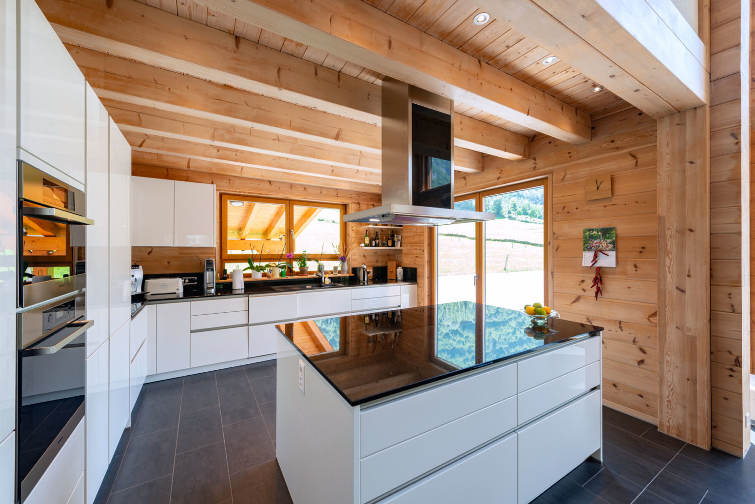 Da die Blockwände seines Eigenheims schadstofffrei und ohne weitere Dämmmaterialien sein sollten, wählte der Bauherr die 27cm dicke, einschalige Polarkiefernwand von Fullwood. „Zusammen mit Fullwood haben wir unser Holzhaus ganz nach unseren Wünschen und Vorstellungen planen können. Dann wurden die Wandelemente im Werk gefertigt, zum Bauplatz geliefert und von den Fullwood-Monteuren aufgestellt.“, zählt der Hausherr auf. Das Holzhaus steht in Hanglage und wurde auf einen Keller montiert, der im Vorfeld von einem ortsansässigen Kellerbauer erstellt wurde. Der Innenausbau erfolgte dann teilweise in Eigenleistung und überwiegend in Zusammenarbeit mit Schweizer Handwerksfirmen. „Wir sind sehr zufrieden mit der Beratung und dem Hausaufbau seitens Fullwood!“, betont der Hauseigentümer. Selbstverständlich wurde auch die vor Ort zu erwartende Schneelast für das Hausdach entsprechend in die Berechnungen miteinbezogen.