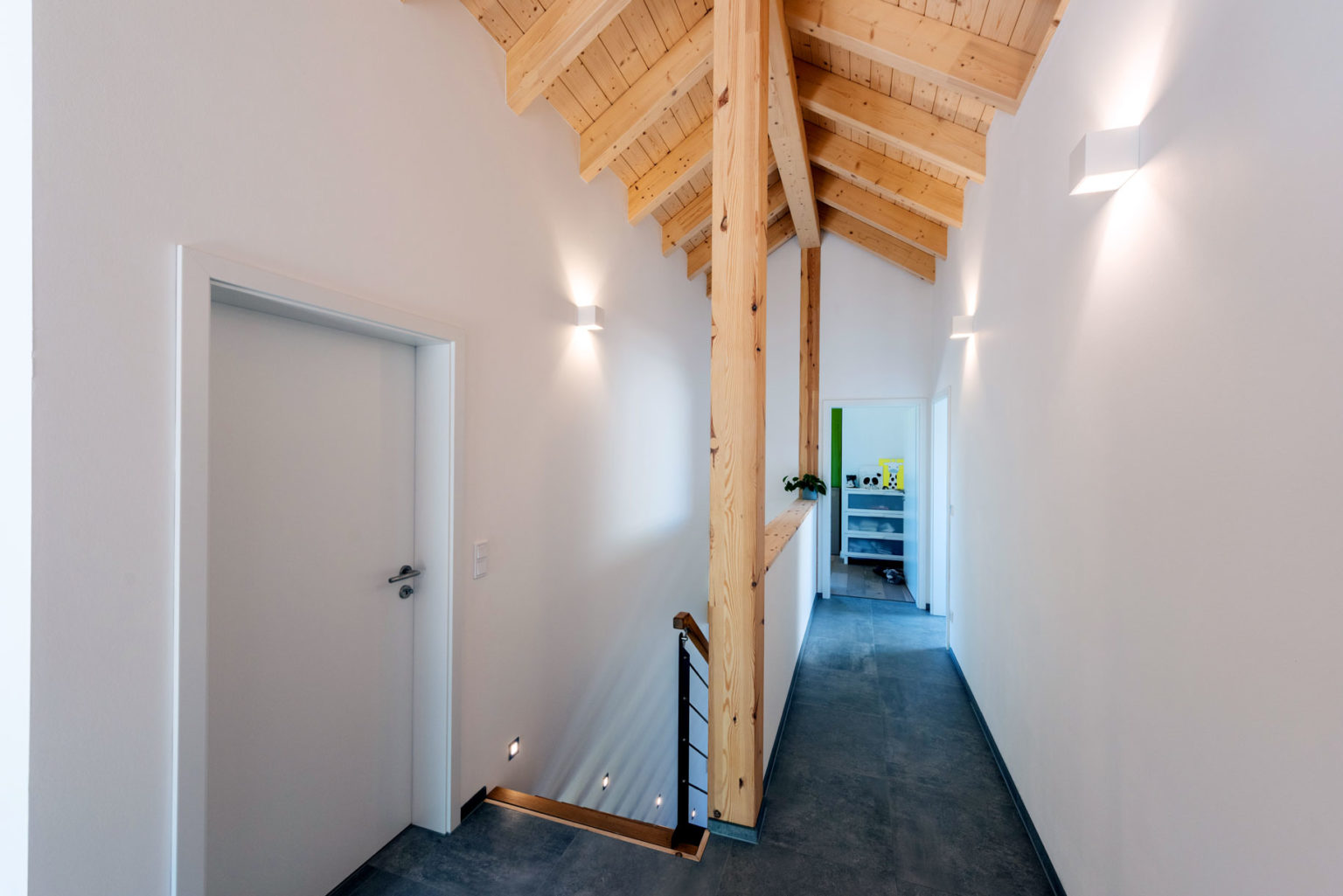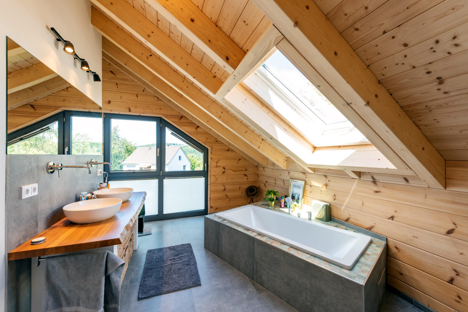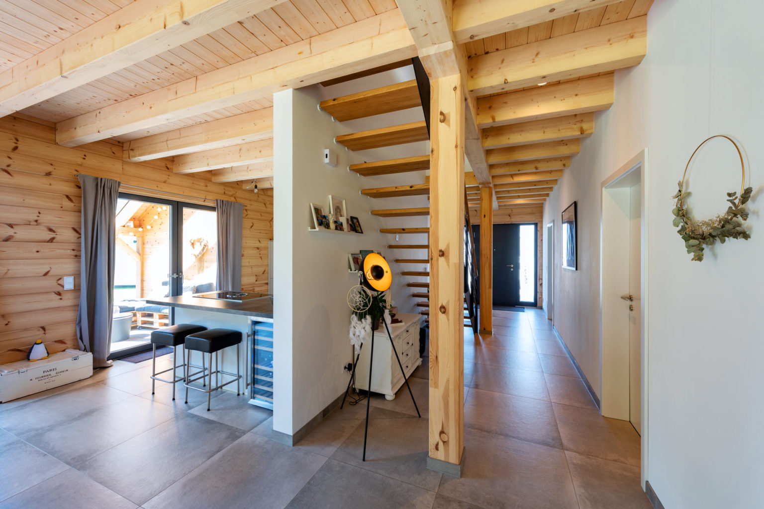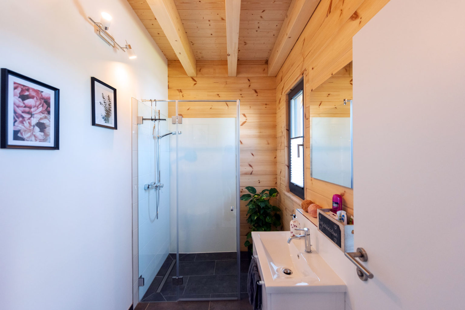 Abgesehen von der Galeriebrüstung sind Transparenz und Glas ein großes Thema in Holzhaus „Ulmenglück“. Viele, überwiegend bodentiefe Fenster wurden eingebaut um so viel natürliches Licht wie möglich hereinströmen zu lassen. Ergänzt werden sie von großen Dachfenstern in den Schrägen, damit auch das Dachgeschoss reichlich Tageslicht erhält. Die Fensterrahmen in schiefergrau entsprechen farblich der Eindeckung des Satteldachs (Tonziegel), der Haustüre und dem Garagentor sowie dem Balkongeländer. Harmonisch ergänzt werden die schiefergrauen Elemente von großen, grauen, flach verfugten Fliesenquadraten, die sich einheitlich auf sämtlichen Böden und auf manchen Wandteilen der Nassräume ausbreiten. Ebenso die graue Terrasse aus WPC sowie die silbergraue Außenpflasterung passen perfekt ins Bild. Die naturhellen Kiefernwände, Sichtbalkendecken und Sichtdachstuhl wurden mit UV-Schutz vor dem natürlichen Nachdunkeln bewahrt, und auch außen bleiben die Blockwände dank Wetterschutzlasur schön und vergrauen nicht. Die Außenlasur enthält zusätzlich weiße Pigmente, die das Holz besonders hell erstrahlen lassen. Im Hausinnern sorgen wiederum weiß tapezierte Trennwände (leichte Ständerbauweise) für Lichtreflektionen, die das Holzhaus zusätzlich aufhellen. Dank des vielen Massivholzes herrscht dennoch warme Behaglichkeit in allen Räumen. Der offensichtlichen Ästhetik steht die Funktionalität von Holzhaus „Ulmenglück“ in nichts nach, was sich in kurzen, sinnvollen Wegen und pflegeleichten Böden ausdrückt. Das Holzhaus selbst bedarf, im Gegensatz zu Holzhäusern manch anderer Hersteller, keiner Nachoptimierung, denn seine luftdichten Wände sind setzungsfrei.