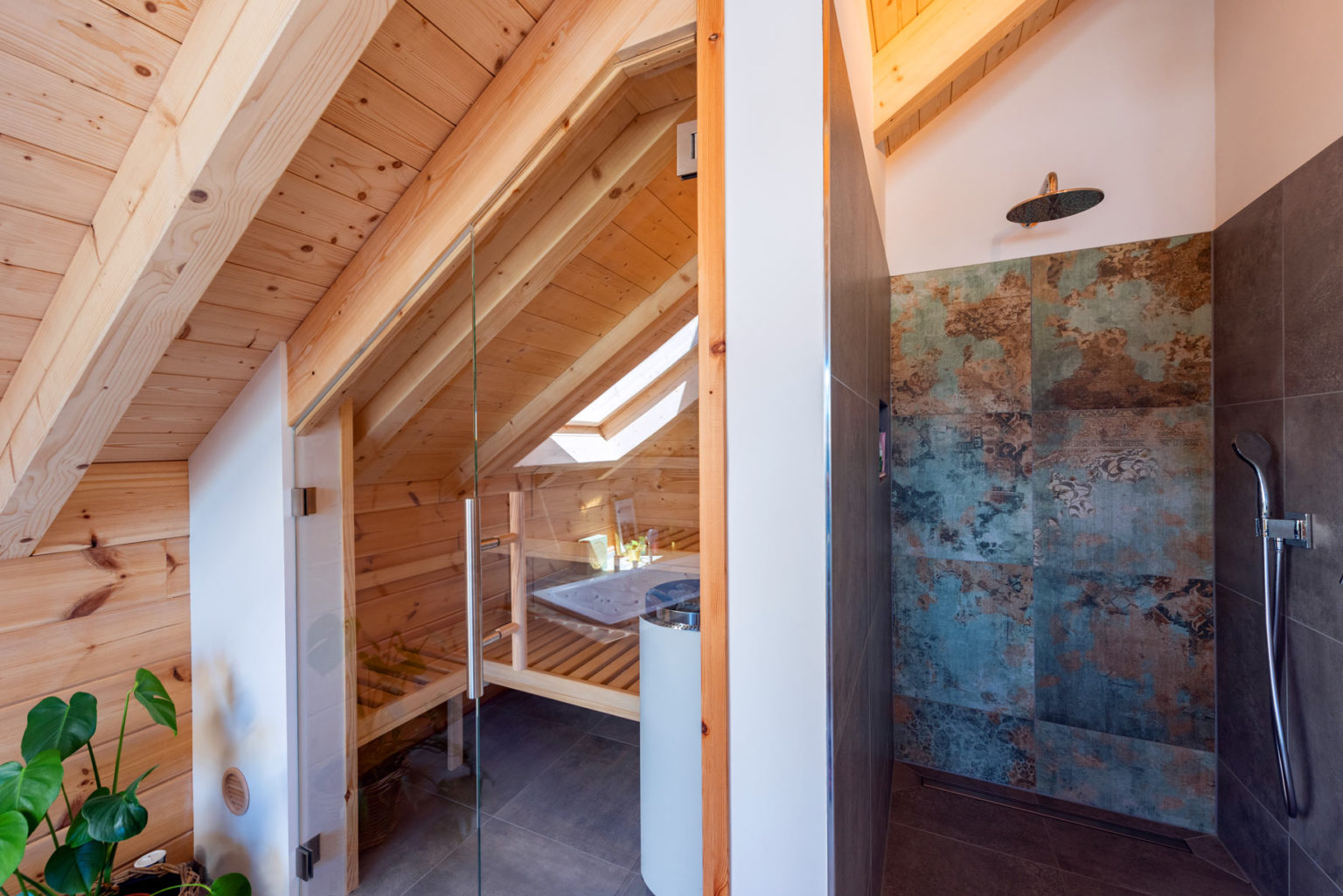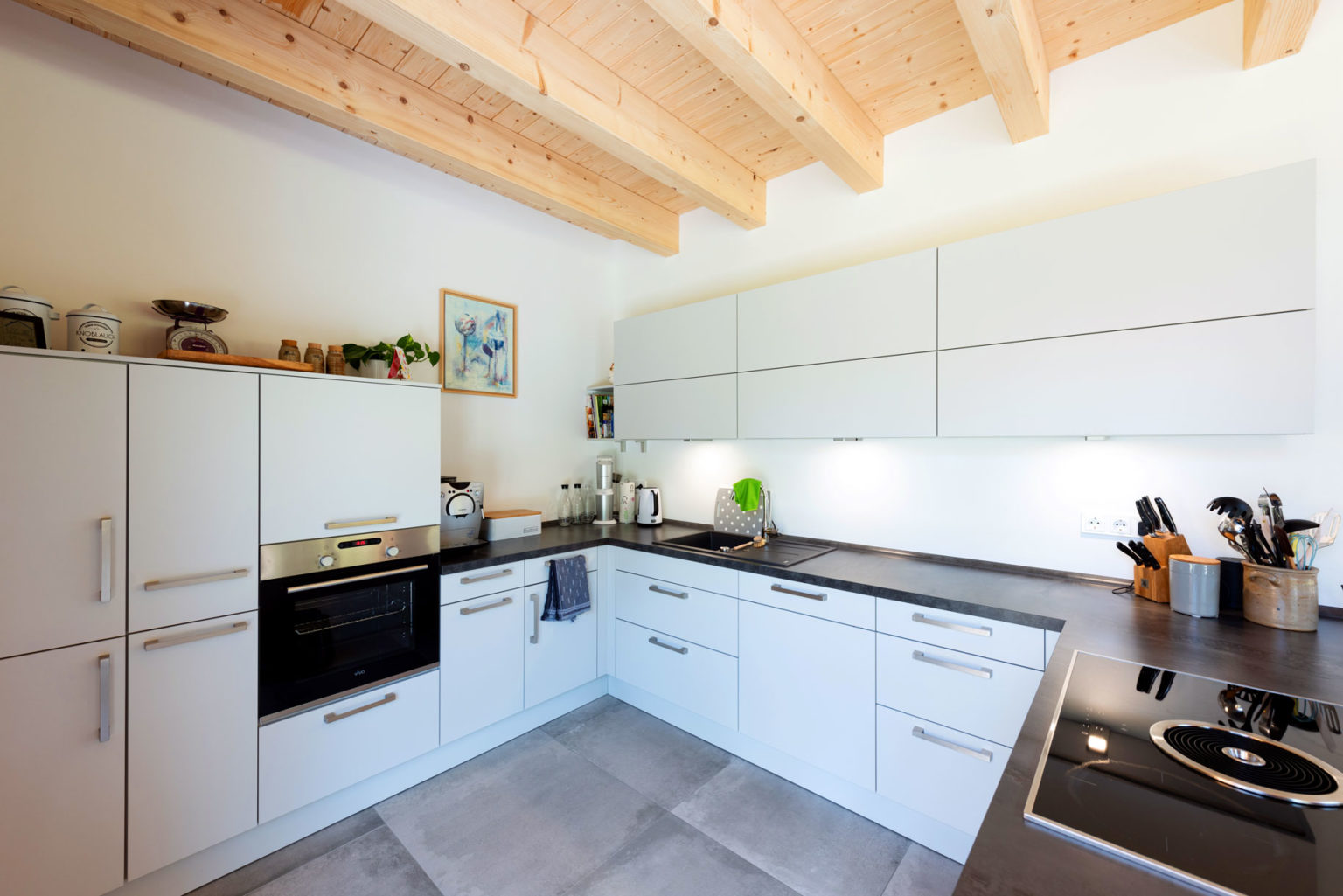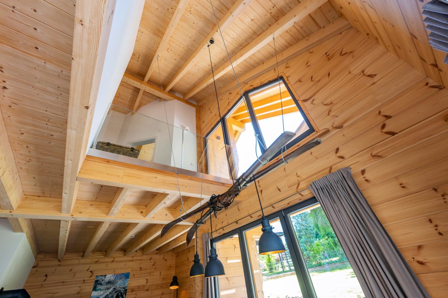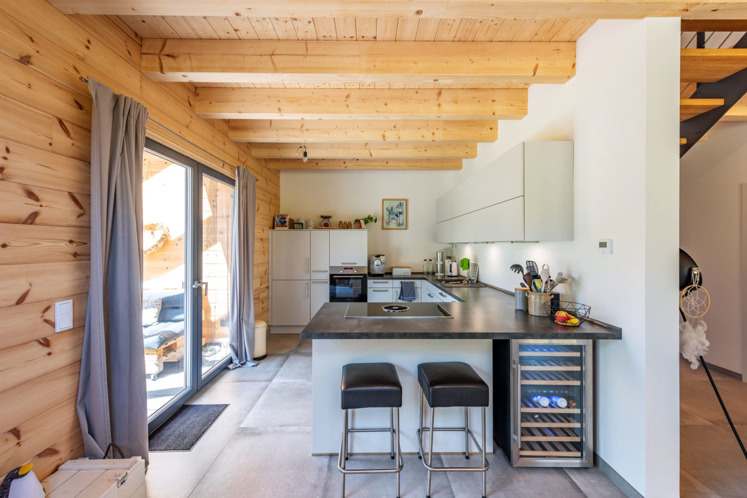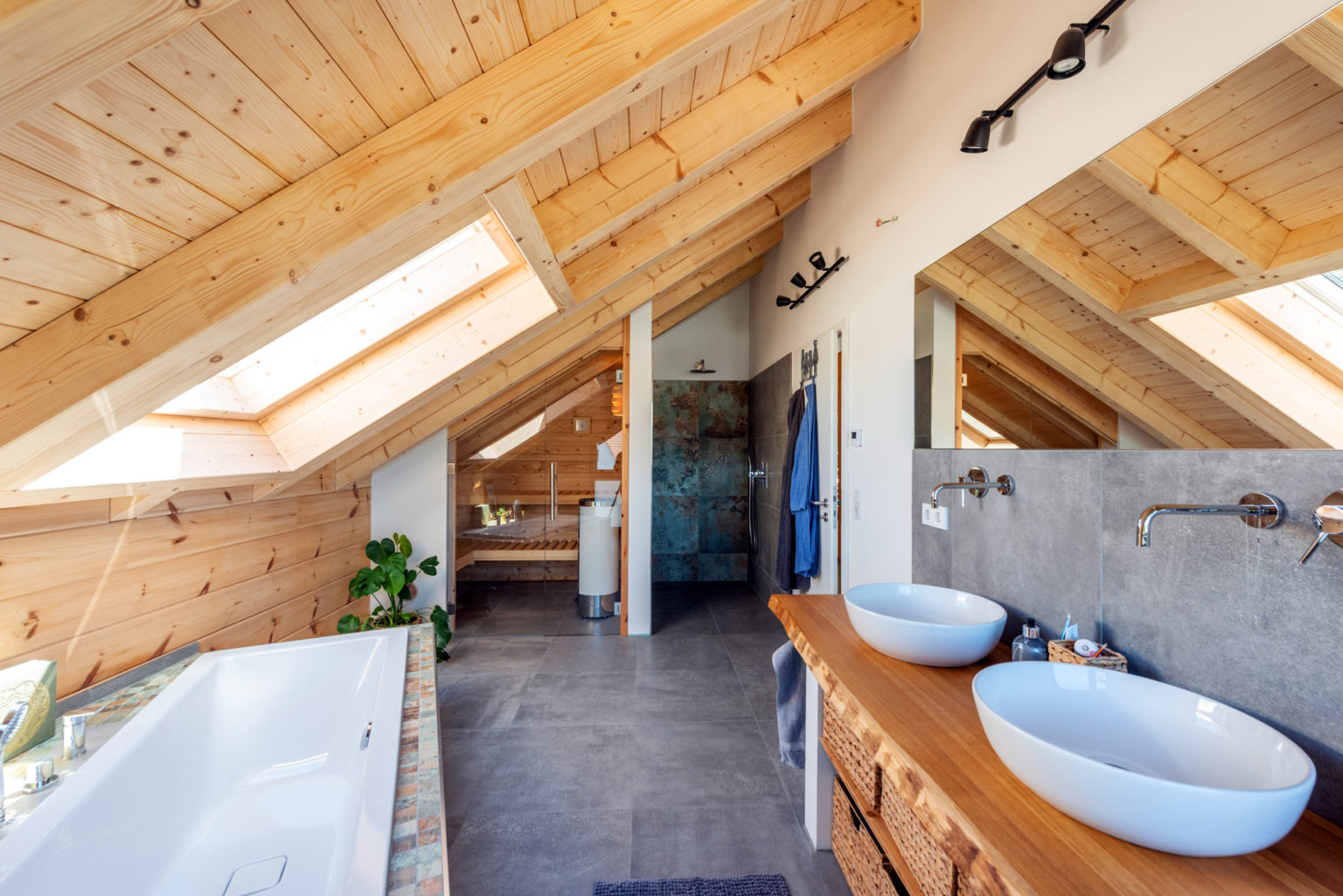 Abgesehen von der Galeriebrüstung sind Transparenz und Glas ein großes Thema in Holzhaus „Ulmenglück“. Viele, überwiegend bodentiefe Fenster wurden eingebaut um so viel natürliches Licht wie möglich hereinströmen zu lassen. Ergänzt werden sie von großen Dachfenstern in den Schrägen, damit auch das Dachgeschoss reichlich Tageslicht erhält. Die Fensterrahmen in schiefergrau entsprechen farblich der Eindeckung des Satteldachs (Tonziegel), der Haustüre und dem Garagentor sowie dem Balkongeländer. Harmonisch ergänzt werden die schiefergrauen Elemente von großen, grauen, flach verfugten Fliesenquadraten, die sich einheitlich auf sämtlichen Böden und auf manchen Wandteilen der Nassräume ausbreiten. Ebenso die graue Terrasse aus WPC sowie die silbergraue Außenpflasterung passen perfekt ins Bild. Die naturhellen Kiefernwände, Sichtbalkendecken und Sichtdachstuhl wurden mit UV-Schutz vor dem natürlichen Nachdunkeln bewahrt, und auch außen bleiben die Blockwände dank Wetterschutzlasur schön und vergrauen nicht. Die Außenlasur enthält zusätzlich weiße Pigmente, die das Holz besonders hell erstrahlen lassen. Im Hausinnern sorgen wiederum weiß tapezierte Trennwände (leichte Ständerbauweise) für Lichtreflektionen, die das Holzhaus zusätzlich aufhellen. Dank des vielen Massivholzes herrscht dennoch warme Behaglichkeit in allen Räumen. Der offensichtlichen Ästhetik steht die Funktionalität von Holzhaus „Ulmenglück“ in nichts nach, was sich in kurzen, sinnvollen Wegen und pflegeleichten Böden ausdrückt. Das Holzhaus selbst bedarf, im Gegensatz zu Holzhäusern manch anderer Hersteller, keiner Nachoptimierung, denn seine luftdichten Wände sind setzungsfrei.