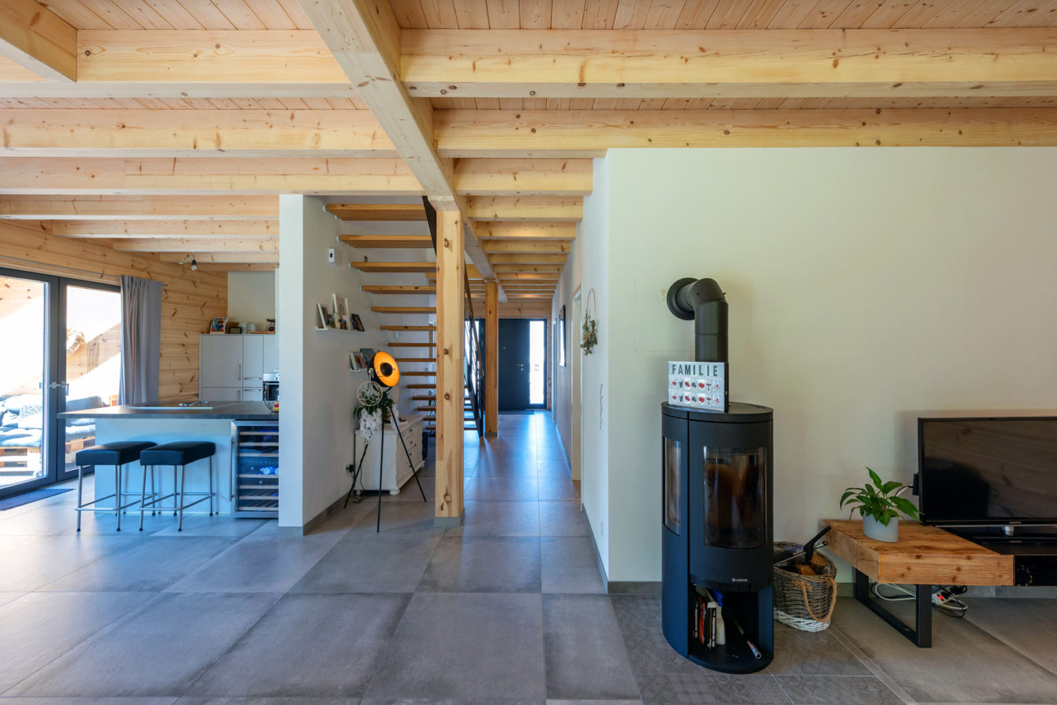 Dank der angebotenen Richtmeistermontage konnte das junge Baupaar viel Geld sparen und investierte im Gegenzug reichlich Eigenleistung. Ohne die Hilfe von Familie und Freunden wäre das nicht gegangen oder hätte der Hausbau und Ausbau zumindest viel länger gedauert. Unter der Regie des Fullwood-Richtmeisters wurde der Rohbau innerhalb von gerade mal drei Tagen montiert. Die 20cm dicken, einschaligen Blockwände wurden zuvor im Werk passgenau angefertigt und zur Baustelle geliefert, wo sie mit Hilfe eines Krans an Ort und Stelle gehievt wurden. Dem Aufstellen folgten dann Dacheindeckung, Innenausbau, Streichen und so weiter. Zur Wassererwärmung und zum Heizen (Fußbodenheizung) nutzt die Eigentümerfamilie solare Energie, Gas und einen dekorativen Kaminofen im Wohnbereich, der mit Holzscheiten betrieben wird.