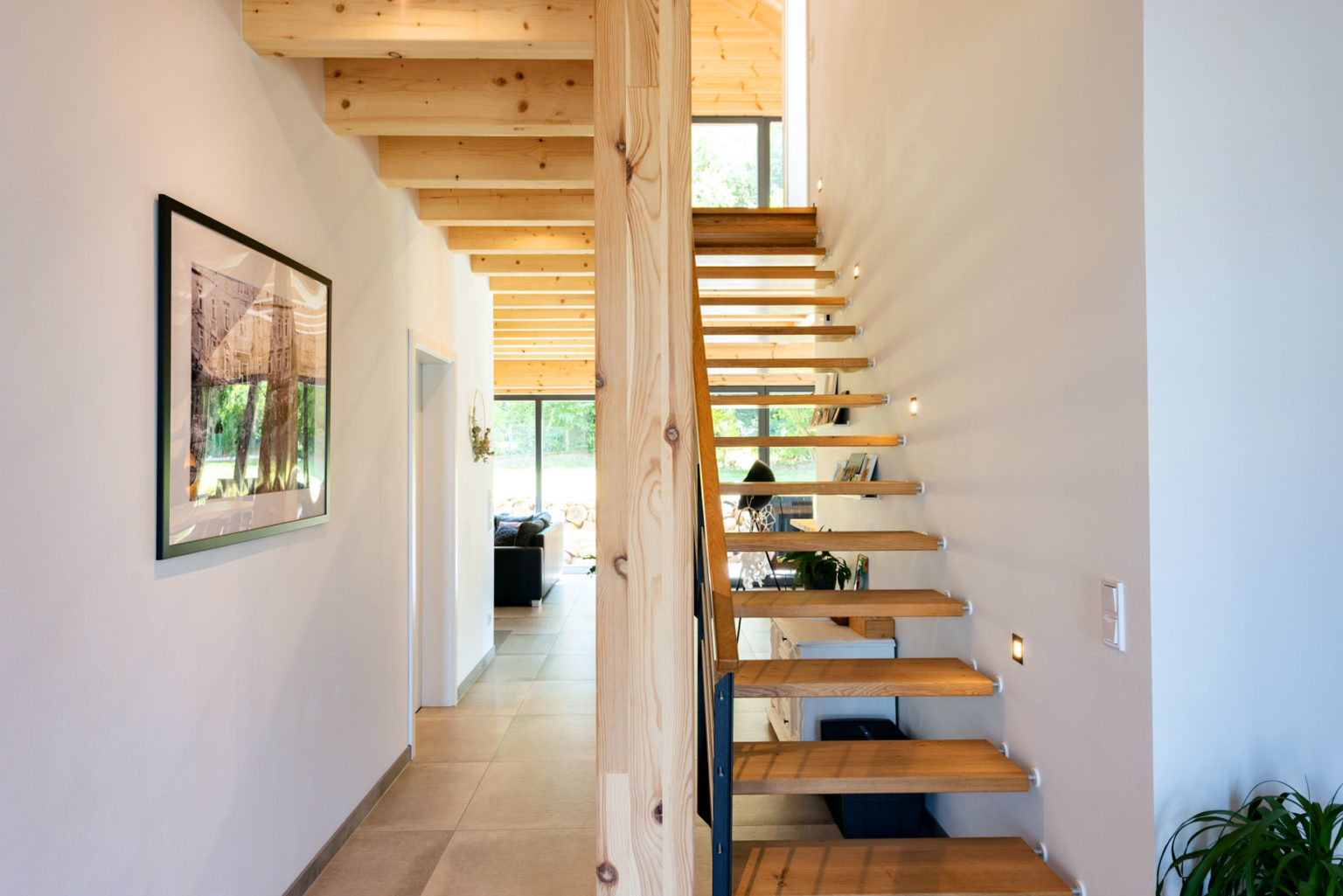 Bauhauselemente im Holzhaus mit kompaktem Grundriss für reibungslosen Wohnalltag