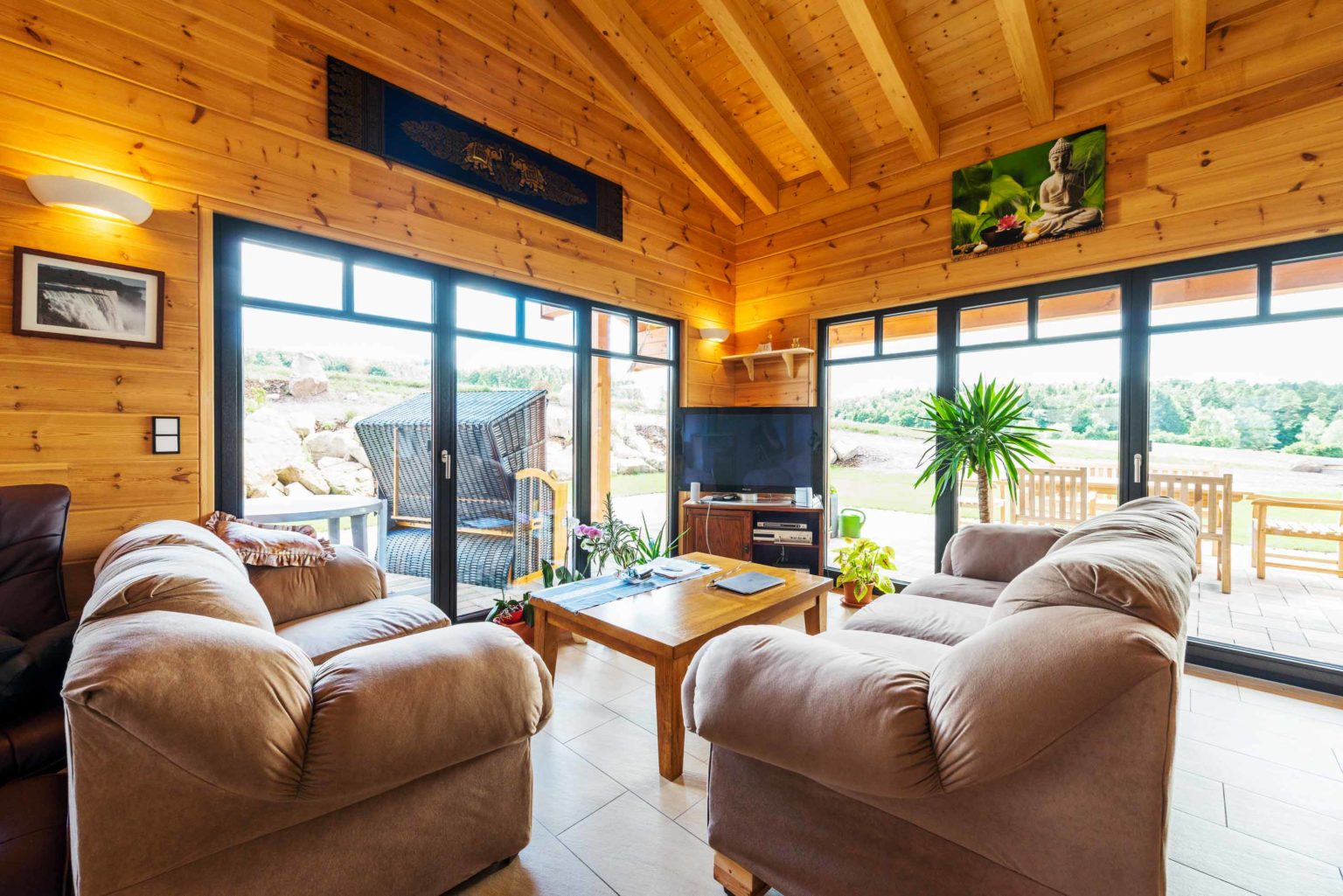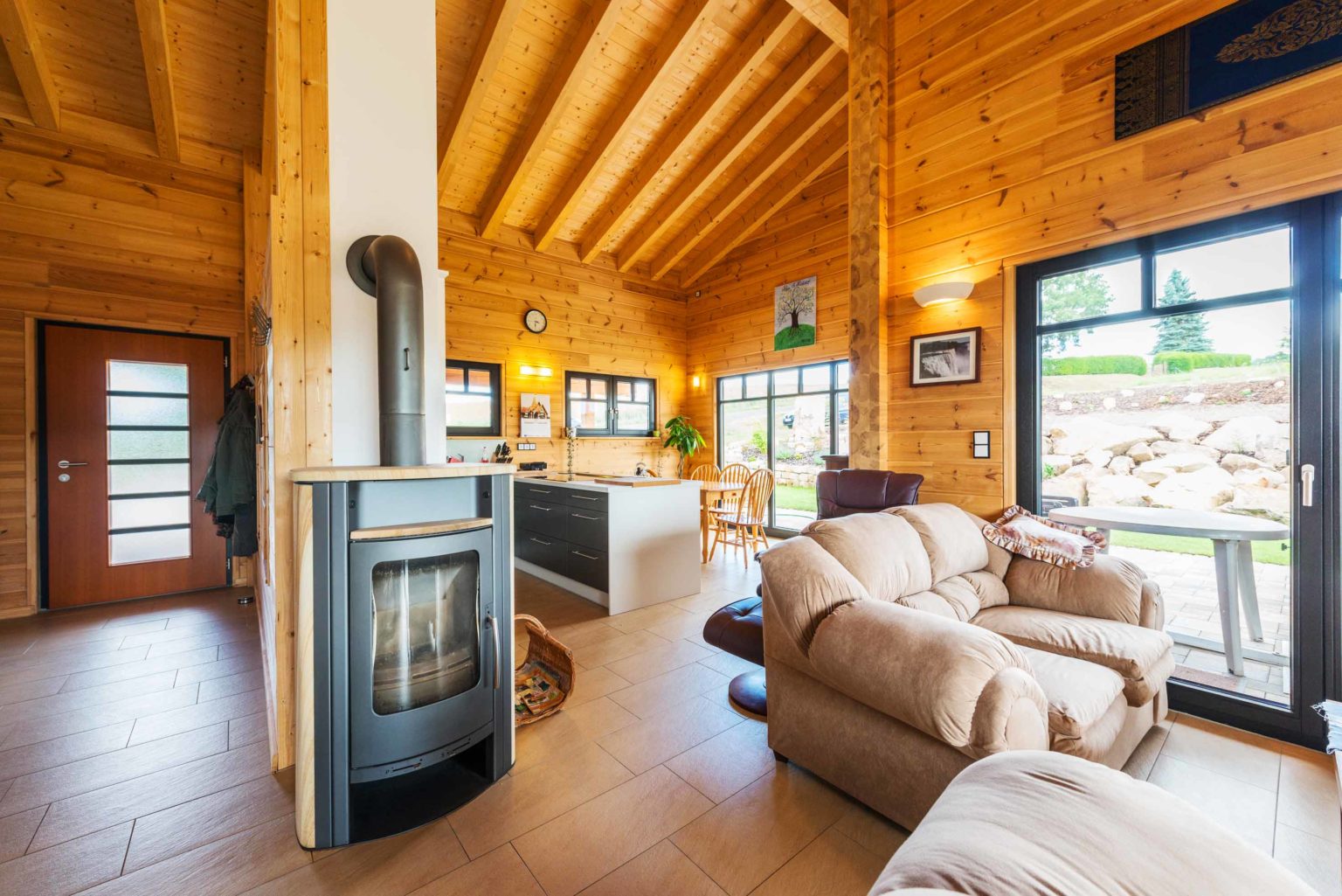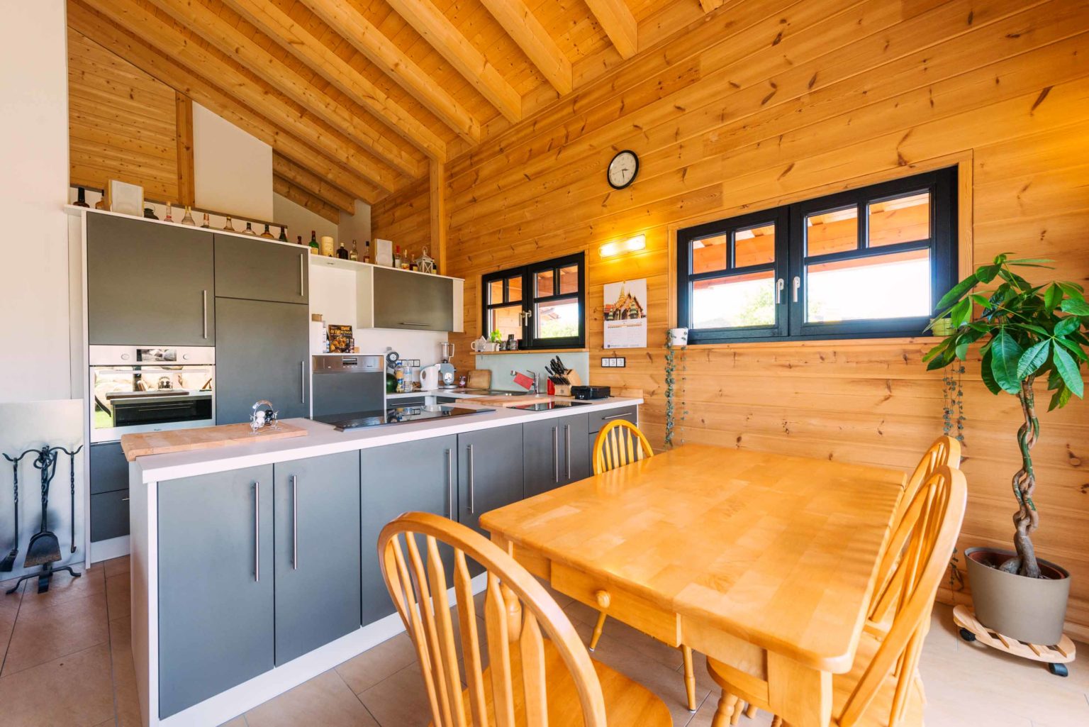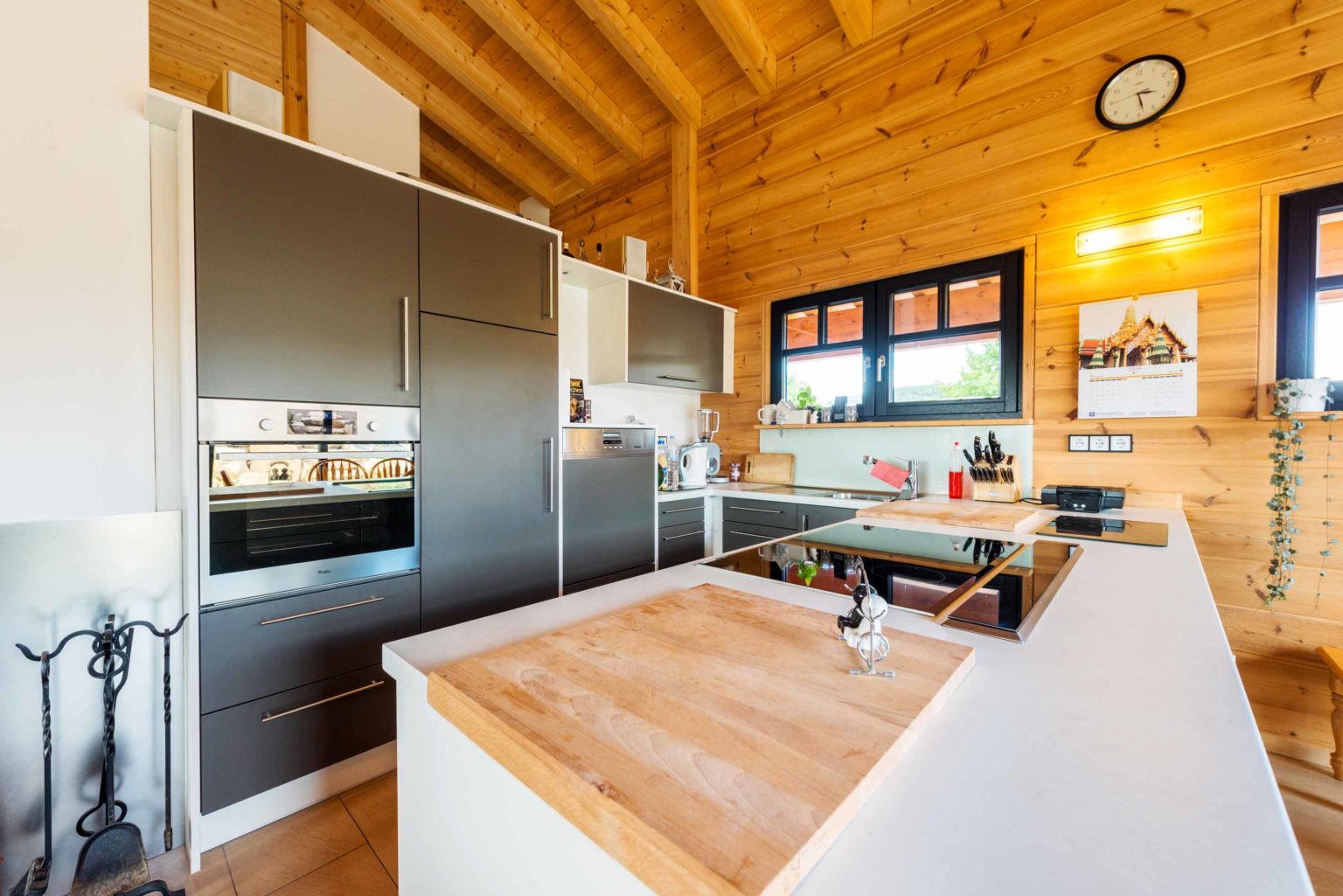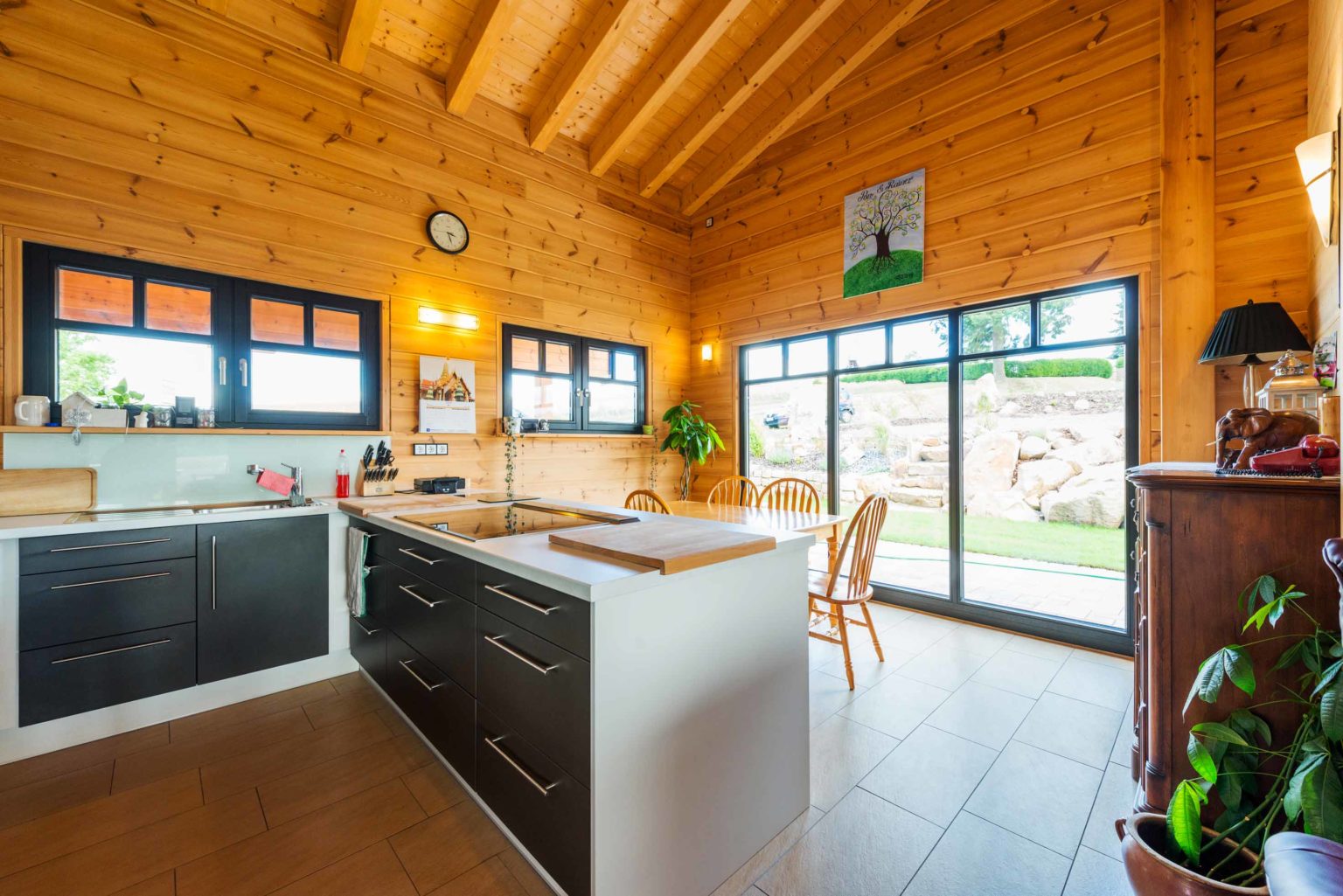 „In meinem Holzhaus ist es immer gemütlich und angenehm warm. Meine Frau und ich fühlen uns rundum wohl darin“, beschreibt Rainer Kirmes das Wohlfühlambiente seines massiven Holzhauses. Tatsächlich ist die gefühlte Temperatur in Massivholzhäusern nachweislich höher als beispielsweise in Steinhäusern. Aber die 20 cm dicken Polarkiefernwände, die Fullwood in Fertigbauweise produziert, sind auch absolut winddicht und dämmen deutlich besser, als ihr U-Wert vermuten ließe. Ein gutes Beispiel für die häufige Widersprüchlichkeit von Theorie und Praxis! Außerdem sind die robusten Wände setzungsfrei, wodurch der Hausherr nichts mit Wartungsarbeiten oder Rissen zu tun hat. Er heizt sein Holzhaus mit einem wasserführenden Kaminofen und mit einer Luft-Wärmepumpe. „Den Ofen bezeichnet meine aus Thailand stammende Frau als „ihren besten Freund“. Die warme Luft, die er erzeugt, steigt nach oben, weshalb ich am Firstbalken einen Ventilator montiert habe. So wird die warme Luft oben durchgewirbelt und verteilt sich dann im gesamten Wohnbereich, auch in Bodennähe“, weiß Rainer Kirmes. Als echter Holzhaus Fan hat er sich natürlich für eine offene Sichtbalkendecke entschieden: Eindrucksvoll überspannt sie die Räume. „Meine Entscheidung mit Fullwood zu bauen war genau richtig! Durch die hervorragende Qualität ist das Holzhaus sehr wertbeständig und langlebig, eine gute Investition also. Aber noch wichtiger ist, dass wir uns jeden Tag über unser traumhaftes Zuhause freuen und liebend gern darin wohnen!“, schwärmt Rainer Kirmes.