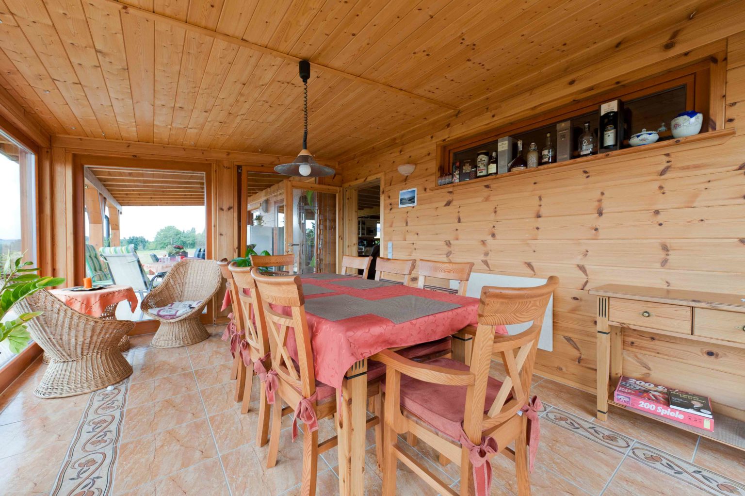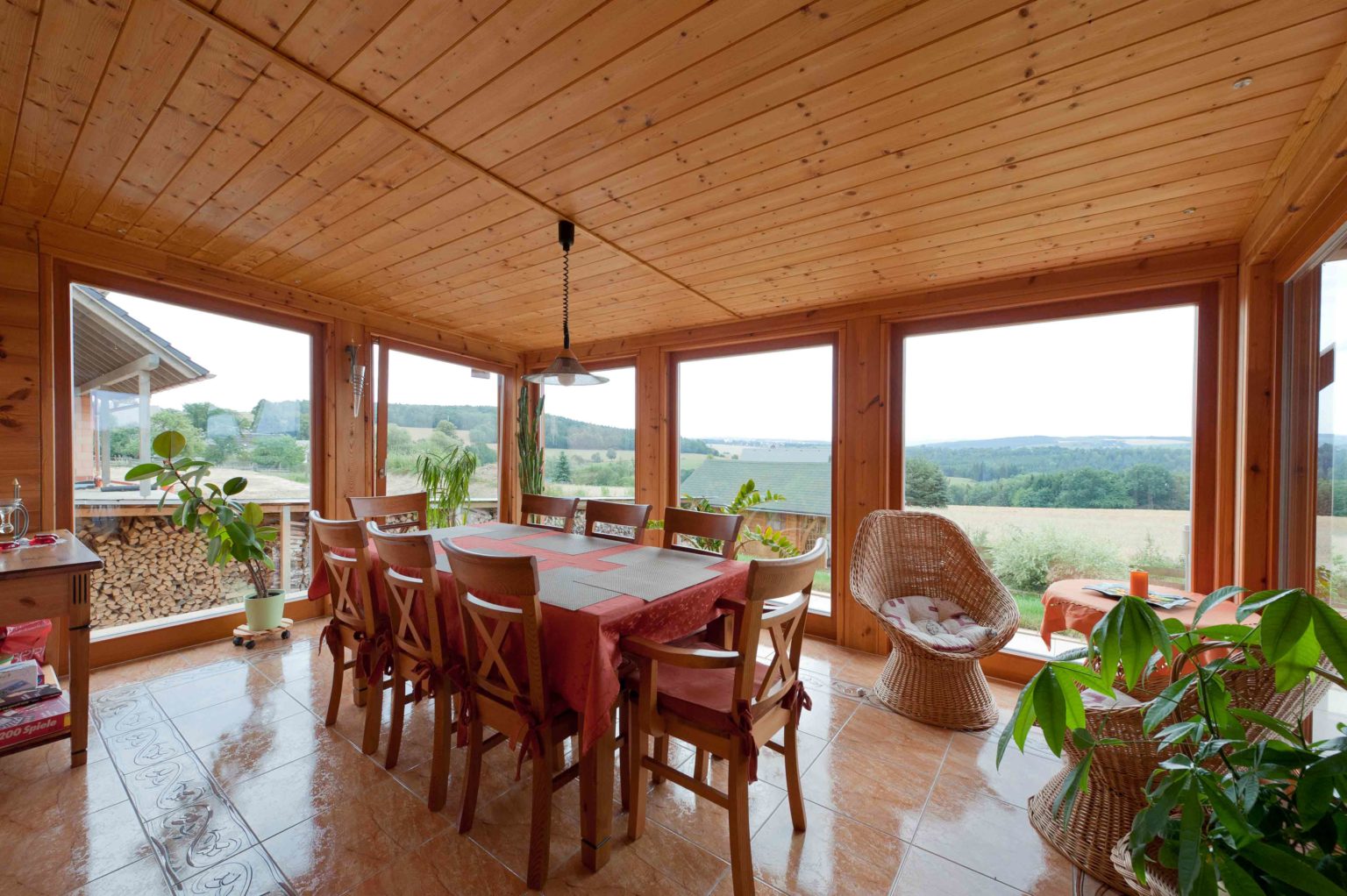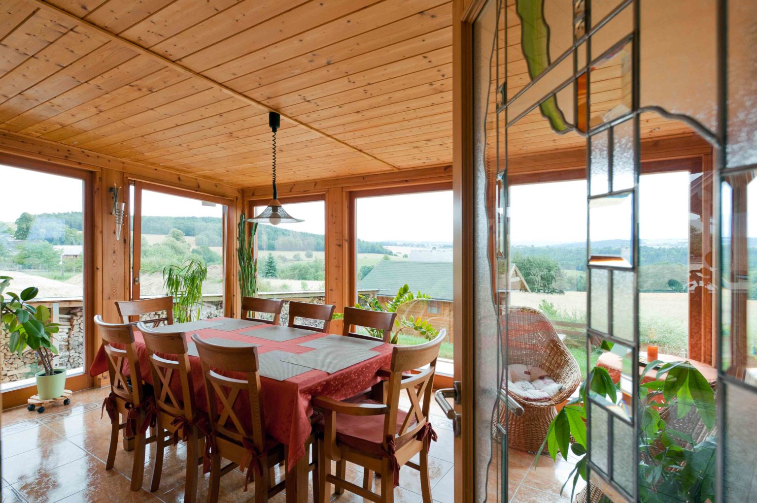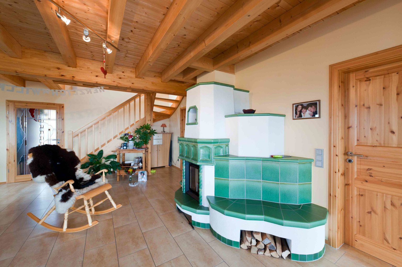 In nur drei Tagen montierten die Handwerker des Holzhaus Herstellers die im Werk vorgefertigten Wände auf die Bodenplatte, inklusive Dachstuhl. Der Innenausbau dauerte gerade mal acht Wochen und nach insgesamt dreieinhalb Monaten konnten die Eigentümer schon in ihr fertiges Holzhaus einziehen. In der Vergangenheit hatte der Hausherr gute Erfahrung mit seinem Holzhaus an der Ostsee gehabt, und wusste nun ganz genau, was er wollte. Mit dem fast fertigen Hauskonzept in der Tasche besuchte er viele verschiedene Holzhaushersteller und blieb letztlich bei Fullwood hängen. „Deren Holzhäuser sind uns bereits in den Bauzeitschriften immer positiv aufgefallen und als wir von der garantierten Setzungsfreiheit der Fertigwände erfuhren, war die Sache klar: Wir bauen mit Fullwood.“, erzählt Petra Mattausch. Die Vorgaben der Bauherren hat der Holzhaus-Spezialist gerne und gekonnt umgesetzt. Beheizt wird Holzhaus „Vogtlandblick“ mit einem Kachelofen, der mittels Wasserpufferspeicher auch die Fußbodenheizung im Erdgeschoss versorgt. Die solare Warmwasserbereitungsanlage auf dem Dach liefert ebenfalls Heizenergie. Die massiven, 20 cm starken Kiefernwände dämmen so gut, so dass die Hausbewohner kaum heizen brauchen – auch der sinnvoll und korrekt genutzte Wintergarten „hilft“ bei der Wärmegewinnung.