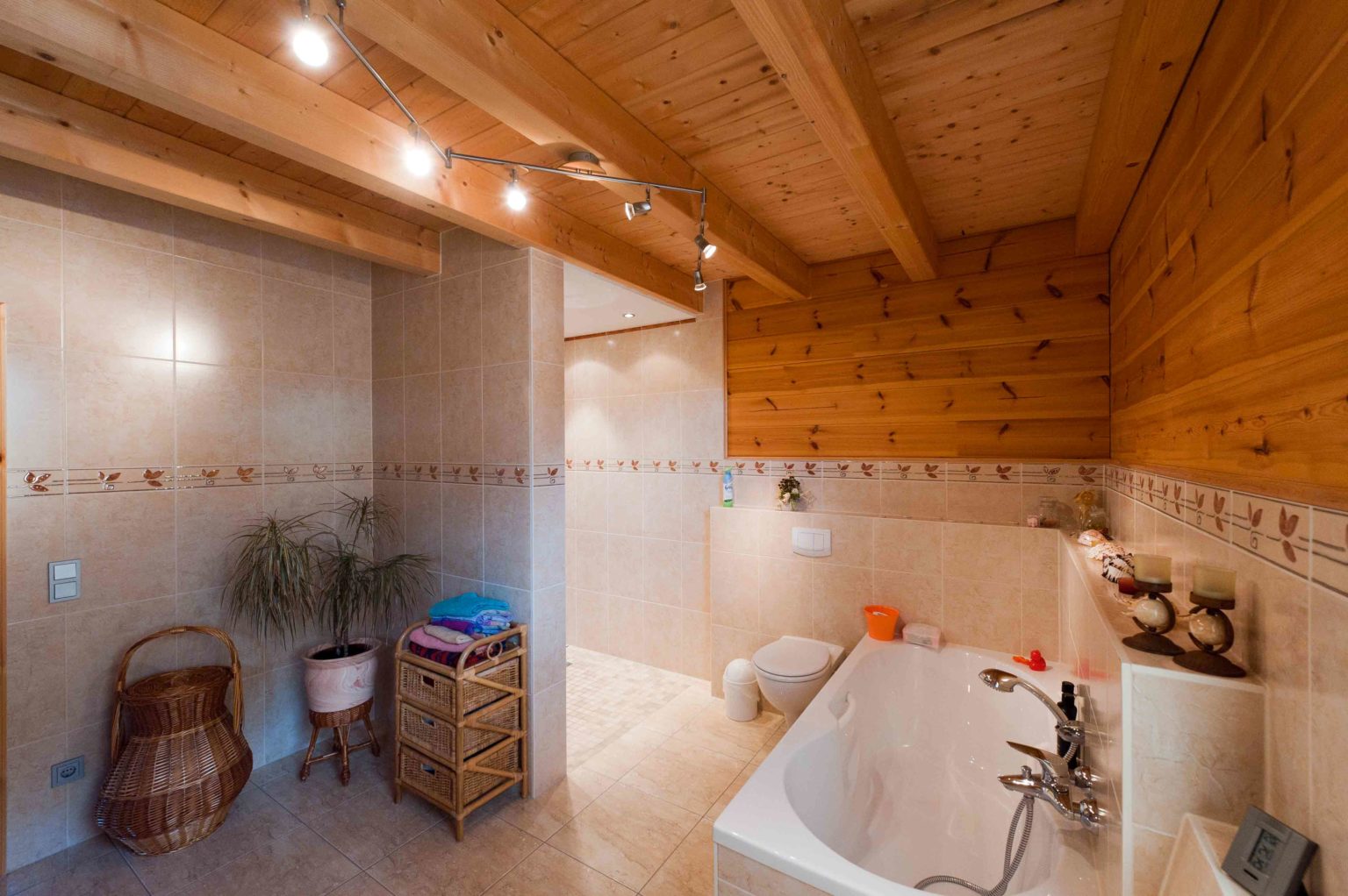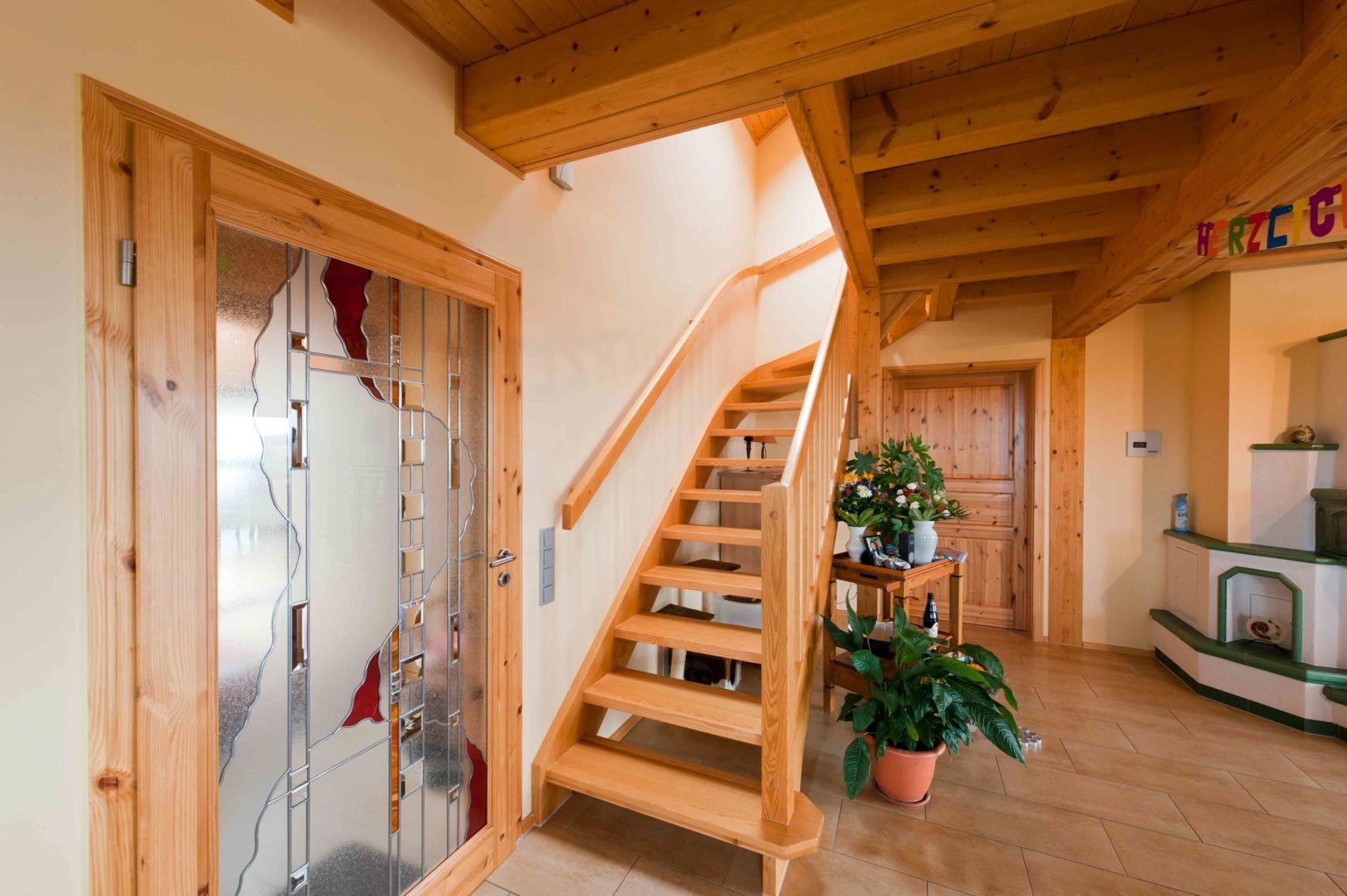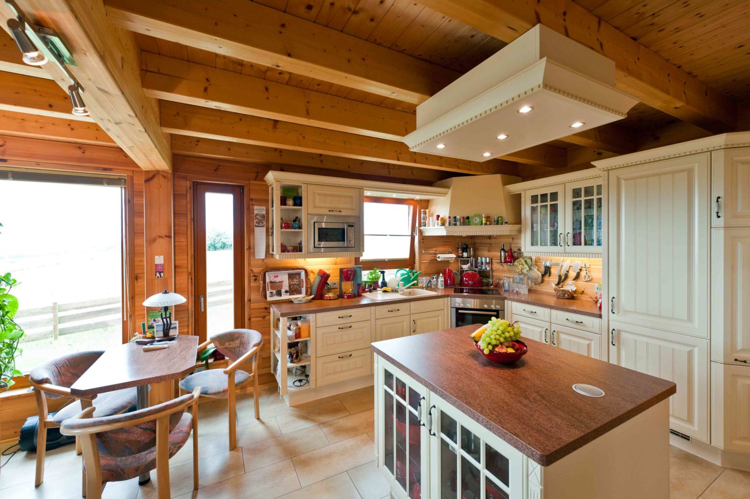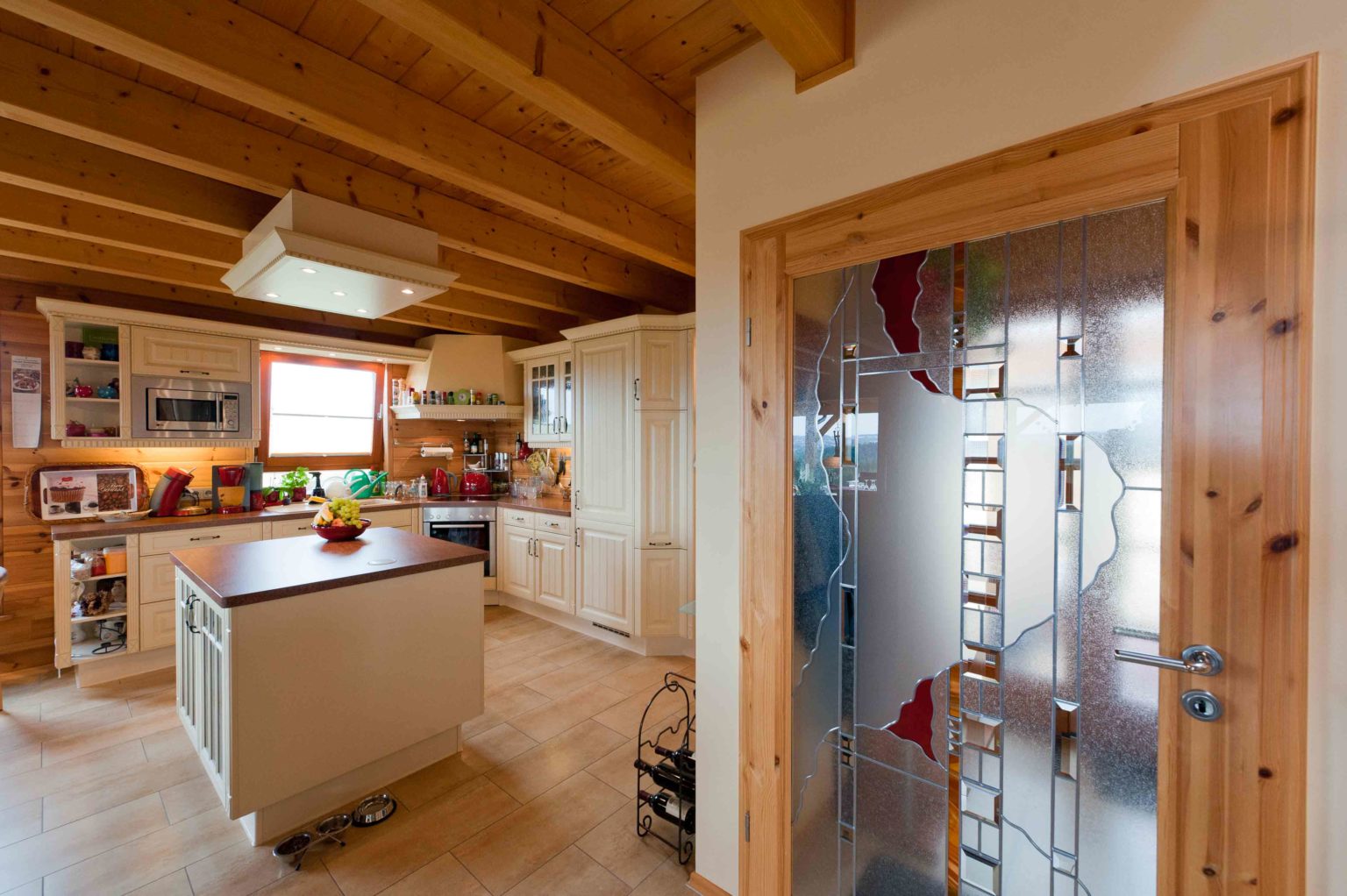 Das Erdgeschoss beherbergt einen großzügigen, offenen Wohn-, Ess- und Kochbereich, den man durch einen abgeschlossenen Windfang betritt. Ein kleiner Technikraum ist ebenso vom Windfang zu erreichen. Die Zugänge zum Wintergarten, zum Schlafzimmer und zum Wohnbad befinden sich im Wohnbereich, von der Küche gelangt man in einen separaten Hauswirtschafts- und Vorratsraum. Schlafzimmer und Bad sind durch eine Tür verbunden. Alle Türen im Erdgeschoss sind – mit Blick aufs Alter - extra breit und somit behindertengerecht. Vom Wohnbereich führt eine Holztreppe ins ausgebaute Dachgeschoss, wo man von einer Diele aus Zutritt zum sehr geräumigen Arbeitszimmer sowie in das Zimmer der Tochter mit eigenem, angeschlossenem Bad hat. Ein warmer Korkboden schmeichelt hier den Füßen, während unten leicht zu pflegende Bodenfliesen bei Bedarf von der Fußbodenheizung erwärmt werden. Der Warmluftschacht in der Kaminwand wärmt das Obergeschoss, im Bad verläuft sogar ein separates Rohr, durch das die warme Kaminluft nach außen strömt. Innen sind die tragenden Außenwände nur geölt und nicht mit UV-Schutz behandelt, denn ein Nachdunkeln des Holzes ist erwünscht. Die Trennwände, welche aus Ständerwerk bestehen, sind hell gestrichen. „Wir haben es hier auch bei minus 25 Grad Celsius Außentemperatur warm!“, freut sich die Dame des Hauses. Nachweislich fühlen sich von Holzwänden umgebene Menschen schon bei 2-3 Grad niedrigerer Raumtemperatur wohl, verglichen mit Wänden anderer Bauweisen. Auch so kann man Heizenergie sparen. Das Ehepaar resummiert unisono –