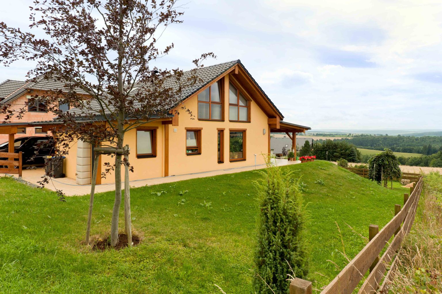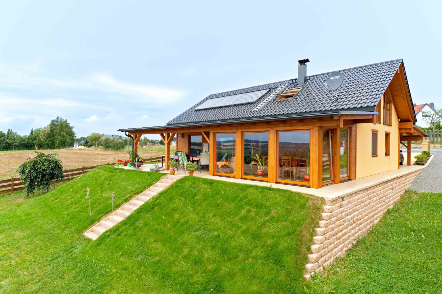 Die nach Norden ausgerichtete Hauseingangsseite und die nach Süden ausgerichtete Gartenseite bekamen ein weit auskragendes Verandadach mit minimaler Neigung, das den Blick auf die unverkleideten Massivholzwände einschränkt. Darunter befindet sich an der Straßenseite auch der Carport und an der Gartenseite ein großflächig verglaster Wintergarten sowie ein geschützter Freisitz. Das massive Holzhaus wurde im Außenbereich mit einem Vergrauungsschutzanstrich im Farbton „Kiefer“ versehen, zu dem das warme, helle Gelb der verputzten Wände und die Terrassenfliesen aus sandfarbenem Natursteinen wunderbar harmonieren. Die Terrasse verläuft ums gesamte Holzhaus und gewährleistet somit Barrierefreiheit nicht nur im Innen- sondern ebenso im Außenbereich. „Das Baugrundstück habe ich zufällig entdeckt und war sofort angetan von dem herrlichen, unverbaubaren Weitblick über das hügelige Land und den grenzenlos erscheinenden Himmel.“, schwärmt Uwe Mattausch. Wegen der Hanglage, und weil man keinen Keller wollte, ließen er und seine Frau Petra den Bauplatz mit Schotter aufschütten. Die entstandene Ebene wird zum abfallenden Garten von einer Mauer aus dem gleichen Naturstein, aus dem die Terrassenfliesen bestehen, gestützt und vom überdachten Freisitz führt eine schmale Treppe aus ebendiesem Material in den Garten hinunter.