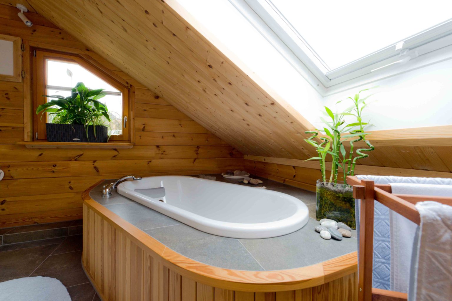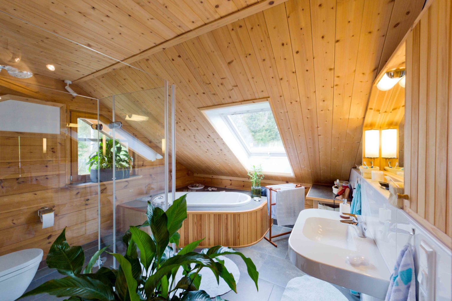 Holzhaus „Wahnbachtal“ besitzt einen schlichten, rechteckigen Grundriss, der ganz auf die Bedürfnisse der Hausbewohner zugeschnitten ist. Beim Eintreten gelangt man in eine kleine Diele, von der rechter Hand zwei Türen ins Gäste-WC und in einen Abstellraum führen. Linker Hand, an der Wand zum Wohnzimmer, befindet sich die offene Geschosstreppe. Der Clou der Wand ist ein über die gesamte Länge verlaufendes Lichtband aus Fensterglas, welches zusätzliches Licht vom hellen Dachgeschoss in die Sofaecke lässt. Die verschiebbaren Glasflächen lassen sich zudem öffnen, damit die üppige Strahlungswärme vom Kachelofen – er befindet sich im Wohnbereich - schnell hinauf ins Dachgeschoss gelangen kann. Denn oben wird nur das Bad bei Bedarf mit einer Fußbodenheizung gewärmt. Weiter geht es von der Diele geradeaus in den offenen Wohn-Ess-Kochbereich, der Durchgang dorthin ist ohne Tür. Rechter Hand befindet sich die offene Küche, wenige Schritte davon entfernt, im Zentrum des Wohnbereichs, steht der große Esstisch und dank der L-Form des Raumes befindet sich die Wohnzimmerecke im gemütlichen Bereich ganz links. Durch die vielen, teils bodentiefen Fenster ist der gesamte Wohnbereich lichtdurchflutet. „Wir empfangen gerne Gäste und deshalb war mir eine offene Küche sehr wichtig. So können immer alle miteinander kommunizieren.“, erklärt die Hausherrin. Beheizt wird Holzhaus „Wahnbachtal“ hauptsächlich mit dem modernen Kachelofen, der sich zwischen Sofaecke und Essbereich befindet. Nur wenn es allzu eisig ist, schaltet sich die Fußbodenheizung im Erdgeschoss ein, aber das kommt selten vor, da die Vollholzwände hervorragend dämmen. Ist das Wetter schön, lockt eine große, windgeschützte Terrasse aus dem Wohnbereich nach draußen. Der erklärte Lieblingsplatz des Ehepaares ist aber der kleine, idyllische Teich, an dessen Rande man wunderbar mit einem Gläschen Rotwein sitzen und die Beine ins Wasser baumeln lassen kann. Der Blick aufs eigene Holzhaus ist auch von außen schön! Im Dachgeschoss hat sich der Hausherr einen Arbeitsplatz auf der Galerie eingerichtet. Dort muss man aber aufpassen, nicht ins Träumen zu geraten, da der Weitblick nach draußen so schön ist. Auf der Dachterrasse, sie befindet sich auf der angebauten Garage, lässt es sich ebenfalls wunderbar pausieren. Von der Galerie gelangt man noch ins Schlafzimmer, in die Ankleide, ins Gästezimmer und ins Bad, einem hellen, harmonischen Ort, der Erholung und Entspannung verspricht.