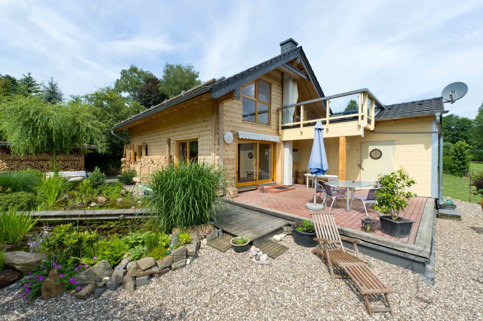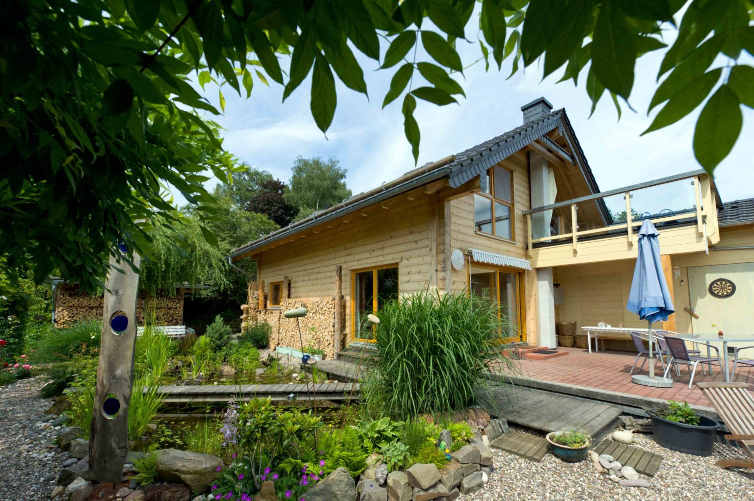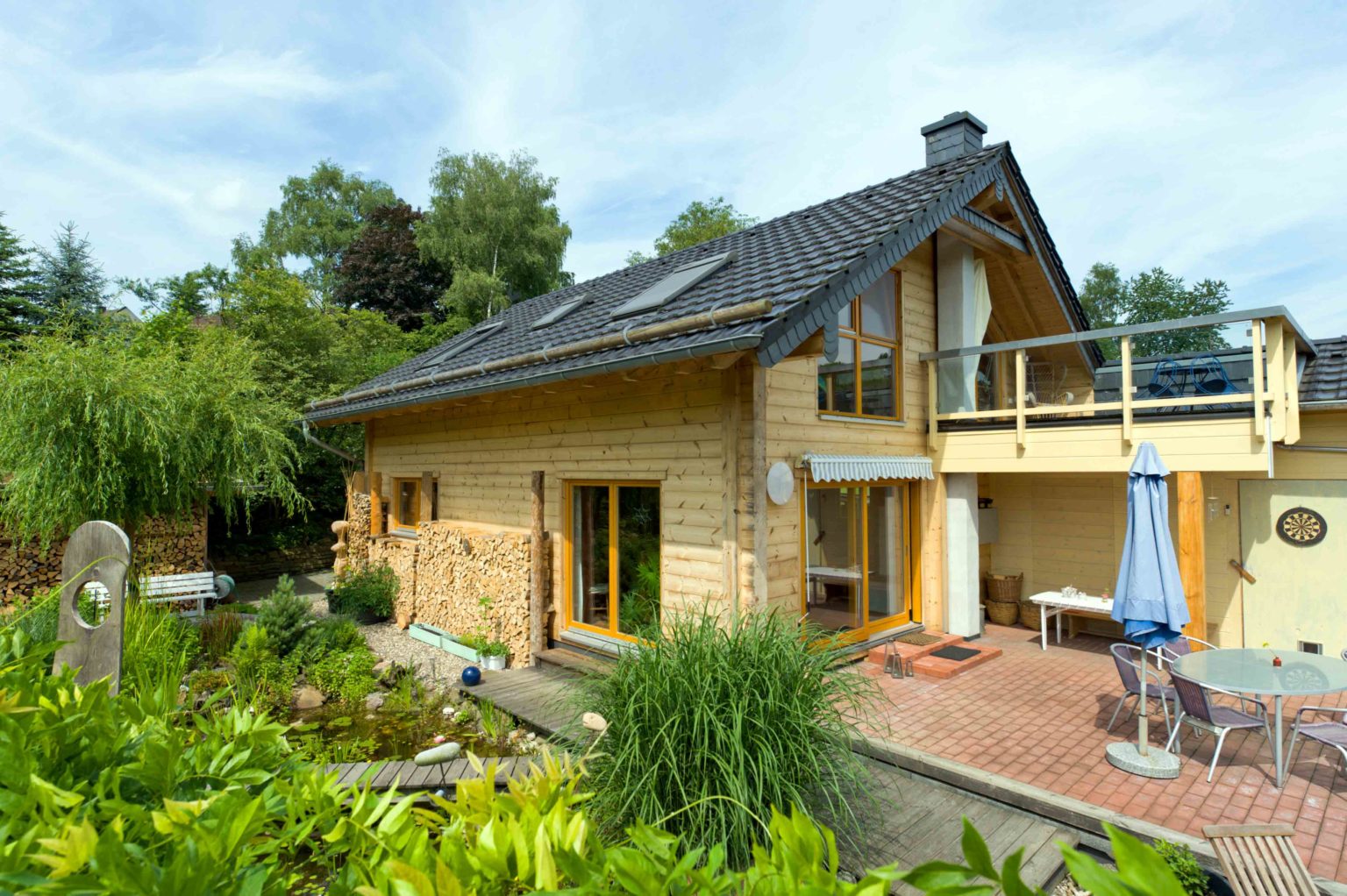 Die 20cm starken Außenwände von Holzhaus "Wahnbachtal" sind aus dem besonders widerstandsfähigen Holz Nordischer Kiefern gefertigt, im Erdgeschoss bedecken Fliesen aus Feinsteinzeug die Böden und im Dachgeschoss schmeicheln Eichendielen den Füßen. Die Geschosstreppe besteht aus Kiefer mit offenen Eichenstufen und etliche, größtenteils selbst gebaute Naturholzmöbel schmücken das Hausinnere. Nachdem der Entschluss zum Bau eines Holzhauses gefallen war, recherchierten die Bauinteressenten im Internet und in Bauzeitschriften nach Holzhaus Herstellern und besichtigten einige Musterhäuser, bis der passende Baupartner gefunden war. „Die Symbiose aus moderner Technik und alter Handwerkskunst hat mich beim Holzhaus-Spezialisten unserer Wahl besonders beeindruckt. Außerdem sind dessen Wände absolut winddicht und sogar setzungsfrei.“, beurteilt der Hausherr fachmännisch. Das alteingesessene Unternehmen fertigte die Wandelemente passgenau im Werk vor um sie dann termingetreu zur Baustelle zu liefern. Dort wurden sie in wenigen Tagen montiert. Man entschied sich für eine Vollmontage seitens Haushersteller und kaufte das Haus als sogenanntes „Ausbauhaus“. Das bedeutet, dass die Bauherren den Innenausbau in Eigenregie übernehmen. Die Elektro- und Sanitärarbeiten sowie das Verlegen der großen Fliesen im Erdgeschoss überließ der Hausherr Fachfirmen vor Ort, den Rest erledigte er aber lieber selbst. Ihm als erfahrenen Schreiner gingen die Ausbauarbeiten natürlich leicht von der Hand, aber auch seine handwerklich unerfahrene Frau konnte viel helfen. Später, beim Anlegen des paradiesischen Gartens, hatte sie dann wieder die Nase vorn.