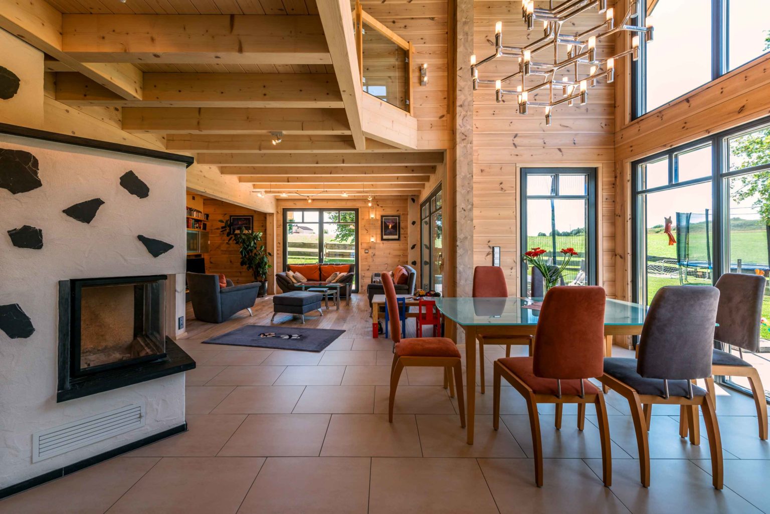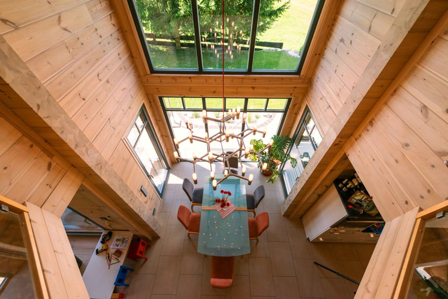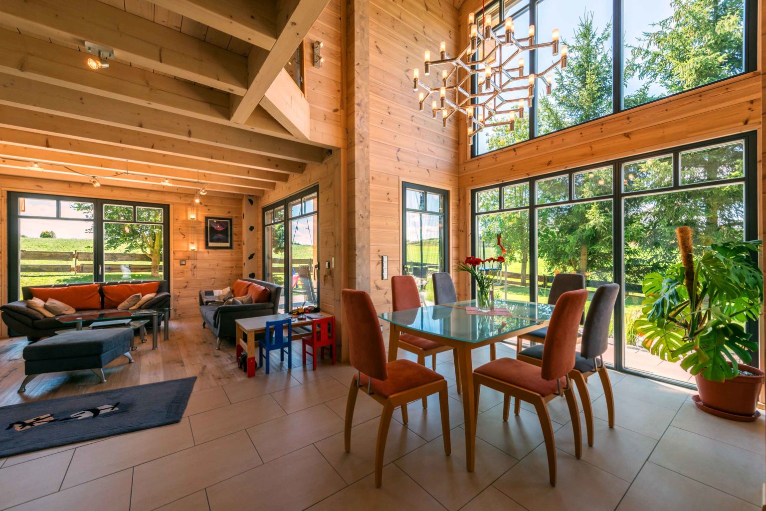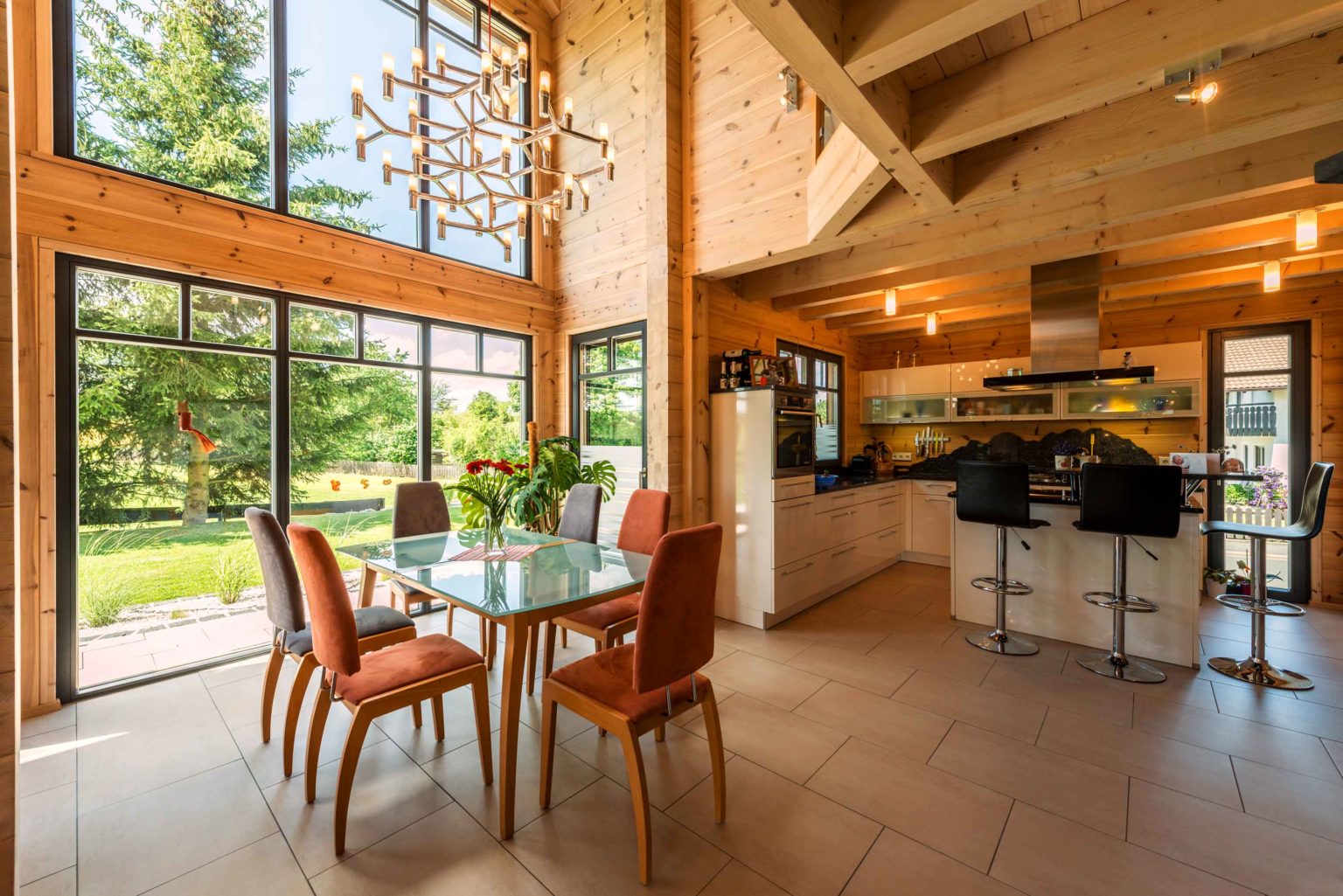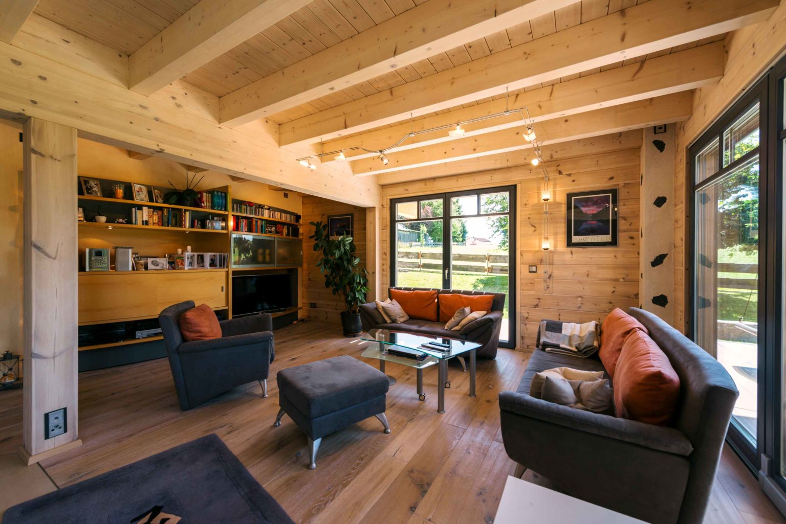 Das bodenständige und natürliche Material „Holz“ passt einfach zu dem Natur-, Berg- und Sportbegeistertem Ehepaar, und die sinnlich-warme Haptik und Optik sowie der zarte Duft von chemisch unbehandeltem Holz hat es den beiden von Anfang an angetan. „In unseren Winterurlauben in USA und Kanada haben wir uns viele Anregungen für's eigene Holzhaus geholt. Besonders als wir unsere Flitterwochen beim Heli-Skiing auf einer Lodge in British Columbia verbrachten, kamen uns viele Ideen fürs eigene Heim. Von rustikalen Rundbalken kamen wir zu Hause dann aber doch ab.“, erzählt Alexander Kolb. Zusammen mit seiner Frau recherchierte er im Internet nach Holzhaus-Herstellern und besuchte auch ein Musterhaus von Fullwood. „Nach fünf Minuten in dem Musterhaus stand schon fest, dass wir genauso bauen wollen.“, erinnert sich Stefanie Kolb. Die hellen, glatten Kiefernholzwände, die vielen großen Fensterflächen und die Kombination mit verputzten Trennwänden (Ständerbau) überzeugte das Ehepaar optisch sofort. Und nachdem sie über die Winddichtigkeit und Setzungsfreiheit der eckigen Wandkonstruktion aus massiven Blockbalken aufgeklärt wurden, überzeugte auch der technische Teil.
