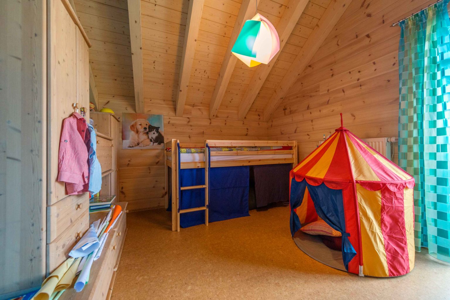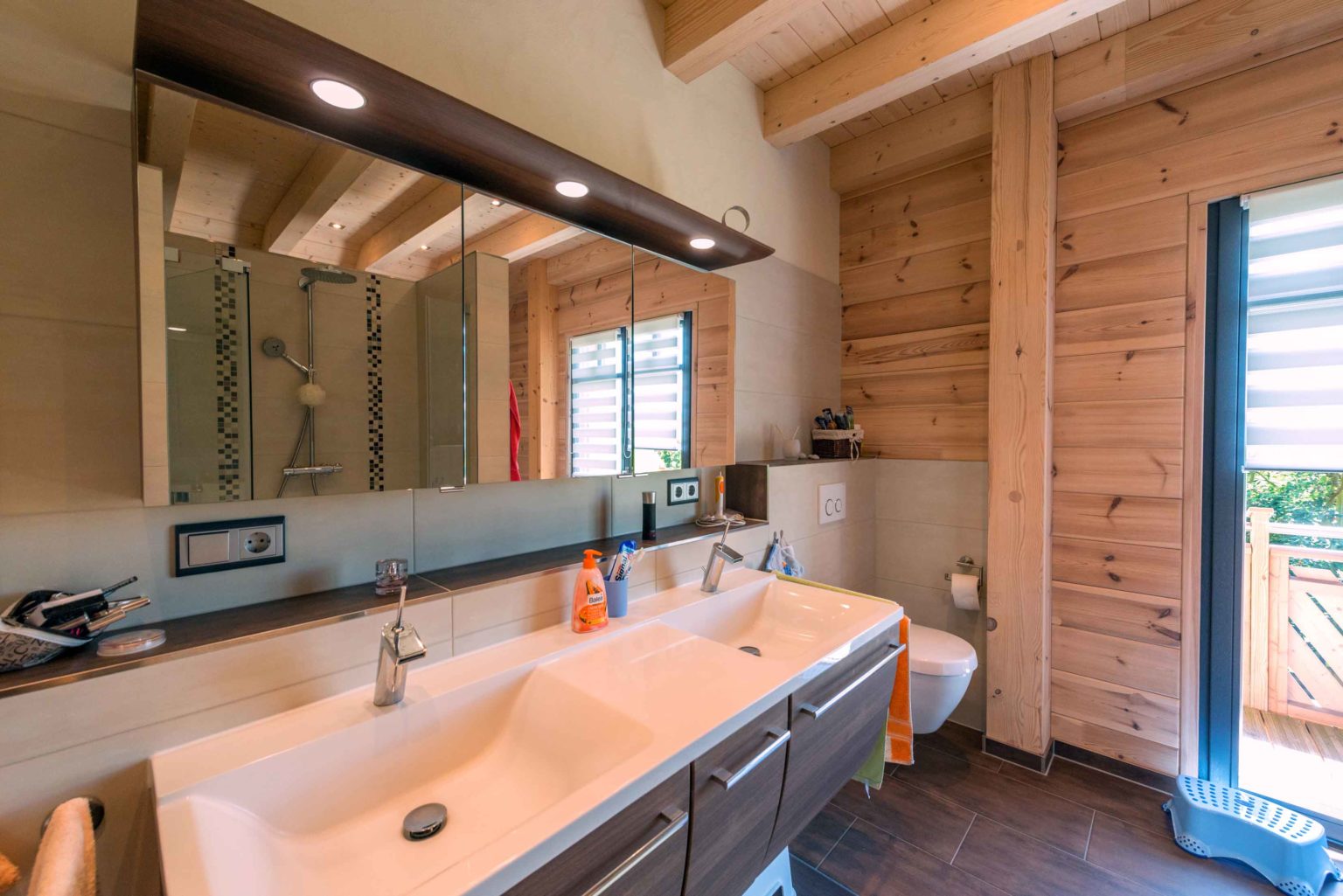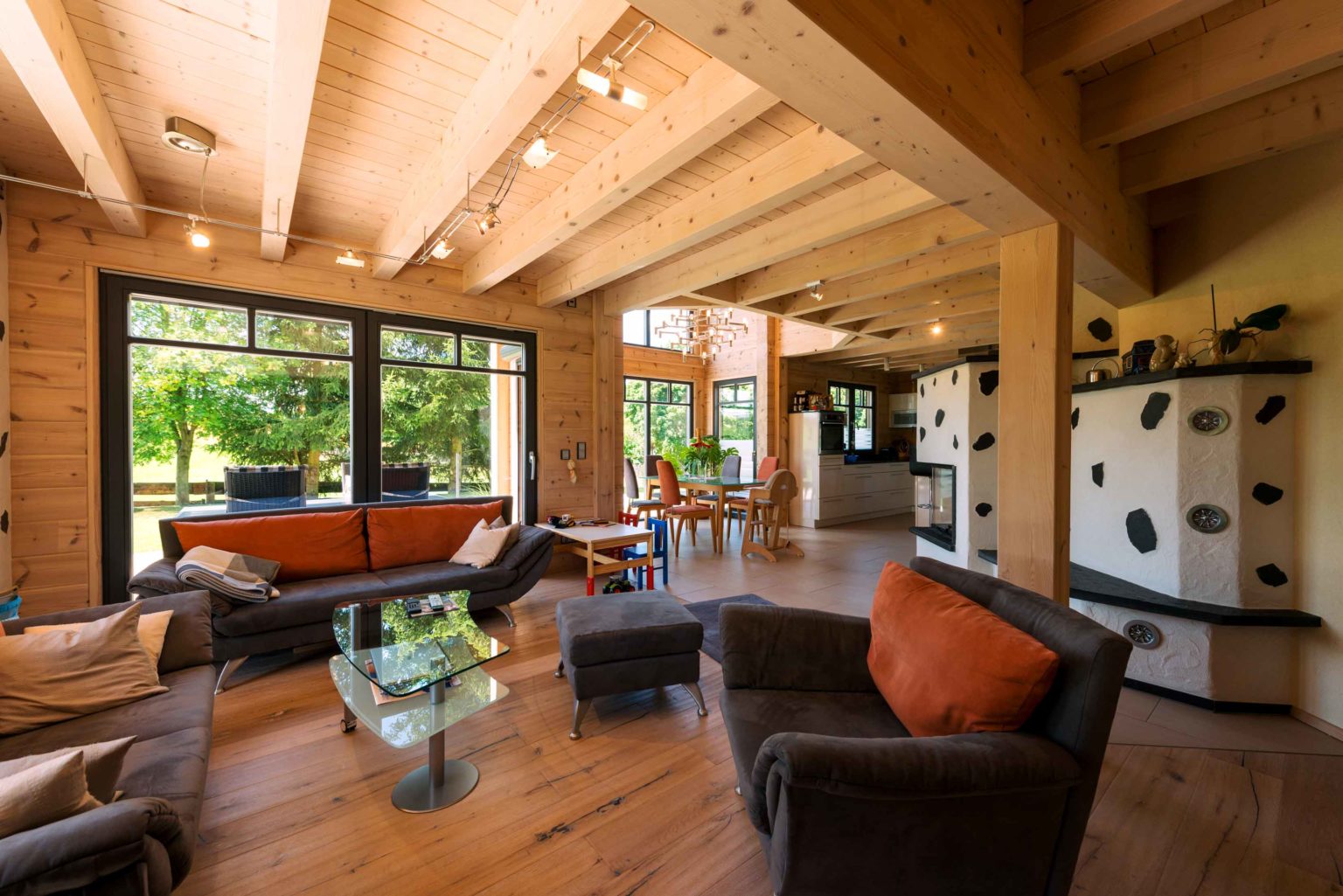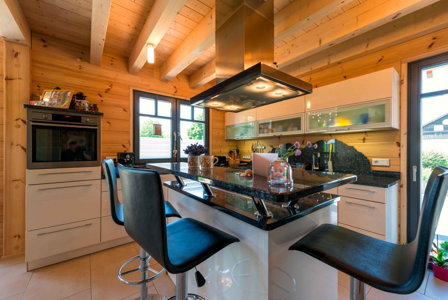 Da die Vollholzwände in wenigen Elementen im Werk des Holzhaus-Spezialisten „Fullwood“ vorgefertigt wurden, konnte die Wandmontage auf dem Bauplatz termingetreu, wetterunabhängig und in kurzer Zeit erfolgen. „Wir entschieden uns für eine Richtmeistermontage, bei der wir selbst, Verwandte und gute Freunde unser Holzhaus aufstellten. Dank des kompetenten und sehr engagierten Richtmeisters von Fullwood, klappte die Hausmontage problemlos. Er stand uns nicht nur mit Rat sondern hauptsächlich mit Tat absolut zuverlässig zur Seite.“, lobt der Hausherr. Mit dem Wetter hatten die Bauherren leider nicht immer Glück: Während des Kellerbaus und ab dem zweiten Bautag der Hausmontage regnete es viel, was einige Erschwernisse mit sich brachte. In der gesamten Bau- und Ausbauphase gab es einige wenige, im Nachhinein betrachtet vergleichsweise kleine Probleme, die sich letztlich alle in Wohlgefallen auflösten. „Die Badezimmerwand wurde eine Balkenlage zu hoch geliefert. Unser Richtmeister konnte den Fehler aber sofort vor Ort mit der Kreissäge beheben. Die Kombination von Computer gesteuerten Maschinen und realer man-power hat also gut geklappt.“ Den Innenausbau erledigten die Hauseigentümer komplett in Eigenregie, wieder mit Hilfe von handwerklich erfahrenen Verwandten und Freunden, die sich dafür zum Teil sogar ihren halben Jahresurlaub nahmen. „Besonders den Paten unseres jüngsten Sohnes sind wir unendlich dankbar für ihre großartige Hilfe!“, betont Stefanie Kolb. Insgesamt dauerte der Hausbau nur 10 Monate, den vorangehenden Aushub und Kellerbau nicht mit eingerechnet – obwohl alles in Eigenleistung (zum Teil auch mit der Hilfe von lokalen Fachhandwerksfirmen) gemacht wurde, und der Hausherr wochentags meist beruflich unterwegs sein musste. „Vieles blieb an meiner Frau hängen, besonders die Organisation – eine nicht zu unterschätzende Leistung!“, ergänzt der Hausherr.
