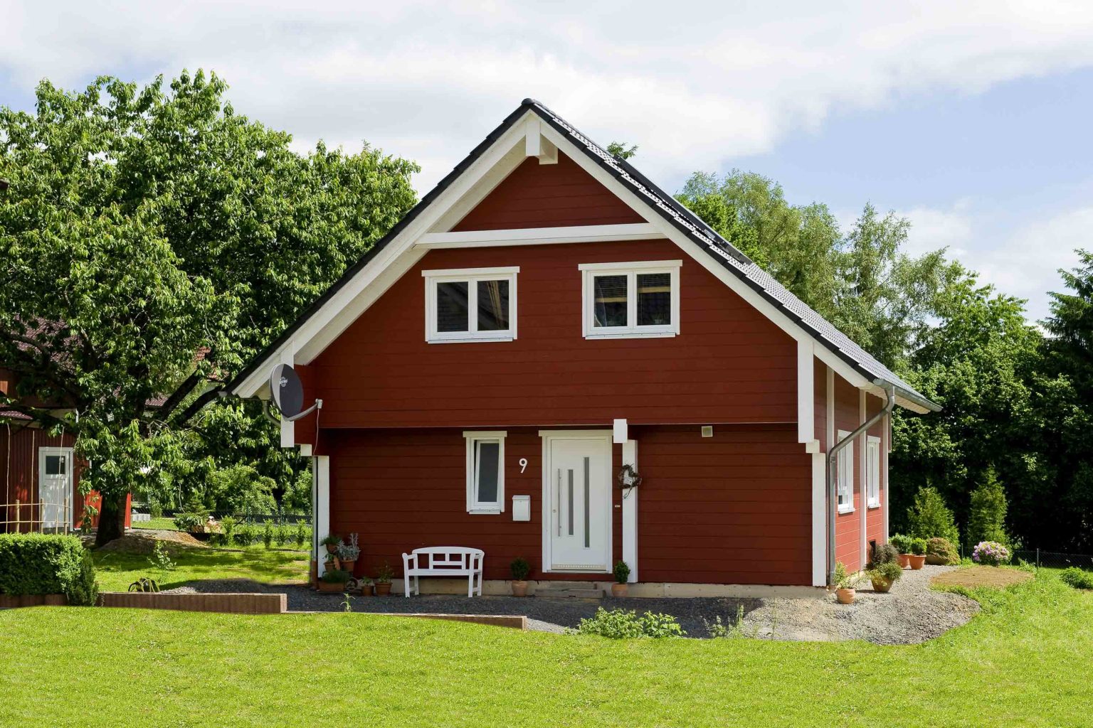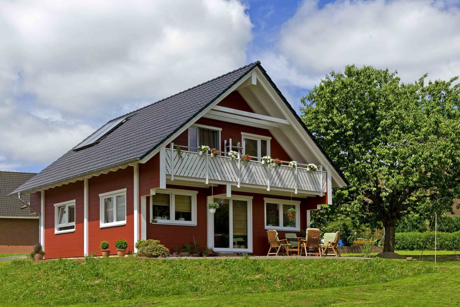 Die fröhliche, frische Optik von Holzhaus „Westerwald“, in warmen Ochsenblutrot und strahlendem Weiß gestrichen, erinnert an Urlaub in Skandinavien - Astrid Lindgren lässt grüßen! Während das Weiß von Fensterrahmen, Haustüre und Balkon den dunkelroten Anstrich der Vollholzwände schön zu Geltung bringt, lässt umgekehrt das dunkle Rot die weißen Elemente besonders strahlen. Eine perfekte, klassische Kombination, die nie aus der Mode kommt. Einen ungewöhnlichen Grundriss oder auffällige Erker und Gauben benötigt das kompakte, quadratische Holzhaus nicht, um den benachbarten Gebäuden die Schau zu stehlen.