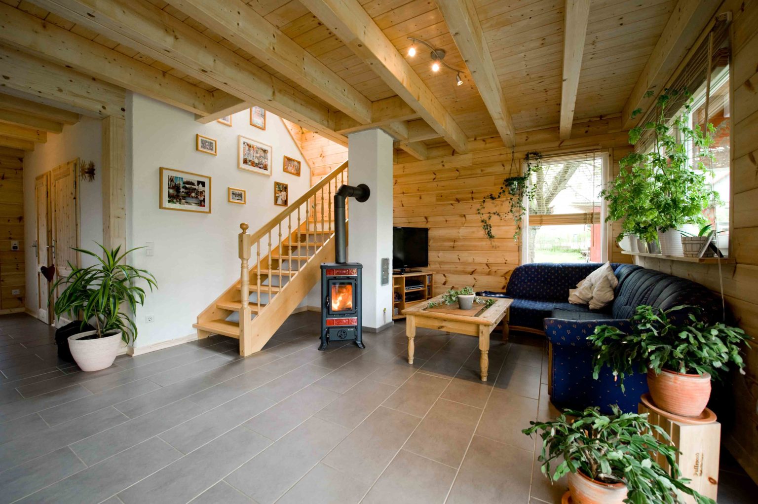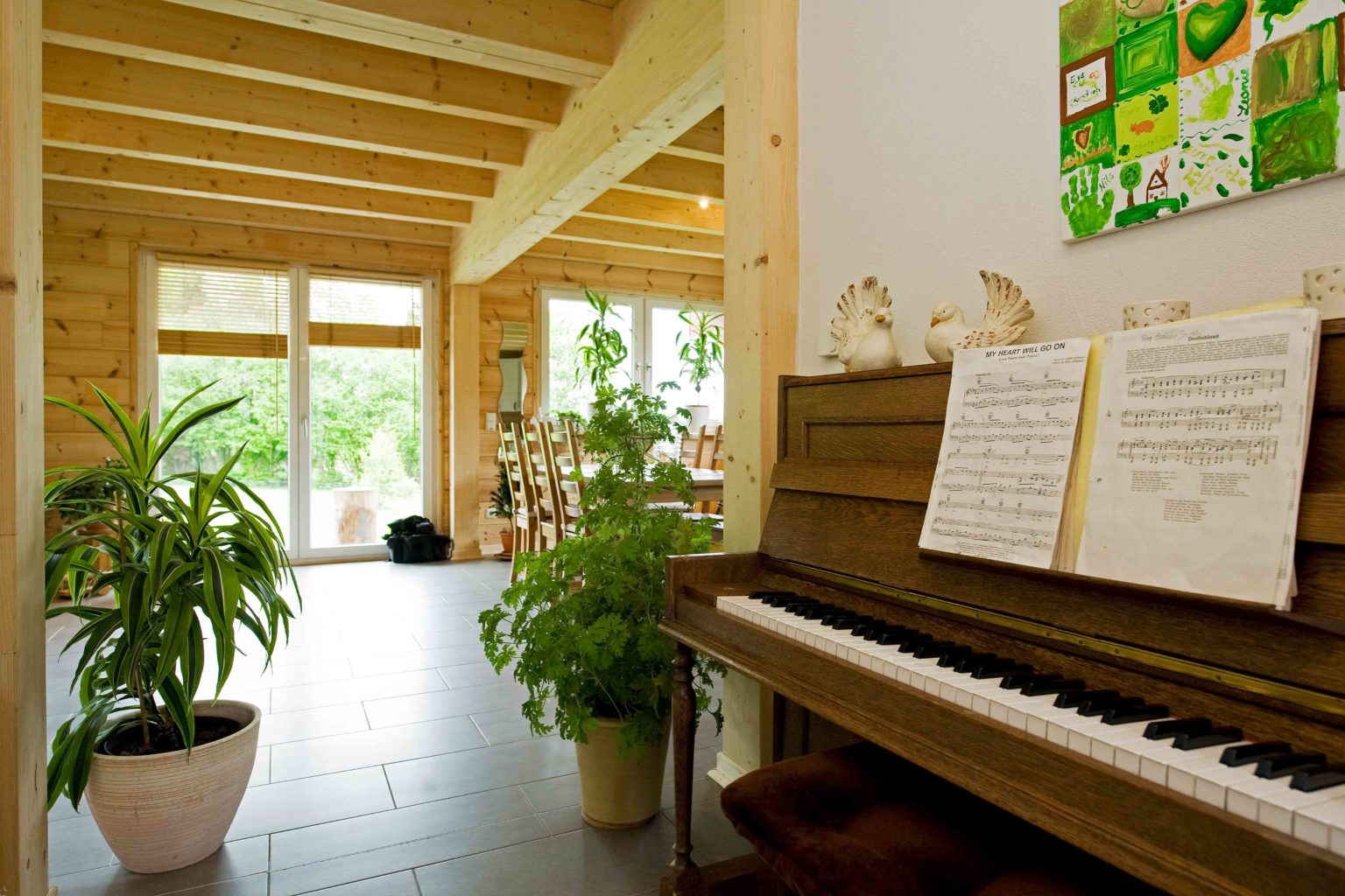 Überraschend hell erstrahlt alles, wenn man ins Holzhaus eintritt, besonders, weil man nach dem dunklen, farbigen Äußeren des Gebäudes nicht mit solch ruhiger Helligkeit im Holzhaus Innern rechnet. Hier herrscht überall die helle Naturfarbe des Kiefernholzes vor, bestrahlt von dem durch zahlreiche Fenster herein fallenden Tageslicht. Die zum Teil Weiß verputzen Ständerbau-Wandelemente im offenen Wohnbereich, sowie der sehr zurückhaltende Umgang mit Farbe, bestärken den lichten Gesamteindruck. Viele Grünpflanzen und hellgrüne Farbtupfer wirken gleichzeitig entspannend und erfrischend. Der Grundriss des Holzhauses beherbergt eine kleine Diele, mit Türen zum Gäste-WC und Hauswirtschaftsraum, von der aus man ohne weitere Tür geradewegs in den Wohn-Essbereich und von dort rechts um die Ecke in die offene Küche tritt. Eine Buchentreppe führt vom Wohnzimmer hinauf ins Dachgeschoss. Zum Gesamtkonzept des Holzhauses passend, ist die Küche im skandinavischem Stiel ganz in Weiß gehalten. Und um alle Sinne zu betören, werden von Draußen Eintretende klangvoll empfangen: Im Flur steht dekorativ ein Klavier, dem die Hausherrin beschwingte Melodien entlockt.
