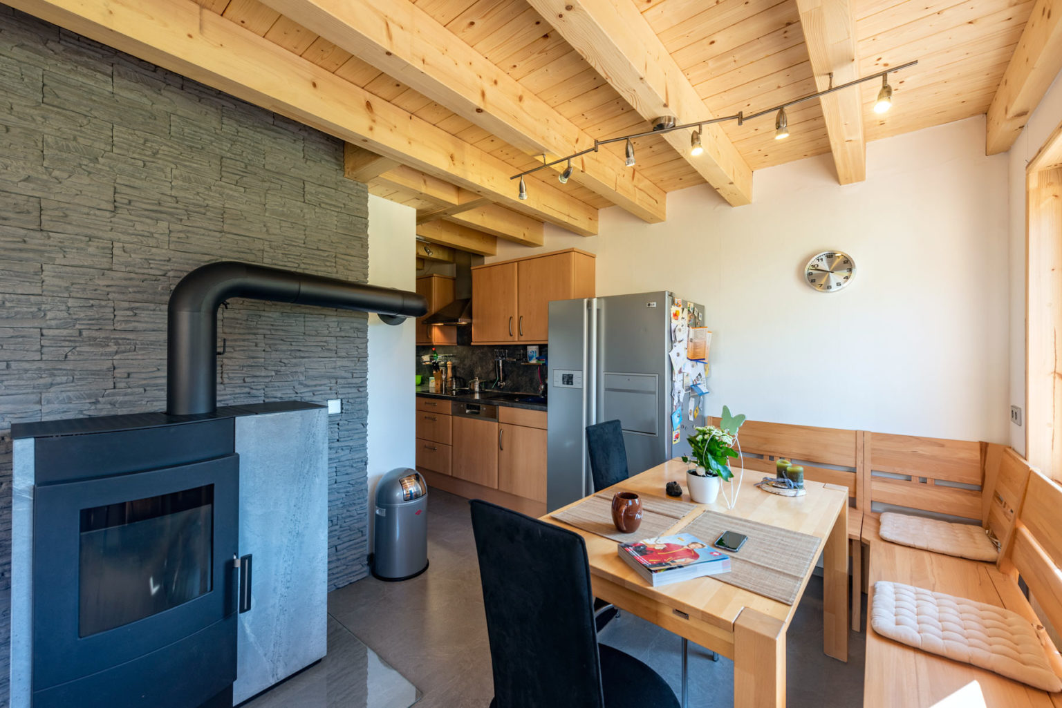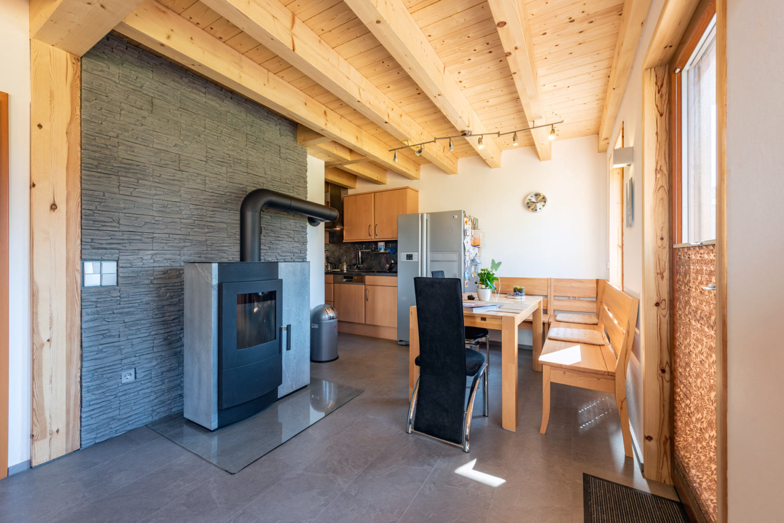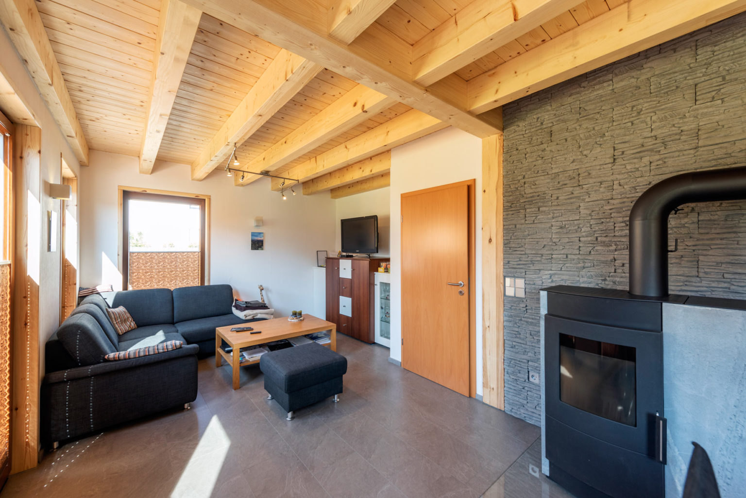 Das Eigentümerpaar wählte für Holzhaus „Westfalensonne“ die gedämmte Kombiblockwand, die ebenfalls wie die einschalige Blockwand setzungsfrei ist, aber noch niedrigere Jahresprimärenergiewerte aufweist. „Wie versprochen benötigen wir noch weniger Heizenergie, als berechnet wurde. Das hatte Fullwood uns vorher schon prophezeit, aber man glaubt`s natürlich erst, wenn es so ist.“, betont die Hausherrin. Von dem angenehmen Raumklima in ihrem Eigenheim sind beide sehr angetan und fühlen sich einfach nur wohl darin. Beim Heizen verlassen sich die Eßmann-Holfelds auf eine Mischung aus Gas, solarer Warmwasserbereitung und im Winter noch Pellets und Scheitholz. Auf diese Weise werden Fußbodenheizung und Kaminofen (im Wohnbereich) betrieben. „Im Dachgeschoss und im Wohnbereich hatten wir die Fußbodenheizung tatsächlich noch nie an.“, bemerkt Sebastian. Auch Wassersparen schreibt das vernünftige Paar groß: Mit ihrer 6.500 Liter fassenden Regenwasserzisterne versorgen sie neben dem Garten auch WC und Waschmaschine – einfach vorbildlich!