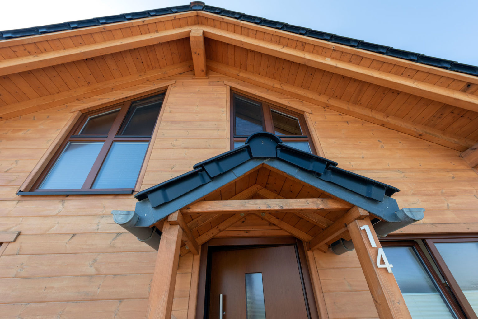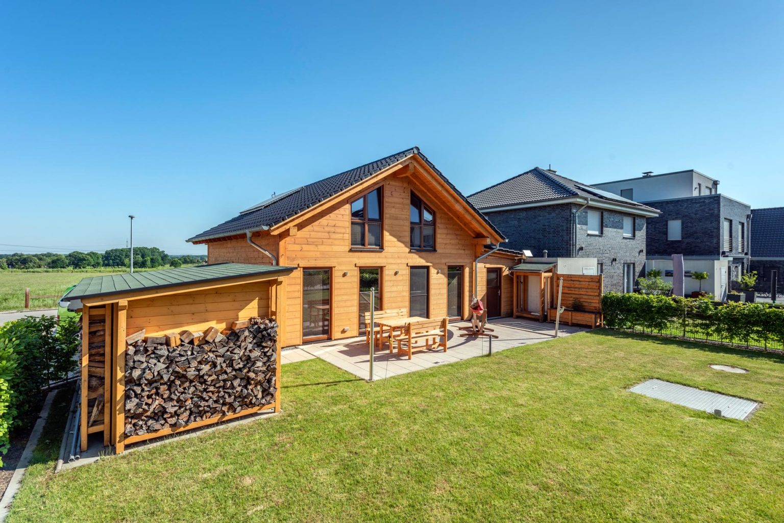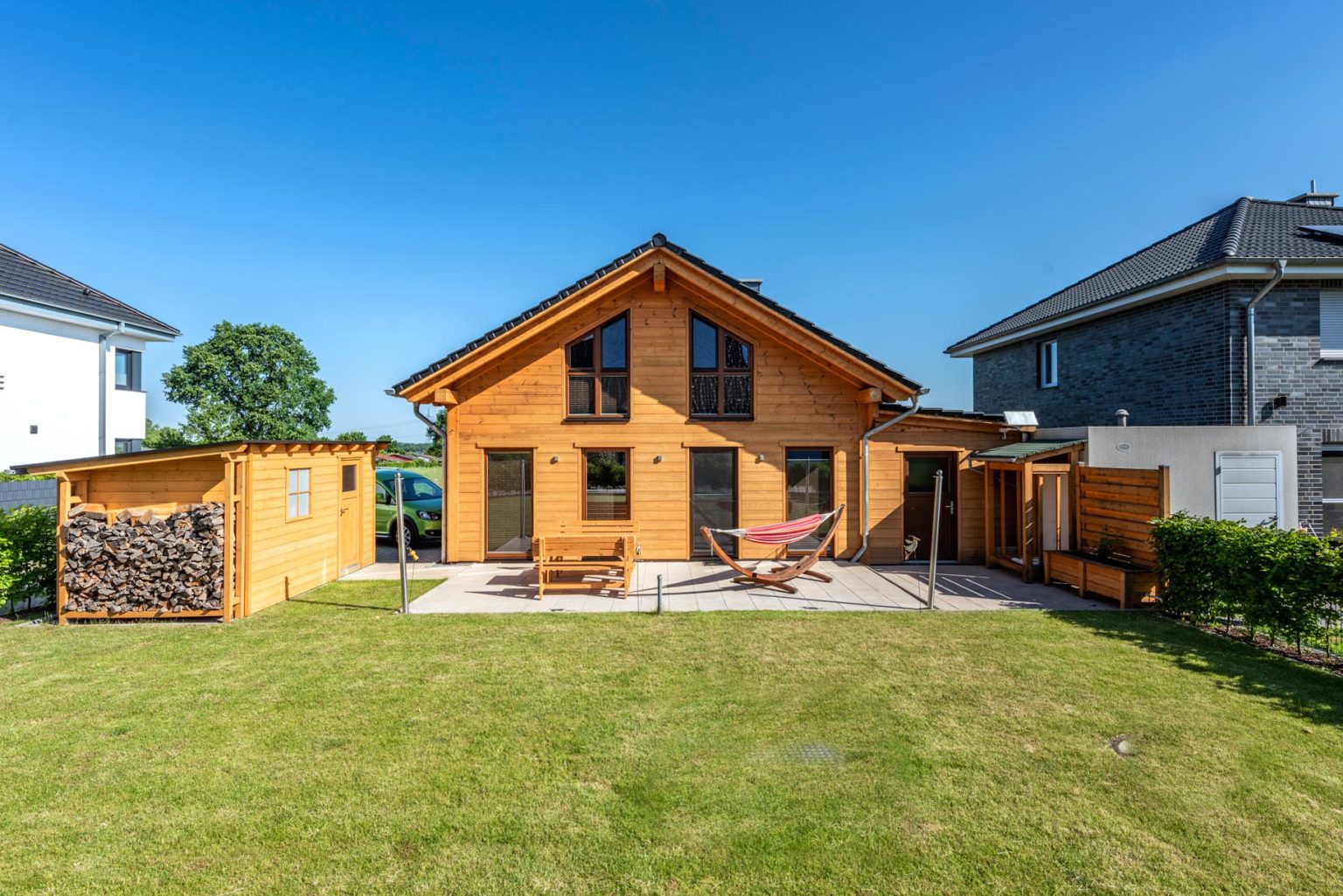 In der Nachbarschaft befinden sich ausschließlich moderne Einfamilienhäuser im aktuell angesagten Architekturstil mit einer Farbscala von weiß über antharzit bis schwarz. Holzhaus „Westfalensonne“ fällt entsprechend seines Baumaterials, massivem Kiefernholz und seiner warmen, hellen Holzfarbe auf – auch das unspektakuläre dunkelgrau gedeckte Satteldach ist wohltuend dezent.