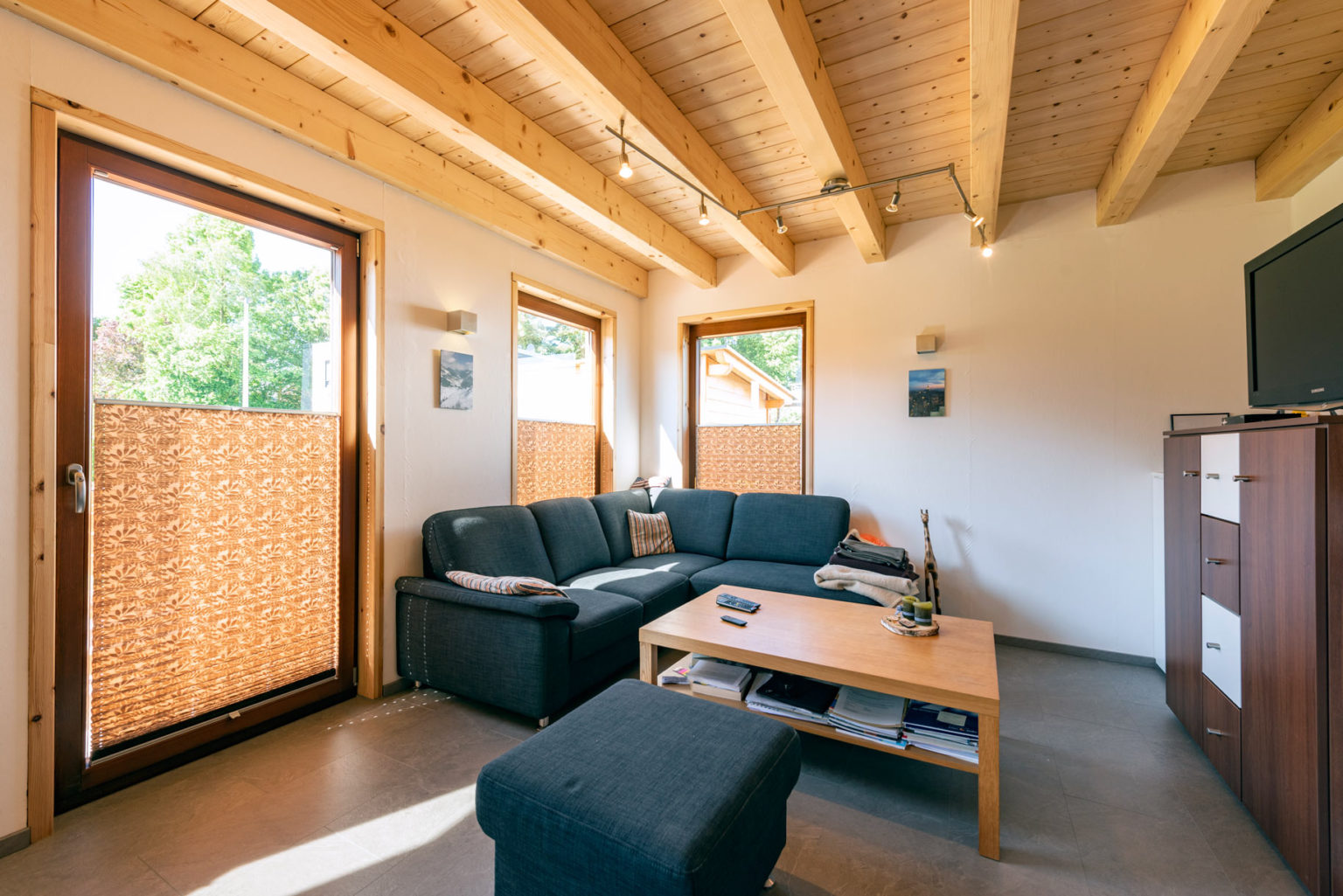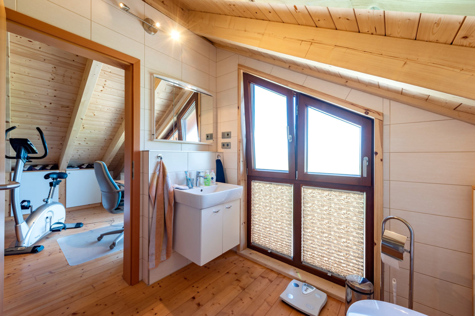 Bodentiefe Fenster im nach Süden ausgerichteten Wohnbereich sorgen für viel natürliches Licht und ermöglichen den ungehinderten Zugang zur sonnigen Terrasse. Auch im Dachgeschoss sind beide Giebelseiten bodentief verglast, so dass auf die Galerie und in das Badezimmer (beide am Nordgiebel) sowie in das großzügige Schlafzimmer (Südgiebel) reichlich Tageslicht eindringt. Um die Helligkeit im Holzhaus zu unterstützen, kombinierten Sebastian Eßmann und Sissi Holfeld weiß gestrichene Wandinnenflächen zu den offenen Holzbalkendecken. Pflegeleichte Fliesenböden im Erdgeschoss und im Badezimmer werden ergänzt von Holzdielenböden im Dachgeschoss und in der Gäste-Dusche/WC. Holzhaus „Westfalensonne“ ist der wahr gewordene Haustraum für alle Freunde gemütlichen und hellen Wohnens bei niedrigem Energieverbrauch.