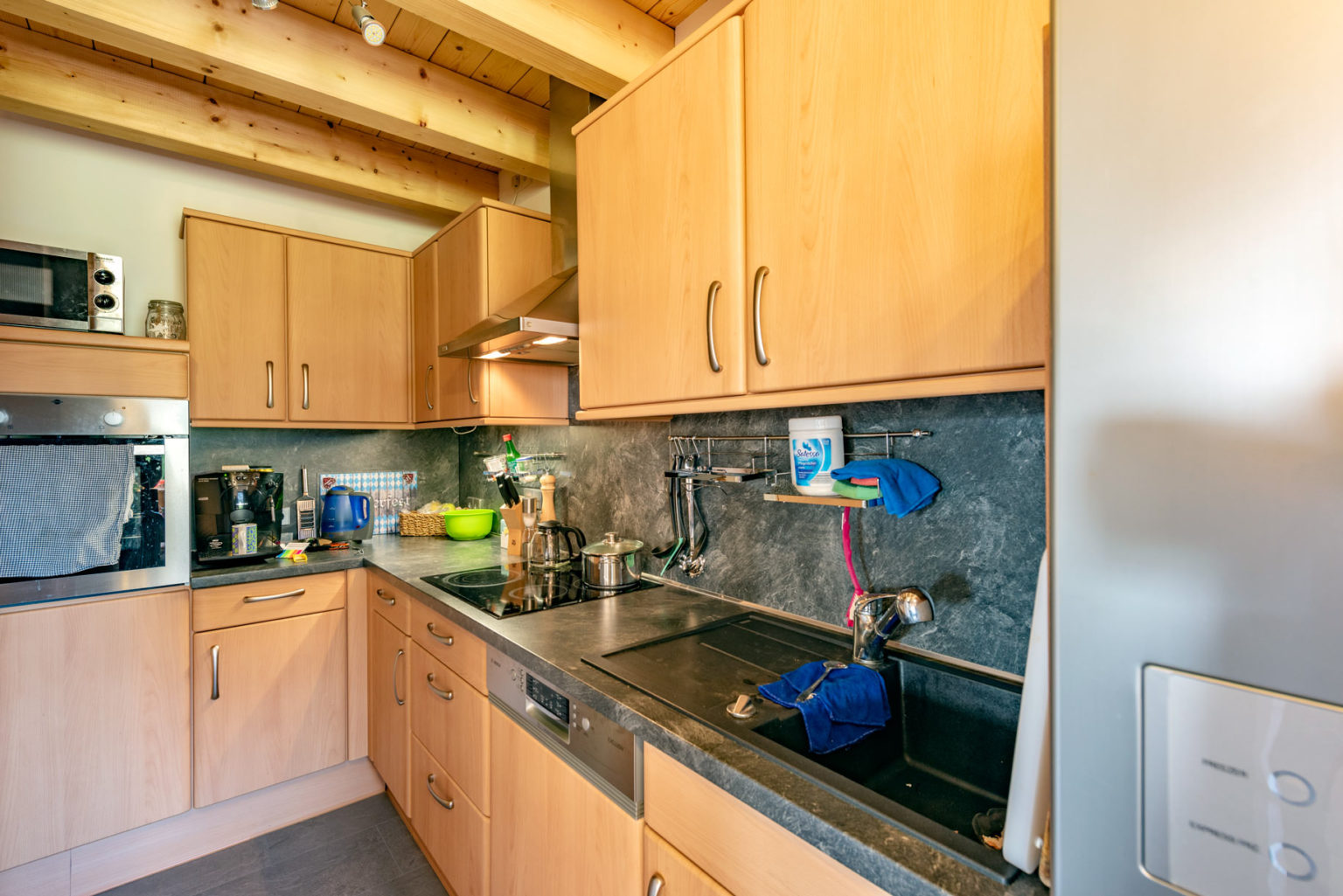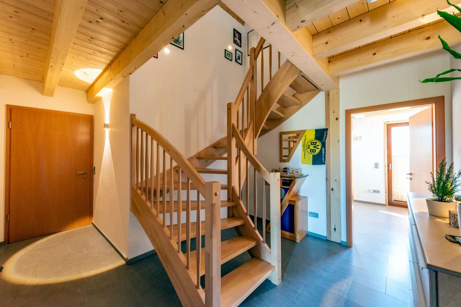 Uns wurde ein fertiger Grundriss von Fullwood vorgelegt, den wir dann nur noch ein wenig abgeändert haben, damit er vollkommen unseren Wohnbedürfnissen entspricht.“, sagt Sissi Holfeld. In der Bauphase konnten sich die Bauherren sogar noch kurzfristig um entscheiden und haben die Galerie im Dachgeschoss aus Platzgründen offen gelassen anstatt ein weiteres Zimmer abzutrennen. Im Erdgeschoss betritt man von draußen kommend einen Windfang, der zu einer geräumigen, L-förmige Diele mit Wendeltreppe (Buchenholz) ins Dachgeschoss führt. Direkt vom Windfang geht es in die Gäste-Dusche/WC mit gegenüberliegender Garderobe. Von der Diele gelangt man in ein Büro, in den offenen, L-förmigen Wohnbereich (mit Esszimmer und Küche im Eck), in einen Hauswirtschaftsraum und – direkt daneben – in die Garage. „Es ist ungemein praktisch, dass wir vom Haus direkt in die Garage können, und dass der Hauswirtschaftsraum in unmittelbarer Nähe zur Garage ist!“, findet das Eigentümerpaar unisono. Kurze (trockene!) Wege für einen reibungslosen Wohnalltag sind das erfreuliche Ergebnis.