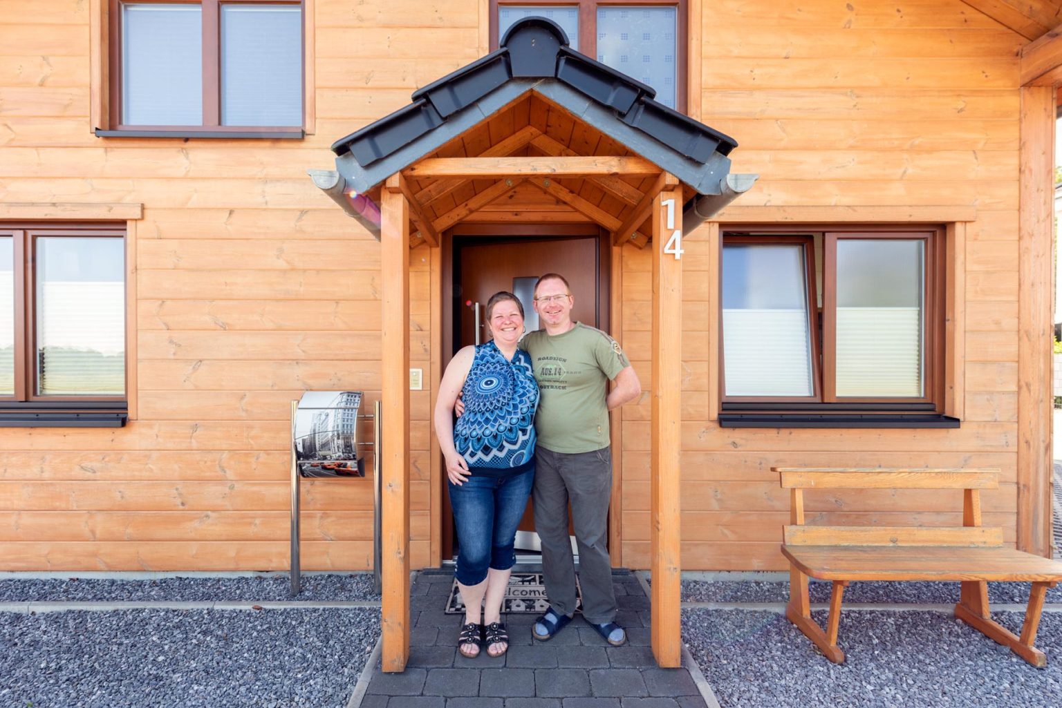 „Schwierigkeiten bei der Baugenehmigung gab es keine.“, erzählt Sebastian Eßmann froh. Der gelernte Tischler hat sich seinen Traum vom Holzhaus erfüllen können. „Dank der von Fullwood angebotenen Richtmeistermontage konnten wir unser Haus selbst mit aufbauen und auch den Innenausbau in Eigenleistung bewältigen.“, freut sich der junge Hausherr, der dank dieser Baustufe viel Geld sparen konnte. „Der Richtmeister war nur eine Woche vor Ort, danach haben wir alles selbst gemacht. Unsere Eltern haben uns geholfen.“, ergänzt Sissi Holfeld, die selbst auch viel mitgearbeitet hat. Nur mit den Gas- und Wasserinstallationen beauftragte das Paar örtliche Fachfirmen. „Ich habe ein Kundenhaus von Fullwood in der Nähe gesehen, da war noch das Baustellenschild aufgestellt. So bin ich auf den Holzhausspezialisten gekommen und habe Musterhaus „Sommerwiese“ in Lohmar bei Köln besucht.“, erzählt Sebastian Eßmann. Da ihm und seiner Freundin das Musterhaus und dessen Machart so gut gefielen – vor allem die geradlinige und schlichte Blockwandoptik – blieben sie bei Fullwood hängen und machten Nägel mit Köpfen. Dabei wollte Sissi Holfeld nie im Leben bauen: „Ich bin froh, dass wir`s gemacht habe!“, weiß sie heute.