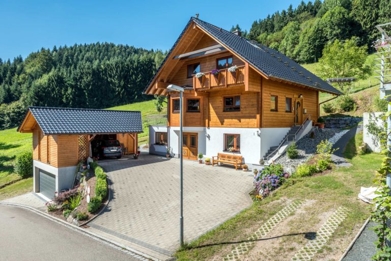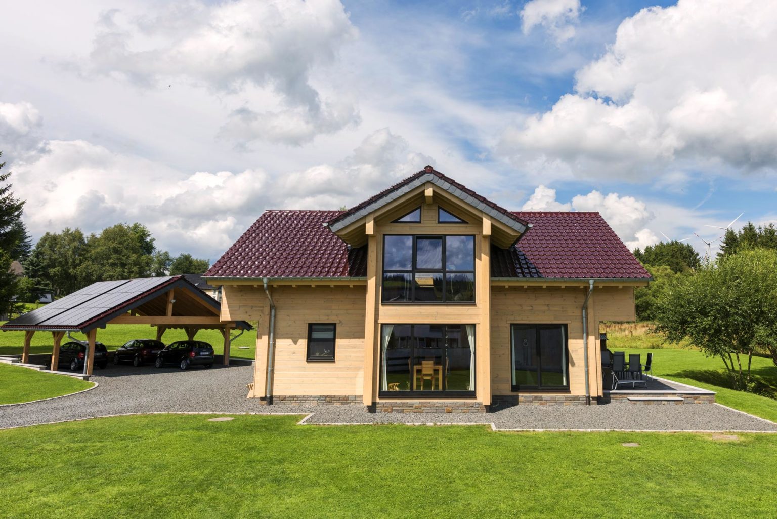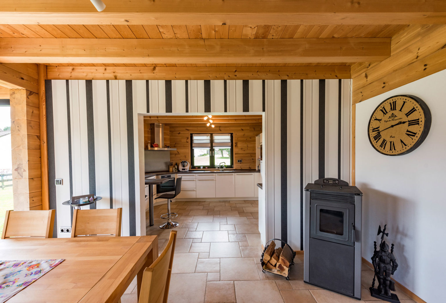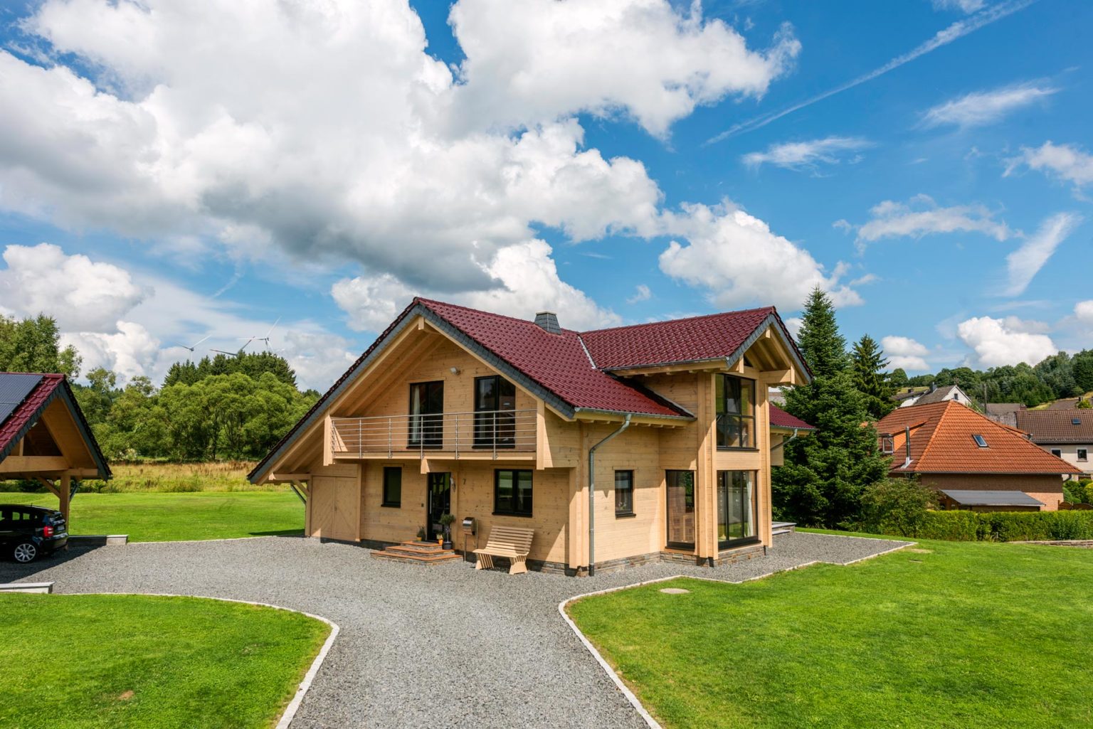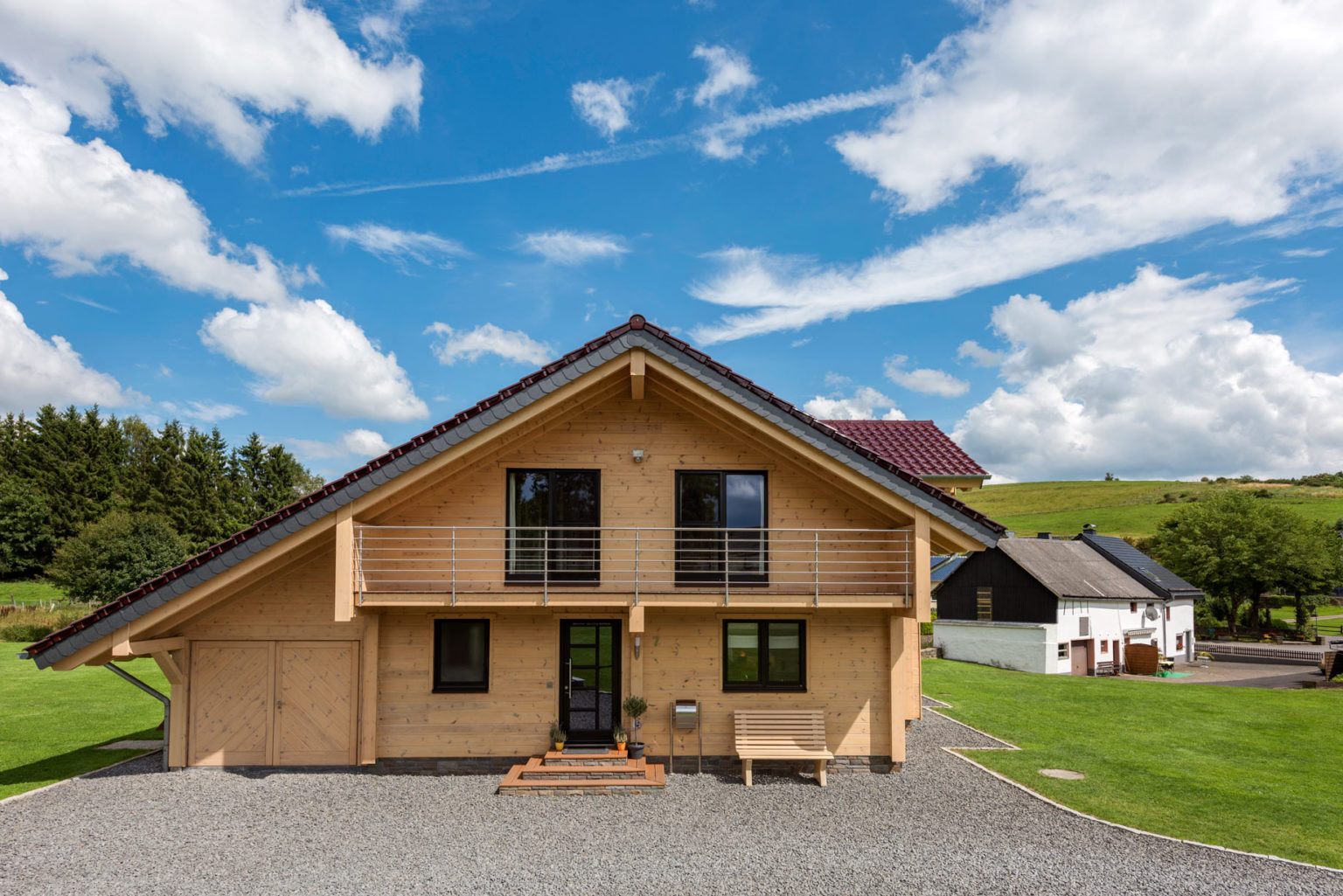 Bevor es ans Bauen ging, ließ der Hausherr den alten Bauernhof der Familie abreißen um Platz für Neues zu schaffen – extrem viel Platz sogar. Seiner Idee einen Bungalow zu bauen, stimmte seine Partnerin nicht zu, denn ihrer Ansicht nach „ist ein Holzhaus ohne Geschosstreppe kein richtiges Haus“. Sodann wurde Holzhaus „Wiesengrund“ detailliert zusammen mit Fullwood 1.5-geschossig und sehr geräumig geplant. Da sein Grundstück sehr weitläufig ist, will der Hausbesitzer aber im Alter eventuell doch noch ein barrierefreies, eingeschossiges Holzhaus bauen. Als die Hausplanung abgeschlossen war, wurden 20cm dicke, einschalige Kiefernwandelemente im Fullwood-Werk passgenau angefertigt sowie alle benötigten Deckenbalken, Dachsparren und die Firstpfette zugeschnitten und termingetreu zum Bauplatz geliefert. Unter der Regie und Vorarbeit eines kompetenten Fullwood-Richtmeisters baute der Hausherr gemeinsam mit seinem Vater Holzhaus „Wiesengrund“ auf und strich es außen mit einem minimal weiß pigmentierten Schutzanstrich an um das naturhelle Kiefernholz noch etwas aufzuhellen.