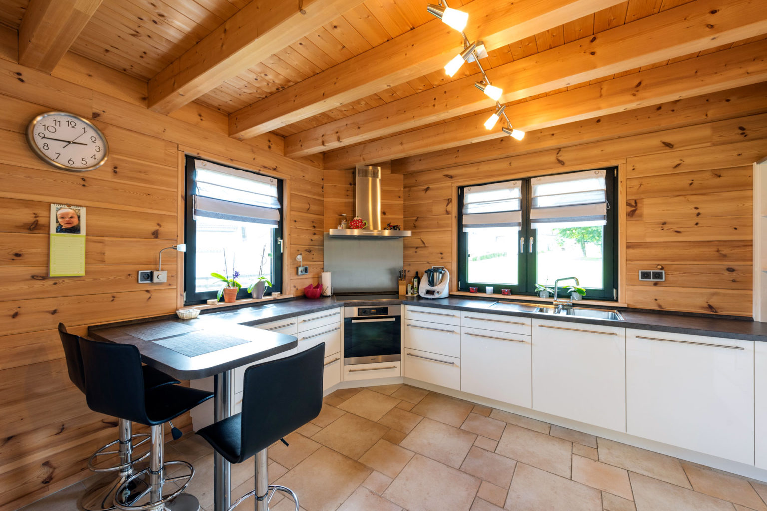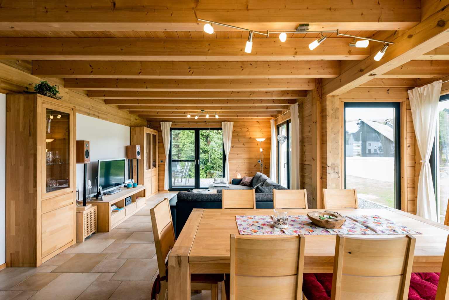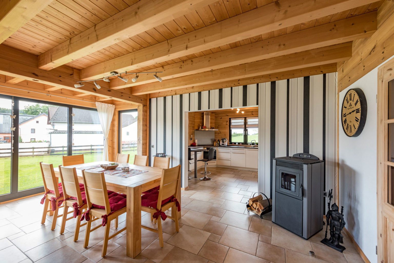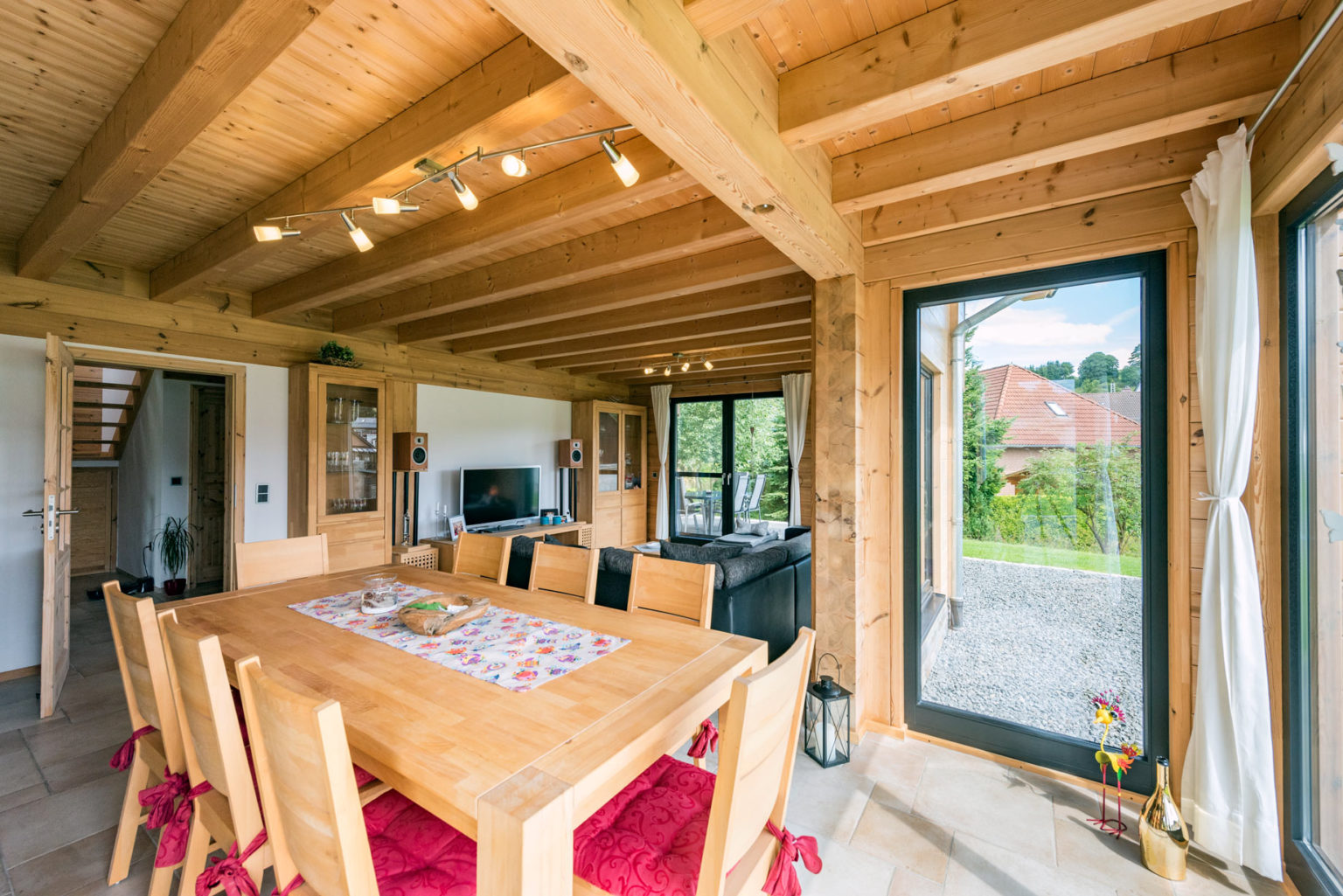 Auch im Innern legt das Eigentümerpaar viel Wert auf Helligkeit, weshalb Ost-, Süd- und Westseite große, überwiegend bodentiefe Fenster aufweisen. Den ganzen Tag ist Holzhaus „Wiesengrund“ lichtdurchflutet, besonders der offene Wohn/Ess-Bereich profitiert von einem rundum bodentief verglasten Rechteckerker. Er ist Teil eines zweigeschossigen Zwerchhauses an der südlichen Traufseite. Weiß tapezierte Trennwände (leichte Ständerbauweise) reflektieren das Licht und hellen zusätzlich auf, während gemusterte Tapeten und farbig gestrichene Wandteile (ebenfalls alles Trennwände in Leichtbauweise) noch mehr Abwechslung ins Holzhaus bringen. Die massiven Außenwände und Sichtbalkendecken ließ man innen unbehandelt, so dass sie nachdunkeln. „Im Nachhinein war das ein Fehler, und wir hätten doch lieber den angebotenen UV-Schutz auftragen sollen.“, findet der Hauseigner heute. Helle Bodenfliesen – im Bad in Holzdielenoptik – und Türen aus Kiefernholz unterstreichen das behagliche Ambiente. Schwarze Fensterrahmen und transparente, geradlinige Edelstahlgeländer an den beiden Balkonen betonen die moderne Hausoptik. Das rot gedeckte Satteldach setzt einen freundlichen Farbakzent.