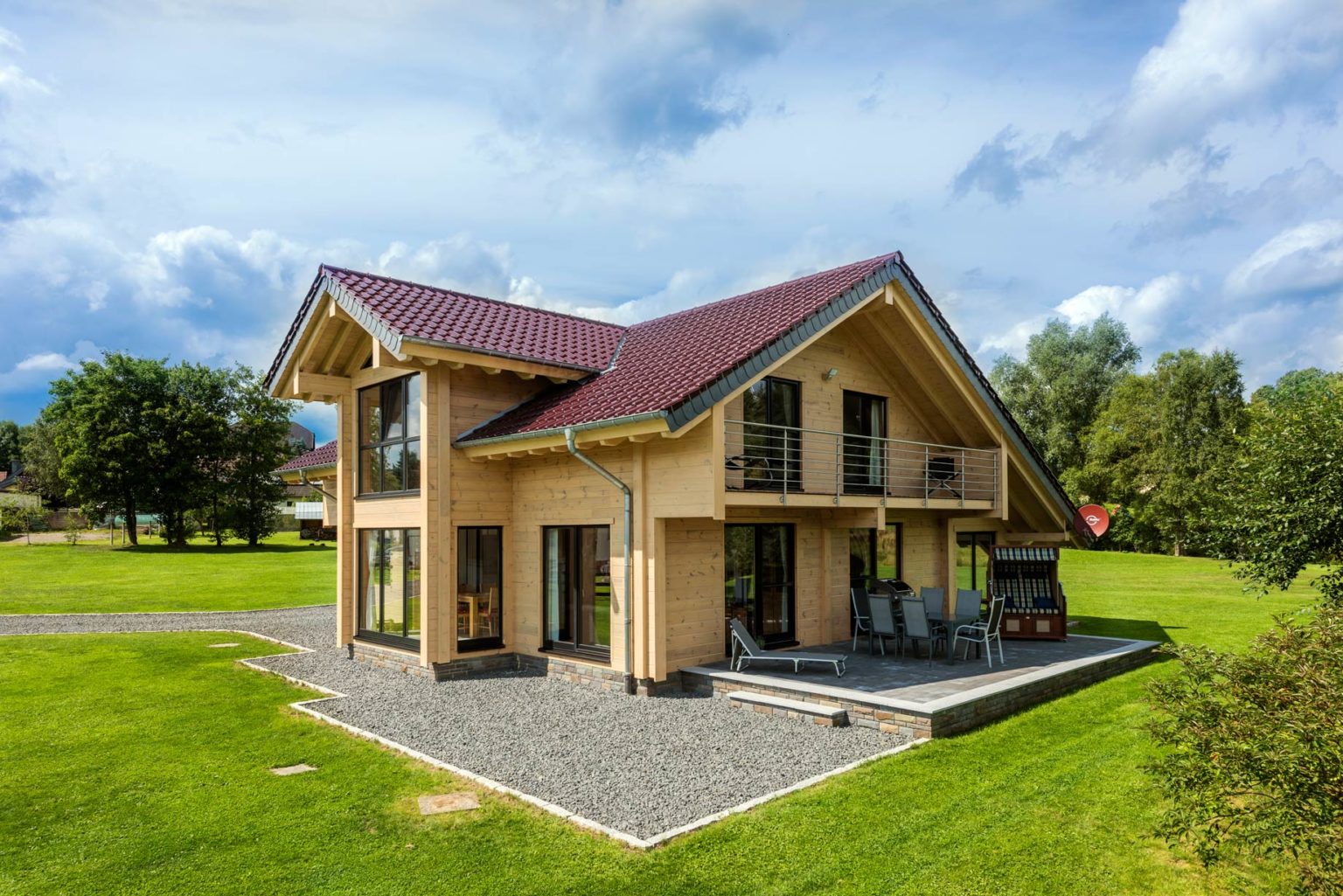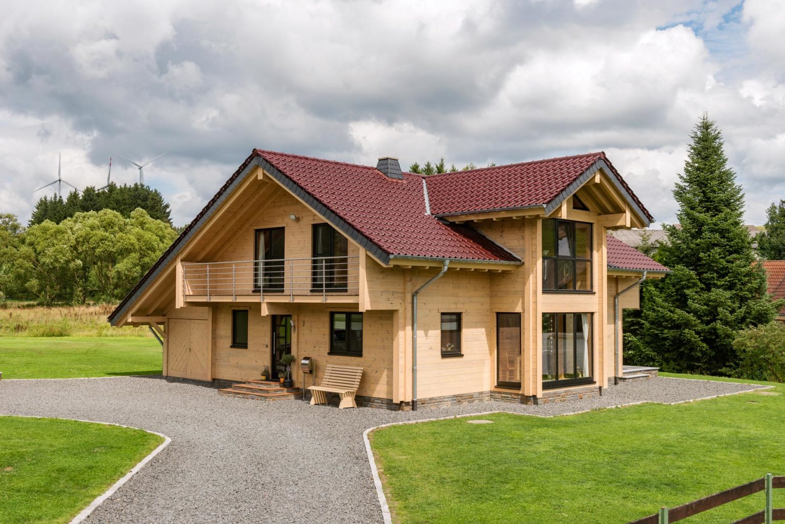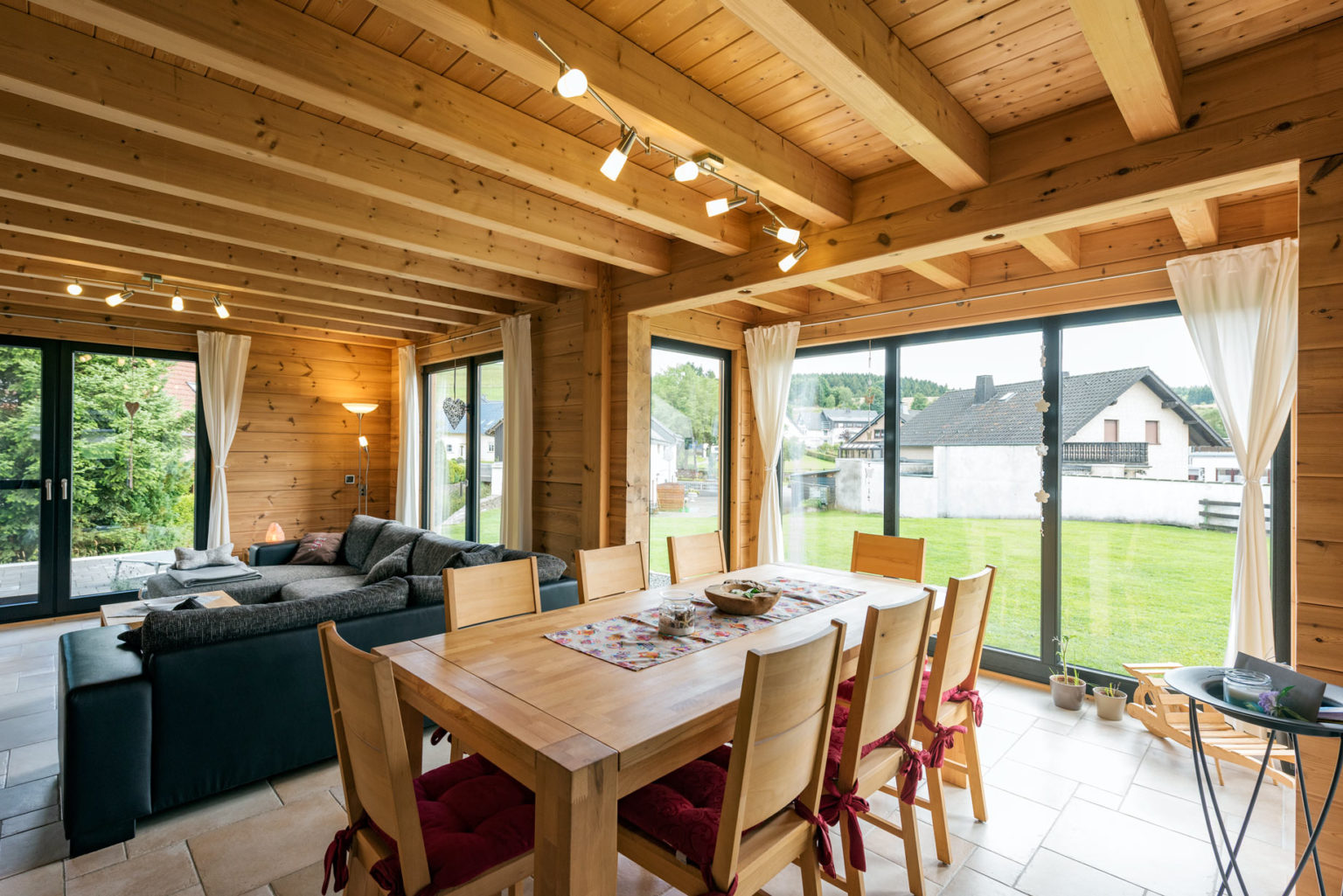 Auch im Innern legt das Eigentümerpaar viel Wert auf Helligkeit, weshalb Ost-, Süd- und Westseite große, überwiegend bodentiefe Fenster aufweisen. Den ganzen Tag ist Holzhaus „Wiesengrund“ lichtdurchflutet, besonders der offene Wohn/Ess-Bereich profitiert von einem rundum bodentief verglasten Rechteckerker. Er ist Teil eines zweigeschossigen Zwerchhauses an der südlichen Traufseite. Weiß tapezierte Trennwände (leichte Ständerbauweise) reflektieren das Licht und hellen zusätzlich auf, während gemusterte Tapeten und farbig gestrichene Wandteile (ebenfalls alles Trennwände in Leichtbauweise) noch mehr Abwechslung ins Holzhaus bringen. Die massiven Außenwände und Sichtbalkendecken ließ man innen unbehandelt, so dass sie nachdunkeln. „Im Nachhinein war das ein Fehler, und wir hätten doch lieber den angebotenen UV-Schutz auftragen sollen.“, findet Hartmut Freyaldenhoven. Helle Bodenfliesen – im Bad in Holzdielenoptik – und Türen aus Kiefernholz unterstreichen das behagliche Ambiente. Schwarze Fensterrahmen und transparente, geradlinige Edelstahlgeländer an den beiden Balkonen betonen die moderne Hausoptik. Das rot gedeckte Satteldach setzt einen freundlichen Farbakzent.
