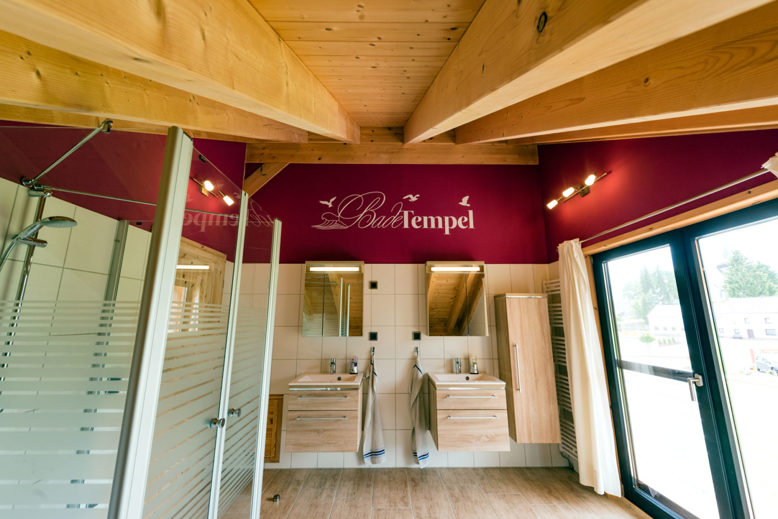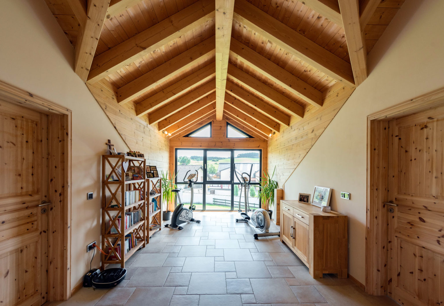 Die Treppe führt auf einen zentriert im Dachgeschoss gelegenen Flur. Dieser erhält reichlich Tageslicht durch den nach Süden ausgerichteten, komplett verglasten Zwerchhaus-Giebel. Ursprünglich war dort ein Arbeitszimmer geplant, aber man entschied sich in der Bauphase dann doch für einen größeren Flur ohne Trennwand zum Arbeitsbereich. Somit ergänzen ein Schlafzimmer, zwei weitere Zimmer – alle mit fußwarmem Korkboden ausgelegt - und ein großes Wellnessbad das Raumprogramm von Holzhaus „Wiesengrund“. Die wohngesunde Behaglichkeit in ihrem modernen Holzhaus schätzt das Eigentümerpaar ganz besonders. Nach „Gartenhütte“ sieht dieses imposante, eineinhalbgeschossige Holzhaus ganz und gar nicht aus!