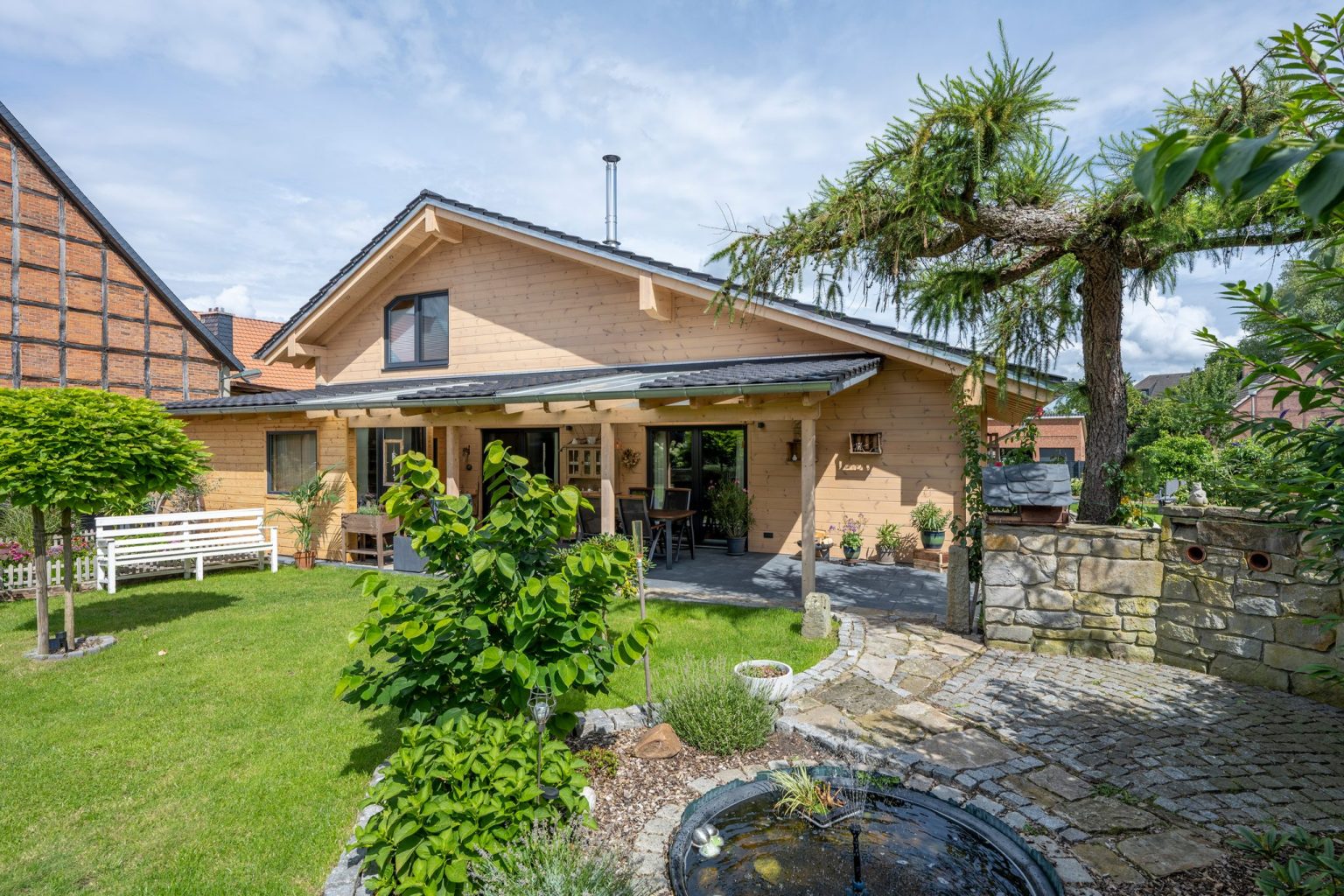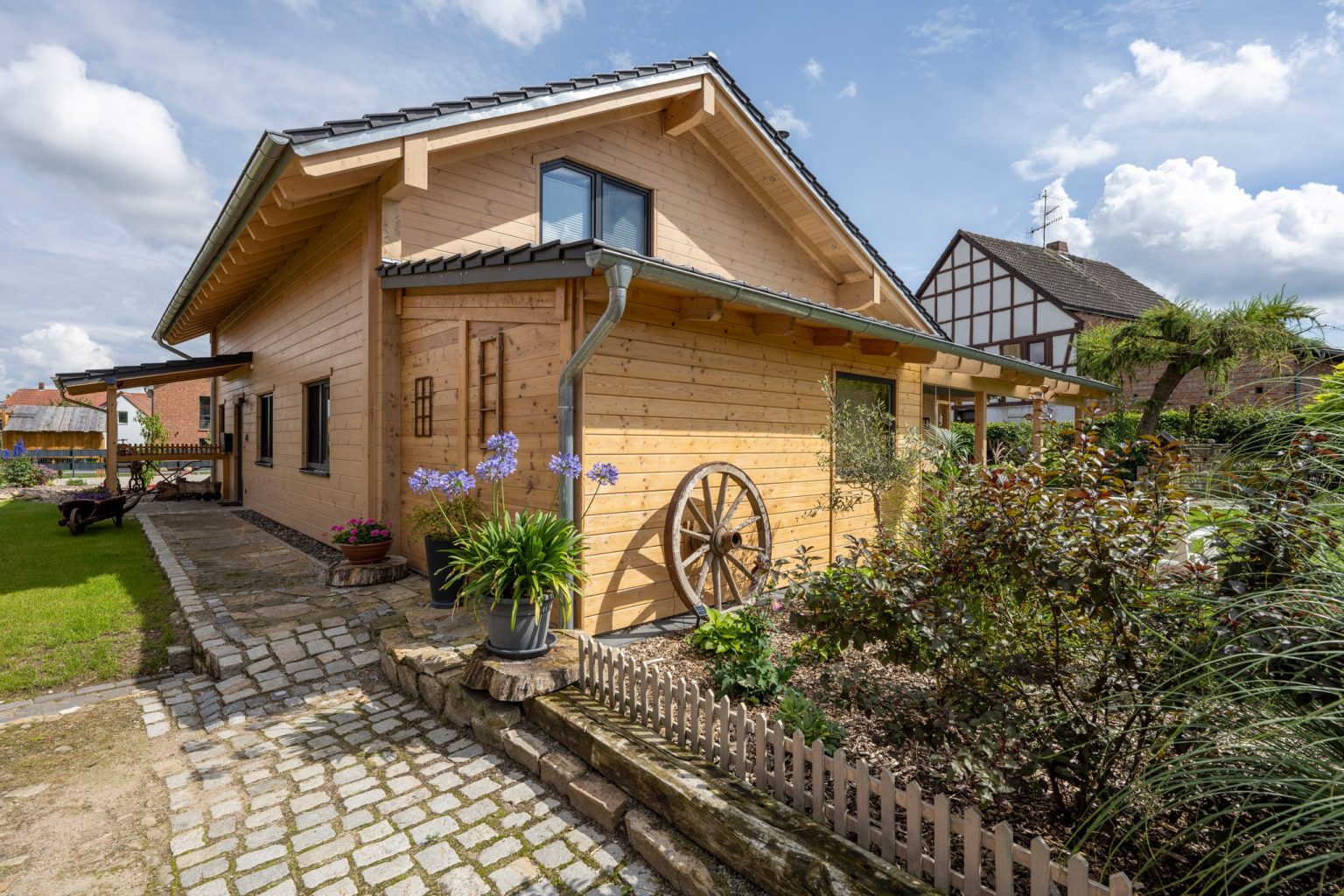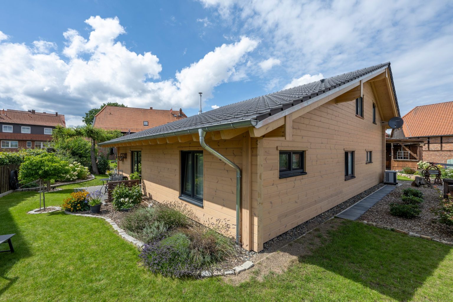 Holzhaus „Wolfsburg“ wurde mit Blick auf’s Alter für ein sorgenfreies Wohnen auf einer Ebene geplant. Zusätzlich besitzt es eine großzügige Galerie unter dem schönen Sichtdachstuhl. Von dort erreicht man ein großzügiges Gästezimmer mit einem eigenen großen Badezimmer. „Bei der Planung war uns ein altersgerechtes Haus wichtig, in dem wir bleiben können, komme, was da wolle.“, sagt Hausherr Dieter Rietz-Nause. Er und seine Frau waren sich von Anfang an einig, dass ihr Altersruhesitz unbedingt ein massives Holzhaus sein sollte. „Für uns stand das wohltuende Klima eines Holzhauses an erster Stelle. Man fühlt sich einfach wohl darin!“, so Heike Rietz-Nause. Überzeugen mussten sie einander nicht von einem Massivholzhaus, da waren sie sich von Anfang an einig. Ihr individuelles Holzhaus „Wolfsburg“ entwarfen und durchdachten sie zuerst zu zweit und besprachen sich dann mit ihrem Hausberater von Fullwood Wohnblockhaus. „Fullwood haben wir im Internet gefunden. Es war gleich Liebe auf den ersten Blick!“, lacht die Hausherrin. Natürlich besuchte das Ehepaar daraufhin zuerst einmal das am nächsten gelegene Musterhaus des Holzhaus Spezialisten, bevor sie sich endgültig festlegten.