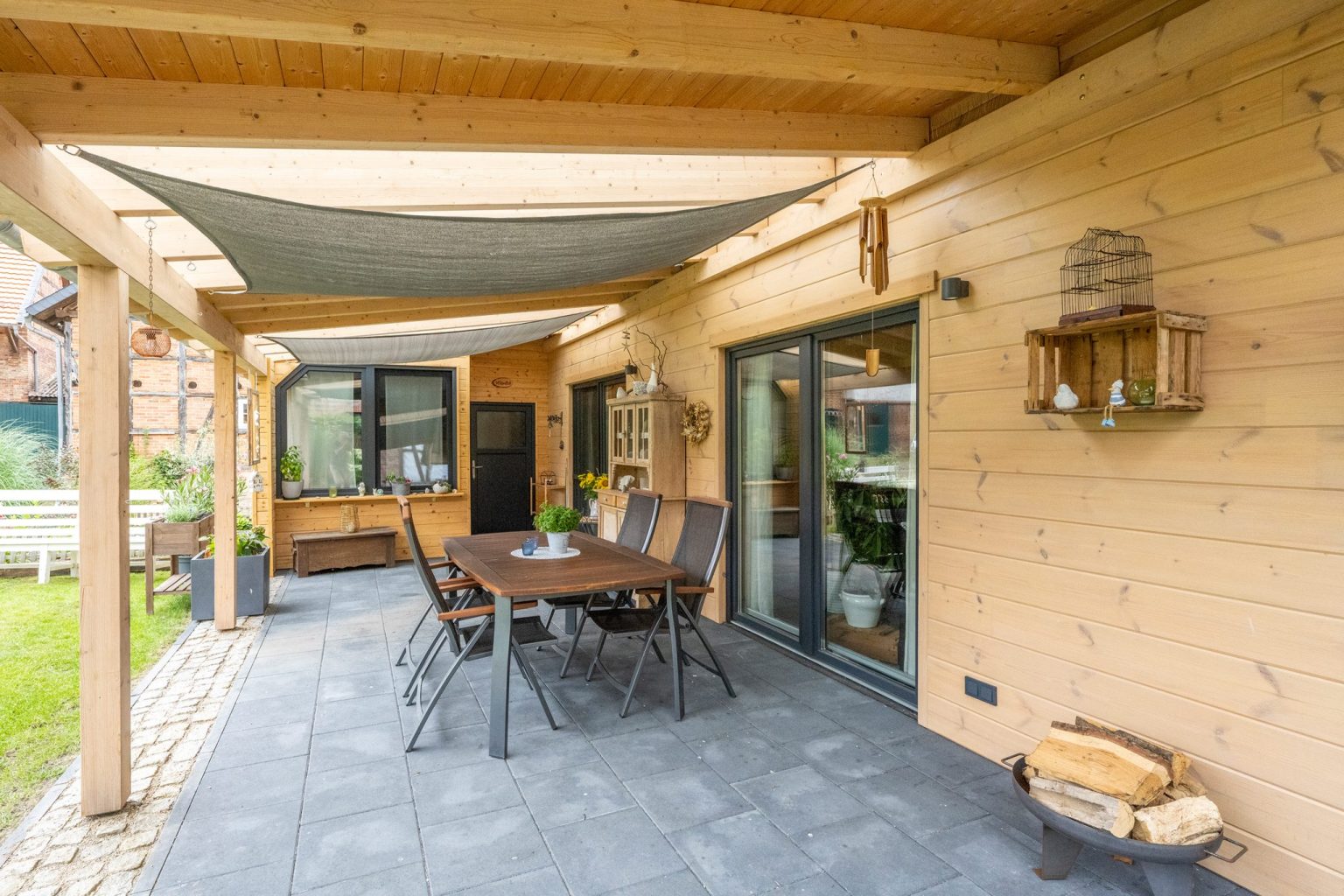 Die Außenwände erhielten einen sehr hellen Schutzanstrich aus Edelwachs, der das Holz vor Vergrauung bewahrt. Einen schönen Kontrast dazu bilden die anthrazitfarbenen Fenster und Dachziegel, die zum Teil auch als Eindeckung des Terrassendachs dienen. Damit das Terrassendach nicht alles Sonnenlicht nimmt, wurden in Höhe der bodentiefen Fenster zum Wohnbereich große Glaselemente eingebaut. Diese Schützen vor Regen, lassen aber Licht durch.