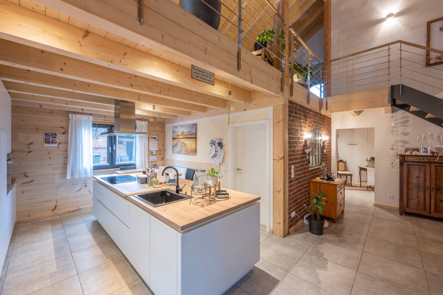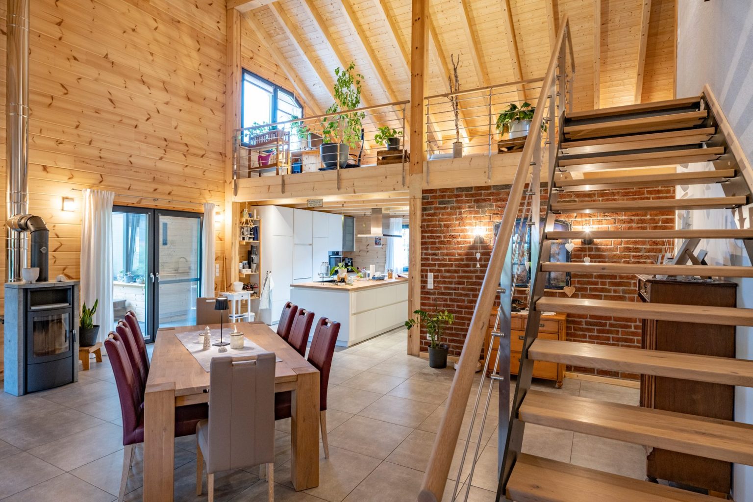 Holzhaus „Wolfsburg“ ist sowohl in der Fläche als auch in der Lichte offen und großzügig gehalten. Von der geräumigen Diele geht es gleich in den weitläufigen Wohnbereich, in dem sich Küche, Esszimmer und Wohnzimmer befinden. Dieser Bereich nimmt gut die Hälfte des Erdgeschosses ein und besitzt einen luxuriös hohen Luftraum direkt bis zur Firstpfette und zum Sichtdachstuhl hinauf. Lediglich die Küche besitzt normale Raumhöhe, denn über ihrer schönen Sichtbalkendecke befindet sich die Galerie. Während die tragenden Außenwände des Gebäudes aus 20cm dicken Polarkiefernwänden bestehen, entschieden sich Dieter und Heike Rietz-Nause drinnen für weiß verputzte und tapezierte Trennwände (leichter Ständerbau). Das bringt noch mehr Leichtigkeit und Helligkeit ins Holzhaus und unterstreicht kontrastreich die Wirkung der naturhellen Blockwände. „Drinnen haben wir die Holzwände, Balkendecken und den Dachstuhl mit UV-Schutz streichen lassen. So bleibt alles hell und dunkelt nicht nach.“, berichtet die Dame des Hauses. Als Eyecatcher wurde eine kleine Wand im Wohnbereich mit roten Ziegelsteinen und einem Zierfenster mit Fotoausblick auf einen herbstlich belaubten Laubbaum verkleidet. Das rot der Backsteine findet sich in den Stühlen um den Esstisch und in der Sofalandschaft wieder. Ansonsten dominieren die hellen, sandfarbenen Bodenfliesen, die anthrazitfarbenen Fenster und Stahltreppenwangen sowie das viele weiß (Wände und Küche) im ganzen Haus.