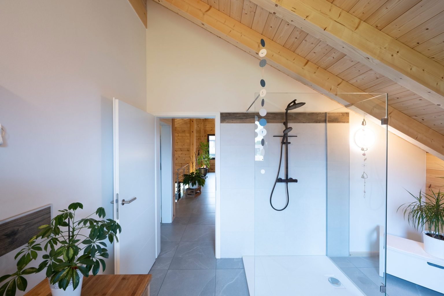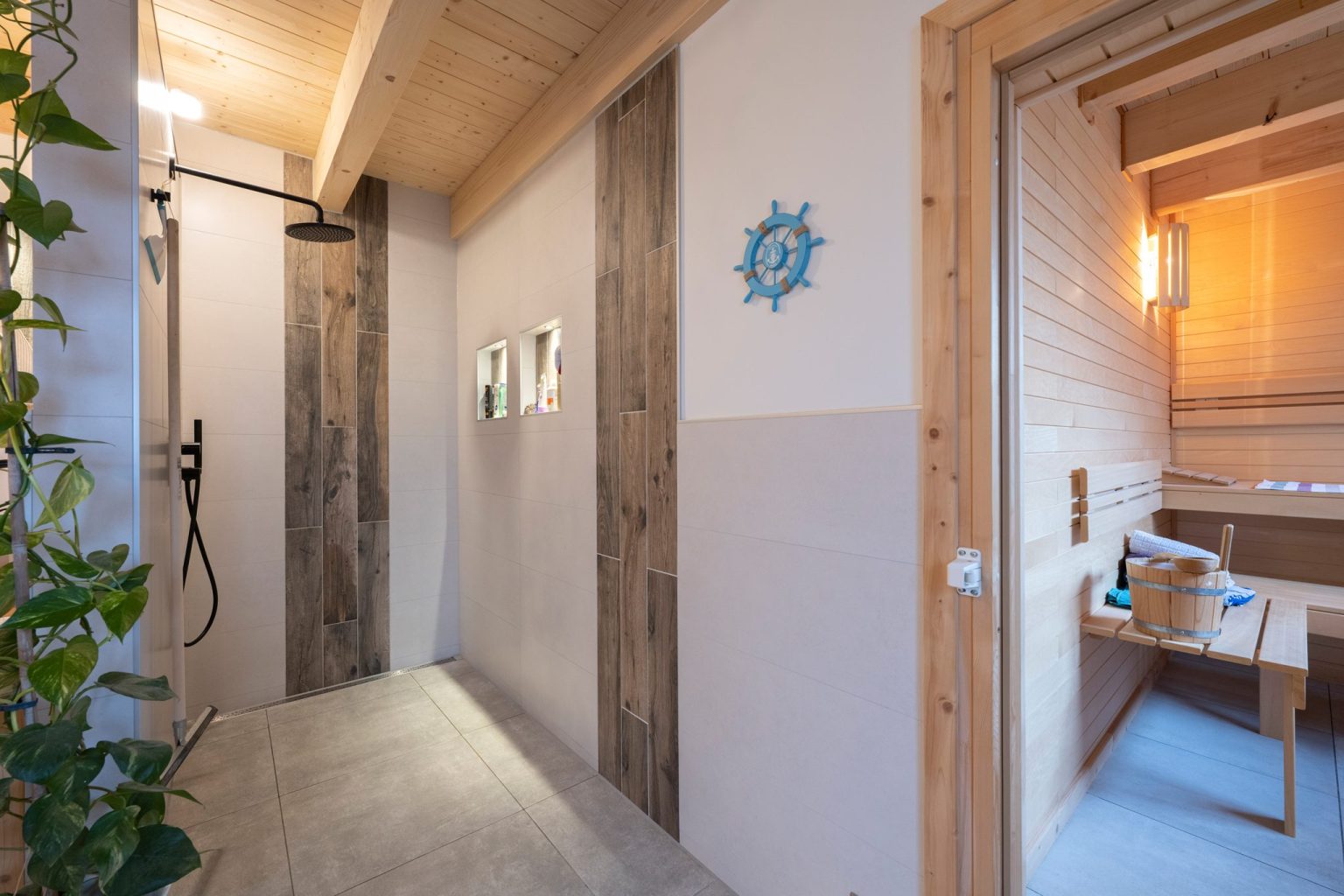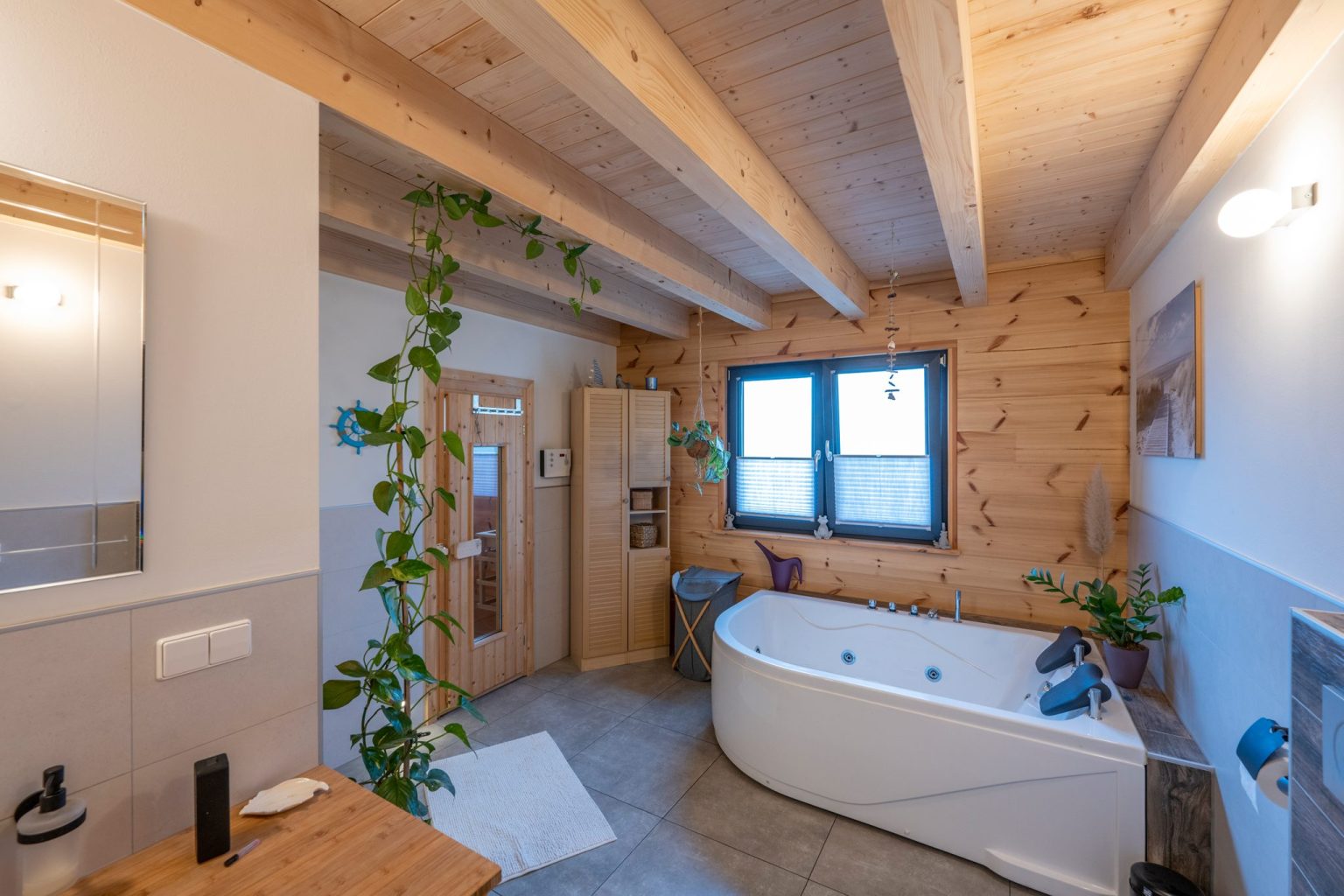 Von der Küche gibt es einen direkten Zugang zum Hauswirtschaftsraum, der wiederum mit der Diele verbunden ist. Es sind nur ein paar Schritte vom Hauseingang in den Hauswirtschaftsraum, sodass dort schnell Einkäufe verstaut werden können. Des Weiteren gelangt man von der Diele in ein kleines Gäste-WC. Das Schlafzimmer ist vom Wohnbereich aus zugänglich und besitzt ein großes Badezimmer mit einer Whirlpool-Badewanne für zwei Personen und angeschlossener Sauna en Suite. Der Wellnessbereich ergänzt das Urlaubs- und Erholungsgefühl im Holzhaus. Übrigens ist das Schlafzimmer ebenfalls offen bis unter's Dach, wobei die Raumhöhe geringer als die im Wohnbereich ist, da das Satteldach des Hauses asymmetrische Hälften besitzt, wovon sich die eine weit herunterzieht. Die großflächige Galerie im Dachgeschoss wird vielseitig genutzt; dort befindet sich ein Arbeitsbereich, eine Sofalandschaft sowie ein Hometrainer. Im Gästezimmer können bequem zwei Erwachsene schlafen und genau wie das Badezimmer im Erdgeschoss besitzt auch das Gästebad eine große, bodentiefe Dusche.