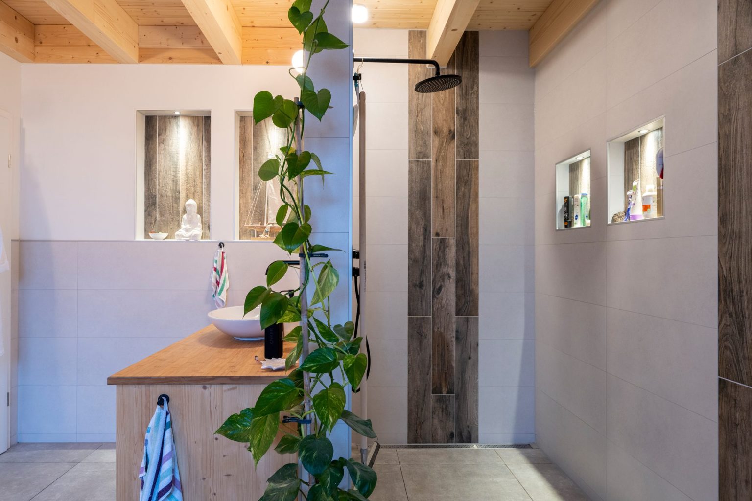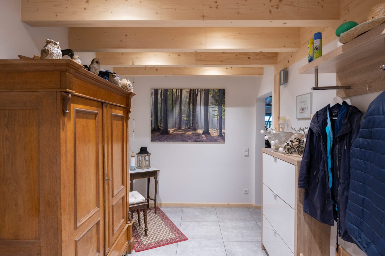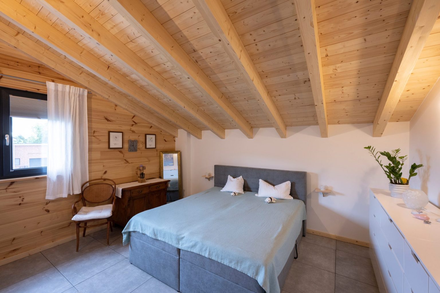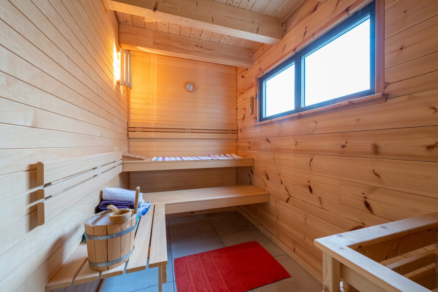 Von der Küche gibt es einen direkten Zugang zum Hauswirtschaftsraum, der wiederum mit der Diele verbunden ist. Es sind nur ein paar Schritte vom Hauseingang in den Hauswirtschaftsraum, sodass dort schnell Einkäufe verstaut werden können. Des Weiteren gelangt man von der Diele in ein kleines Gäste-WC. Das Schlafzimmer ist vom Wohnbereich aus zugänglich und besitzt ein großes Badezimmer mit einer Whirlpool-Badewanne für zwei Personen und angeschlossener Sauna en Suite. Der Wellnessbereich ergänzt das Urlaubs- und Erholungsgefühl im Holzhaus. Übrigens ist das Schlafzimmer ebenfalls offen bis unter's Dach, wobei die Raumhöhe geringer als die im Wohnbereich ist, da das Satteldach des Hauses asymmetrische Hälften besitzt, wovon sich die eine weit herunterzieht. Die großflächige Galerie im Dachgeschoss wird vielseitig genutzt; dort befindet sich ein Arbeitsbereich, eine Sofalandschaft sowie ein Hometrainer. Im Gästezimmer können bequem zwei Erwachsene schlafen und genau wie das Badezimmer im Erdgeschoss besitzt auch das Gästebad eine große, bodentiefe Dusche.