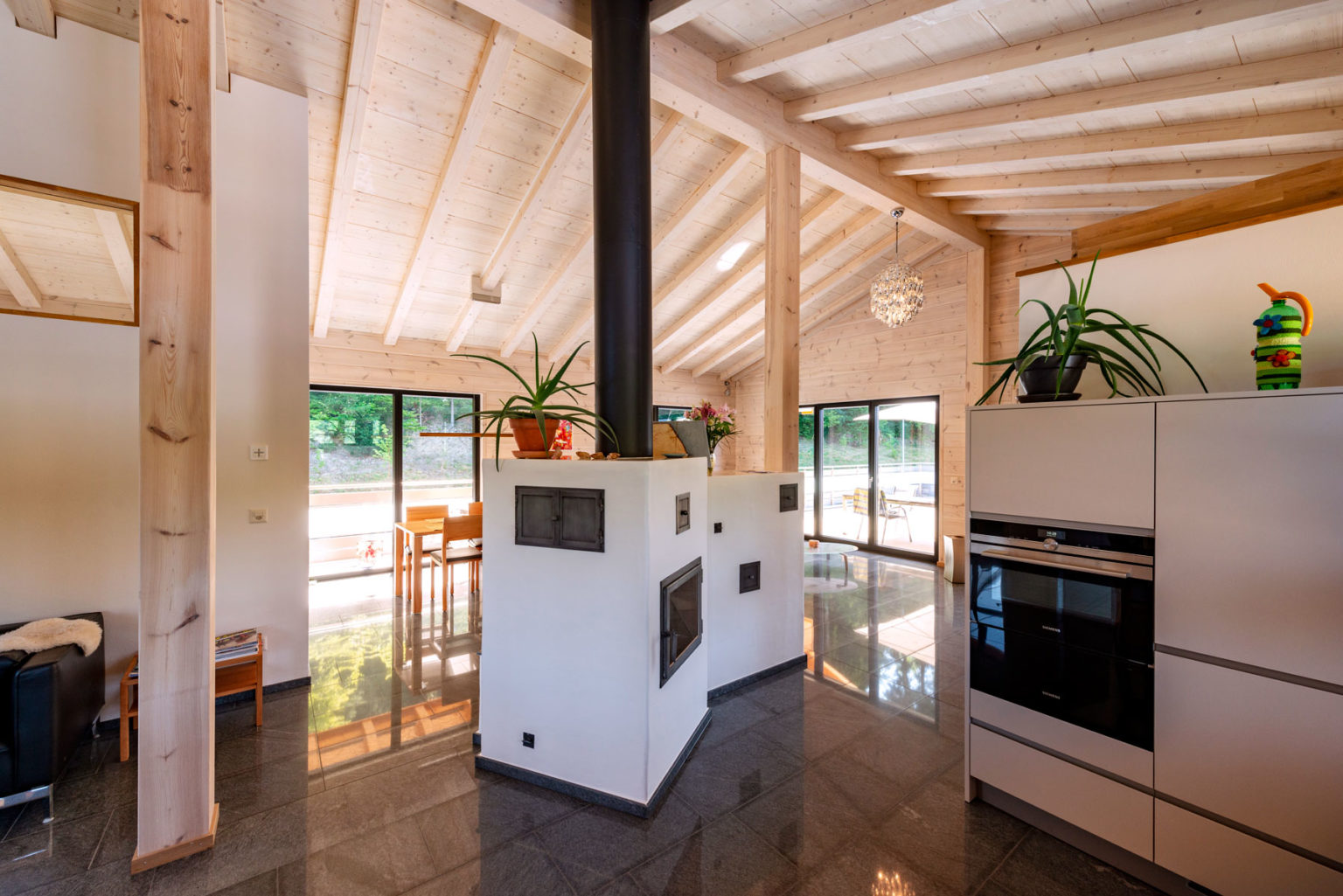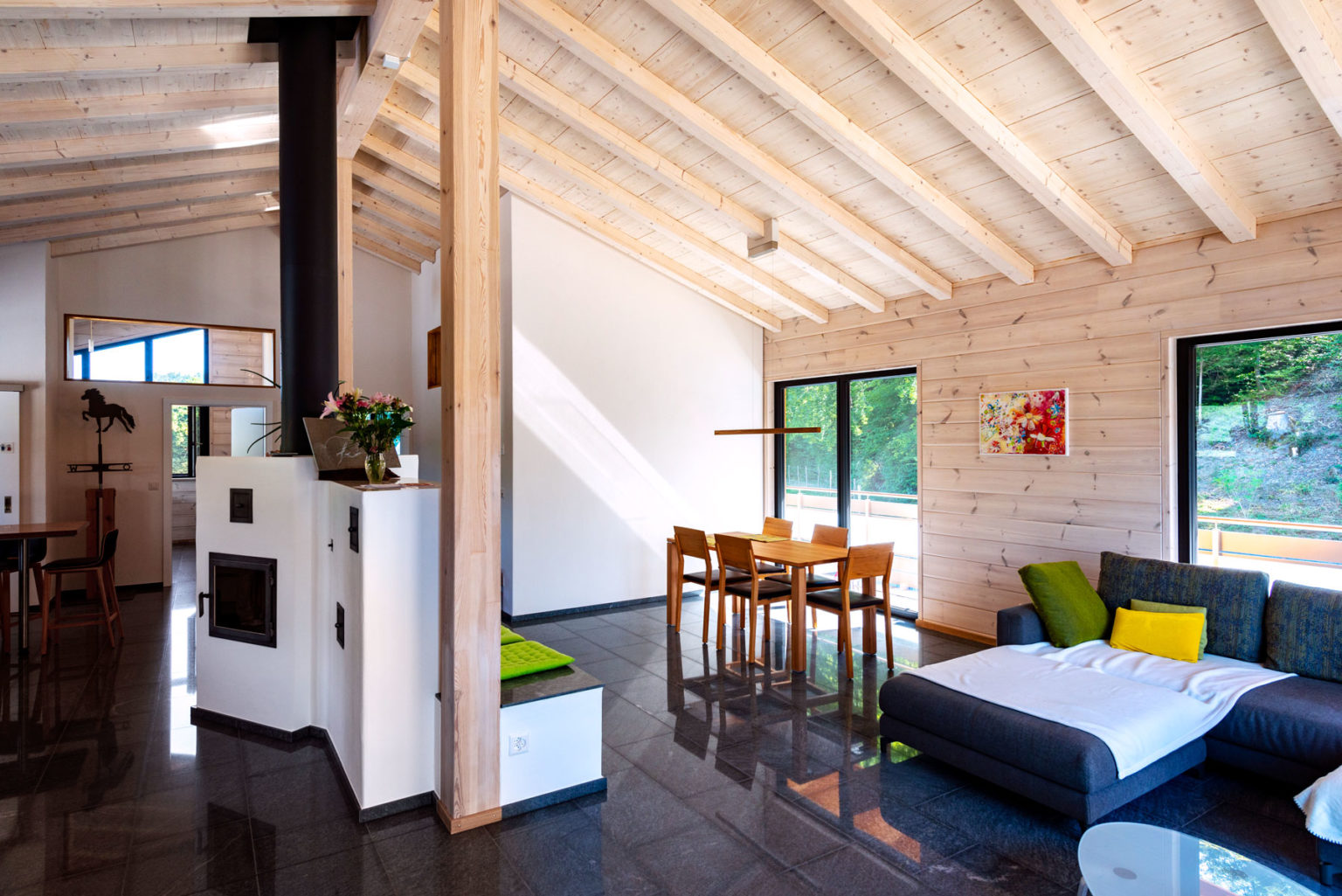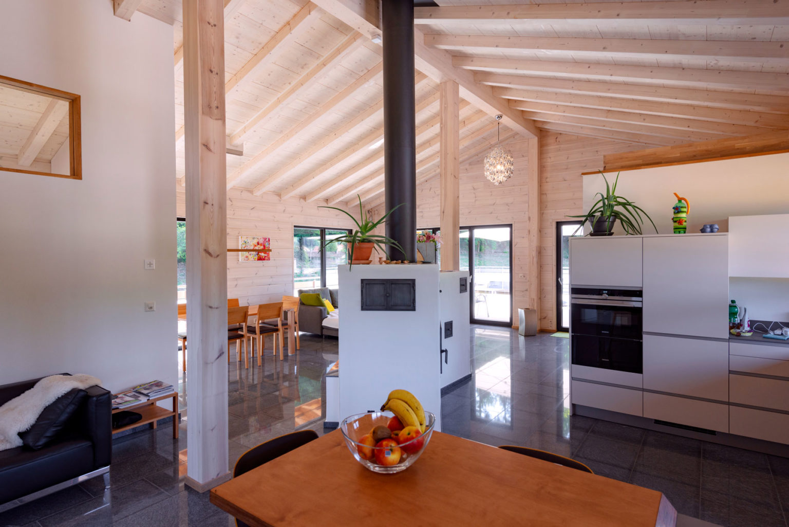 Die 27cm dicken Fertigwände aus Polarkiefernholz dämmen hervorragend, auch wenn Holzhaus Wynental keinen Minergie-Standard hat. "Wir haben eine Fußbodenheizung, die mittels Luft/Wasser-Wärmepumpe betrieben wird. Außerdem heizen wir mit unserem prachtvollen Kachelofen, der gleichzeitig als Raumteiler fungiert. Da die dicken Blockwände super isolieren, brauchen wir kaum zu heizen: Unsere Fußbodenheizung läuft im Winter auf der niedrigsten Stufe!", freut sich Manfred Jodelbauer, und Annette Baumgartner ergänzt: "Die Holzwände machen es schön heimelig und behaglich im Haus, das lieben wir. Auch das Raumklima ist zu jeder Jahreszeit angenehm!"