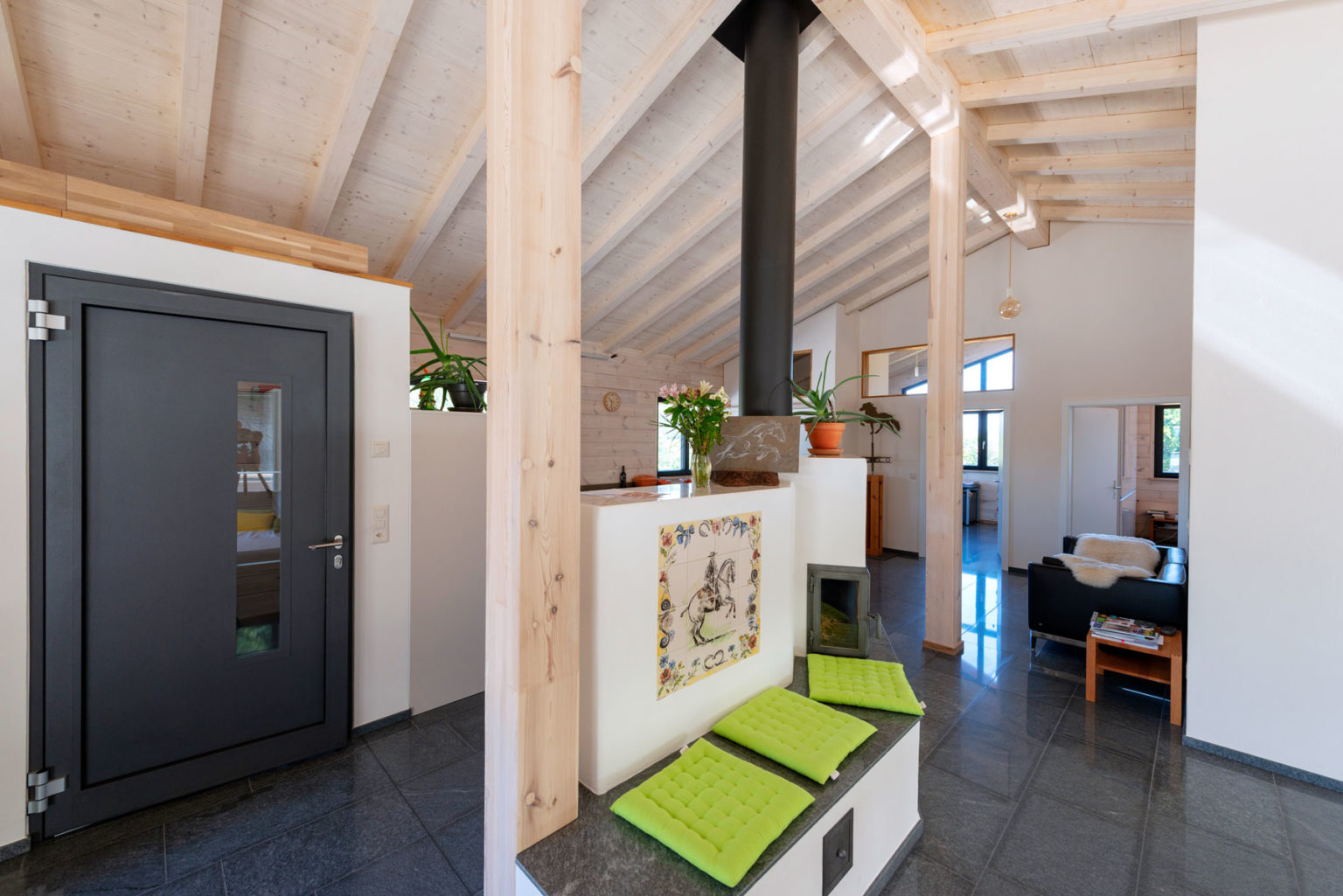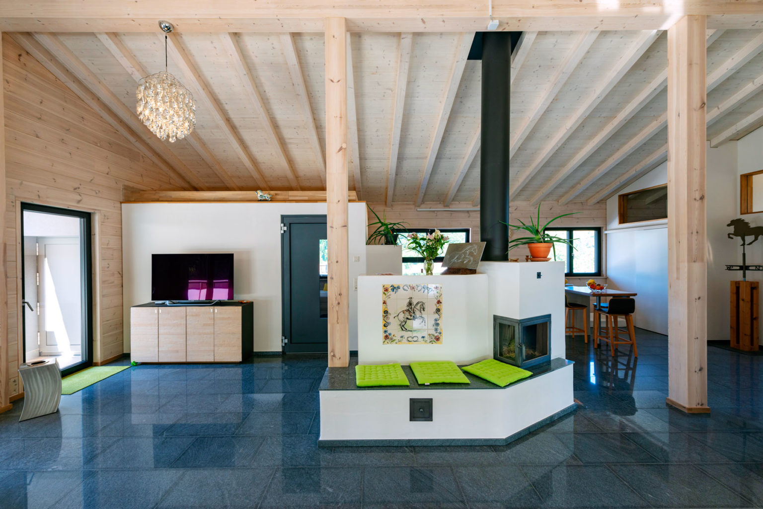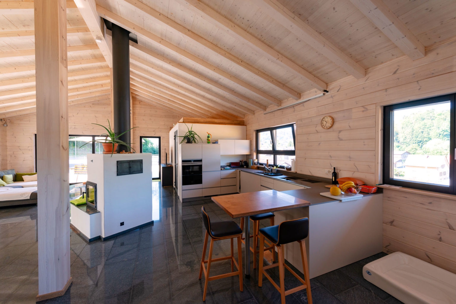 Die 27cm dicken Fertigwände aus Polarkiefernholz dämmen hervorragend, auch wenn Holzhaus Wynental keinen Minergie-Standard hat. "Wir haben eine Fußbodenheizung, die mittels Luft/Wasser-Wärmepumpe betrieben wird. Außerdem heizen wir mit unserem prachtvollen Kachelofen, der gleichzeitig als Raumteiler fungiert. Da die dicken Blockwände super isolieren, brauchen wir kaum zu heizen: Unsere Fußbodenheizung läuft im Winter auf der niedrigsten Stufe!", freut sich Manfred Jodelbauer, und Annette Baumgartner ergänzt: "Die Holzwände machen es schön heimelig und behaglich im Haus, das lieben wir. Auch das Raumklima ist zu jeder Jahreszeit angenehm!"