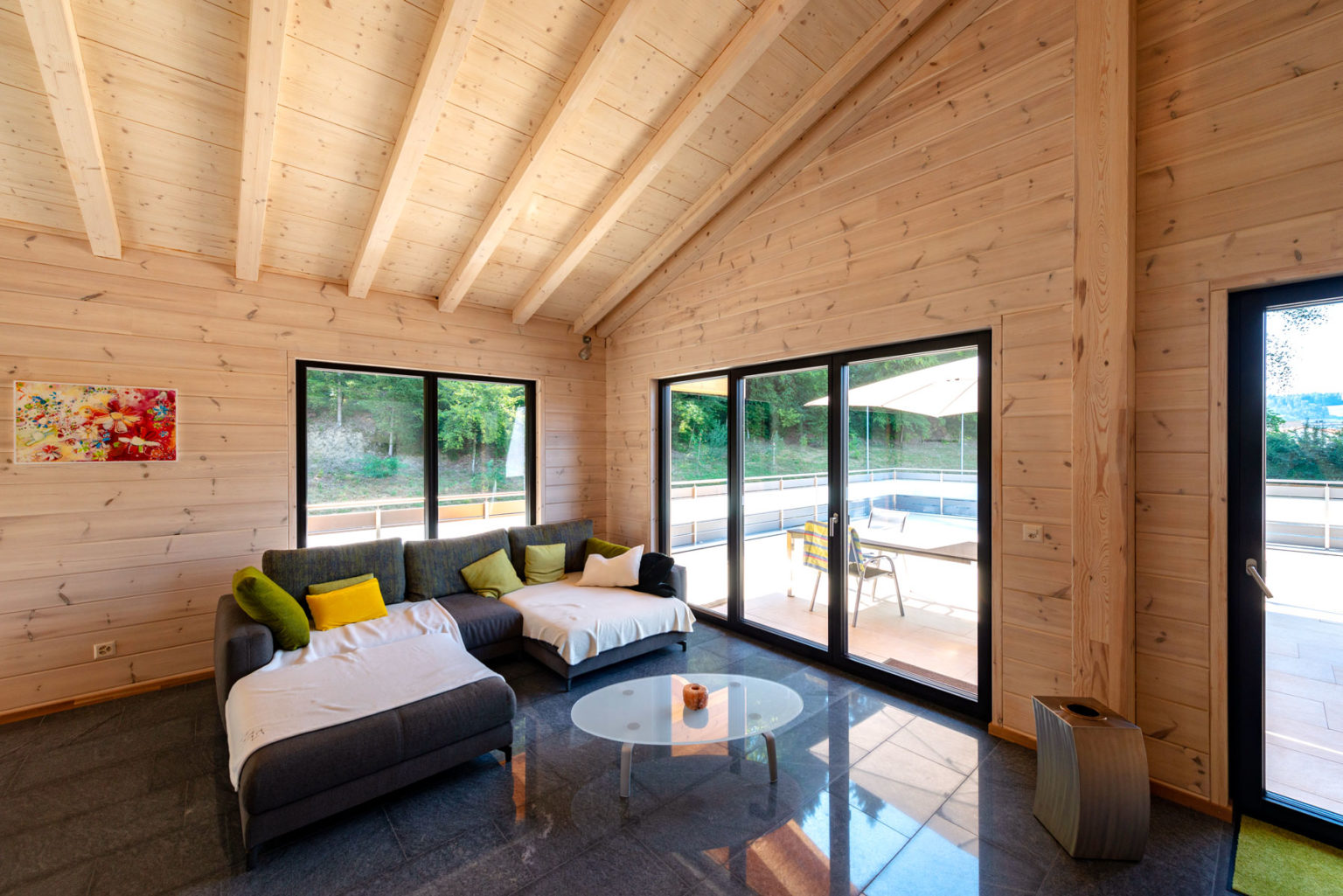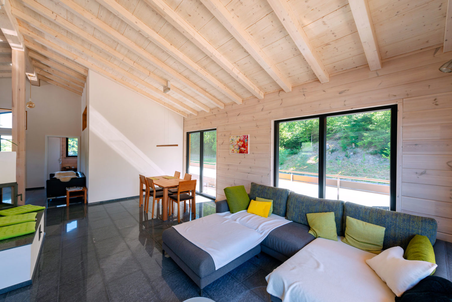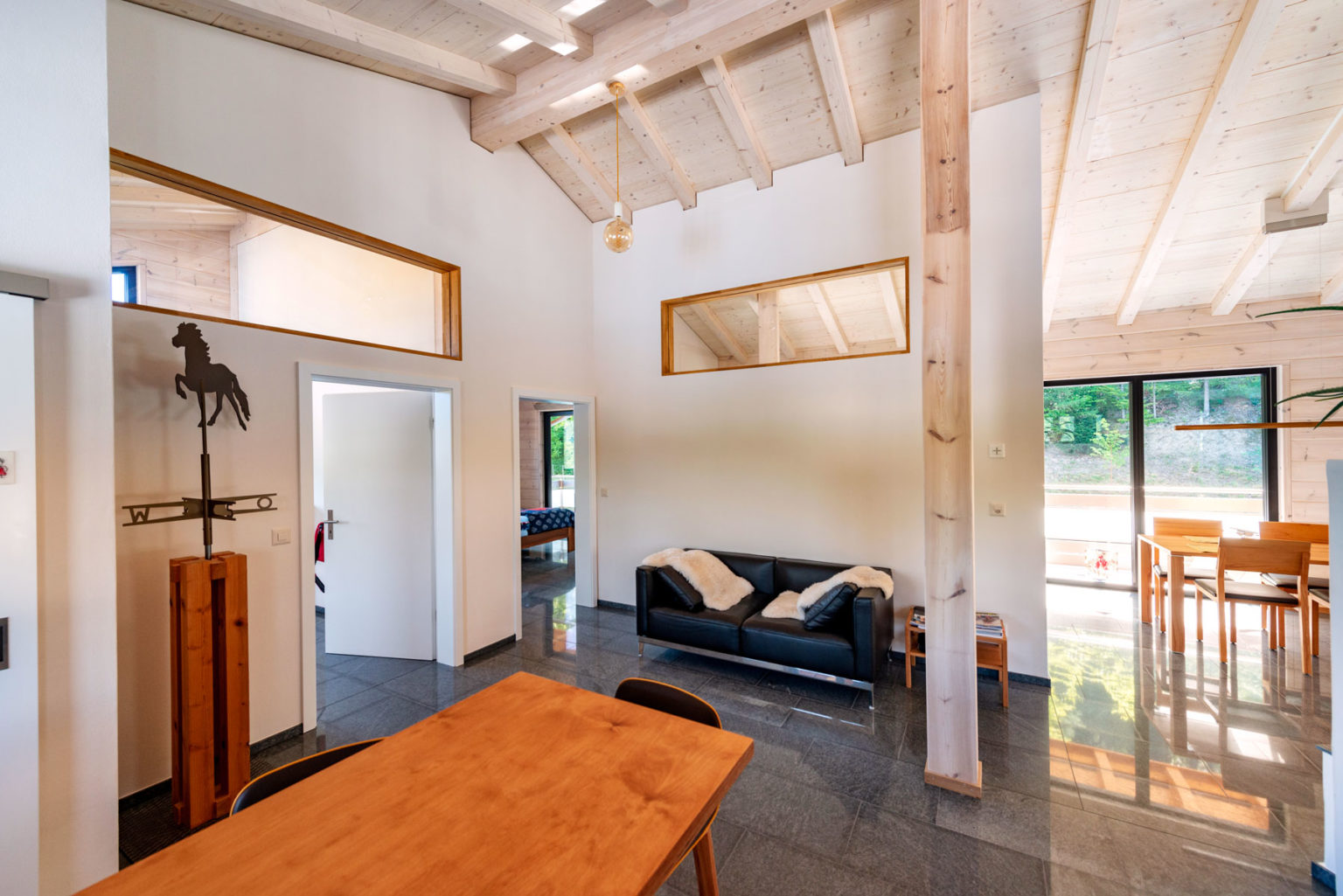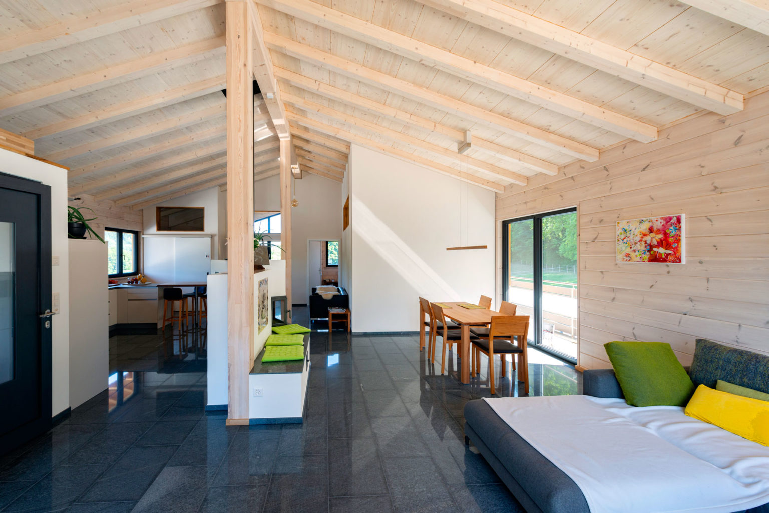 Um ein für ihren Geschmack Zuviel an Holz zu vermeiden, wählte das Eigentümerpaar Granitfliesen aus dem Tessin als Bodenbelag, anstelle von Holzdielen. Außerdem setzten sie leichte Ständerwände als Raumtrenner, die sie weiß verkleideten. Die Fensterrahmen sind innen aus anthrazit gestrichenem Holz und außen aus Aluminium, ebenfalls in anthrazit, was farblich mit dem Granitboden und dem Hausdach identisch ist. Moderne, geradlinige Möbel unterstreichen den modernen Charakter von Holzhaus Wynental, ohne dass dessen Holzhaus-Charme verloren geht. Durch den einheitlich im gesamten Wohnhaus gelegten Granitboden entsteht noch mehr Weitläufigkeit aber auch optische Ruhe im Holzhaus. Ergänzt wird das Gestein im Bad mit weißen Marmor-Wandfliesen, die ebenfalls aus dem Tessin stammen.