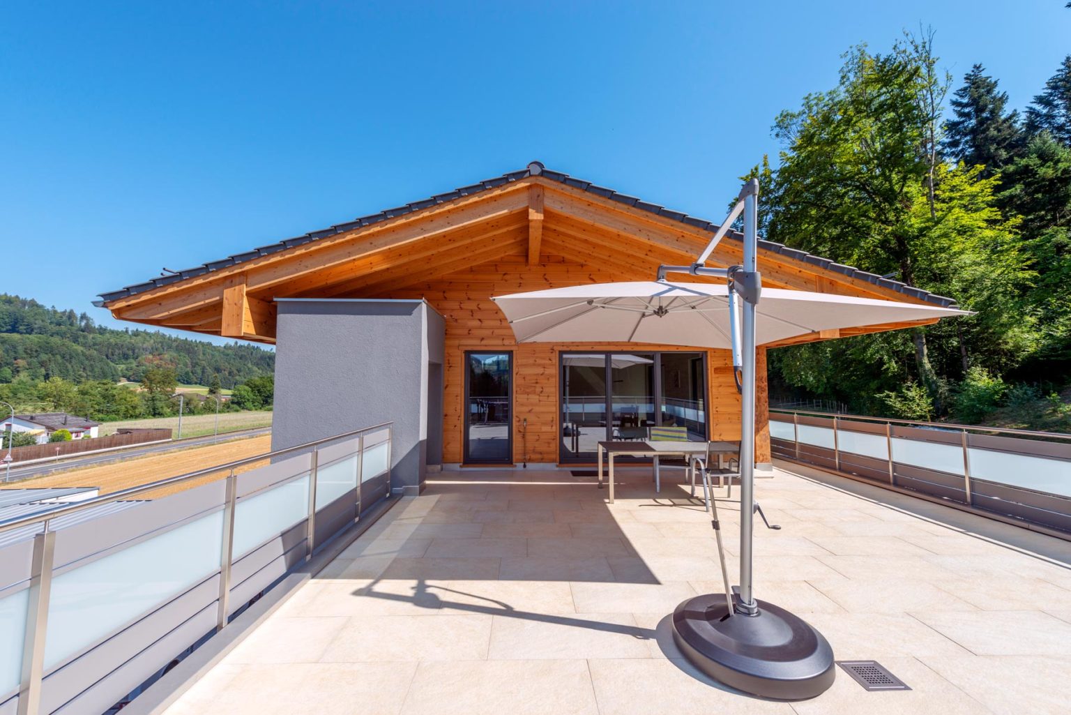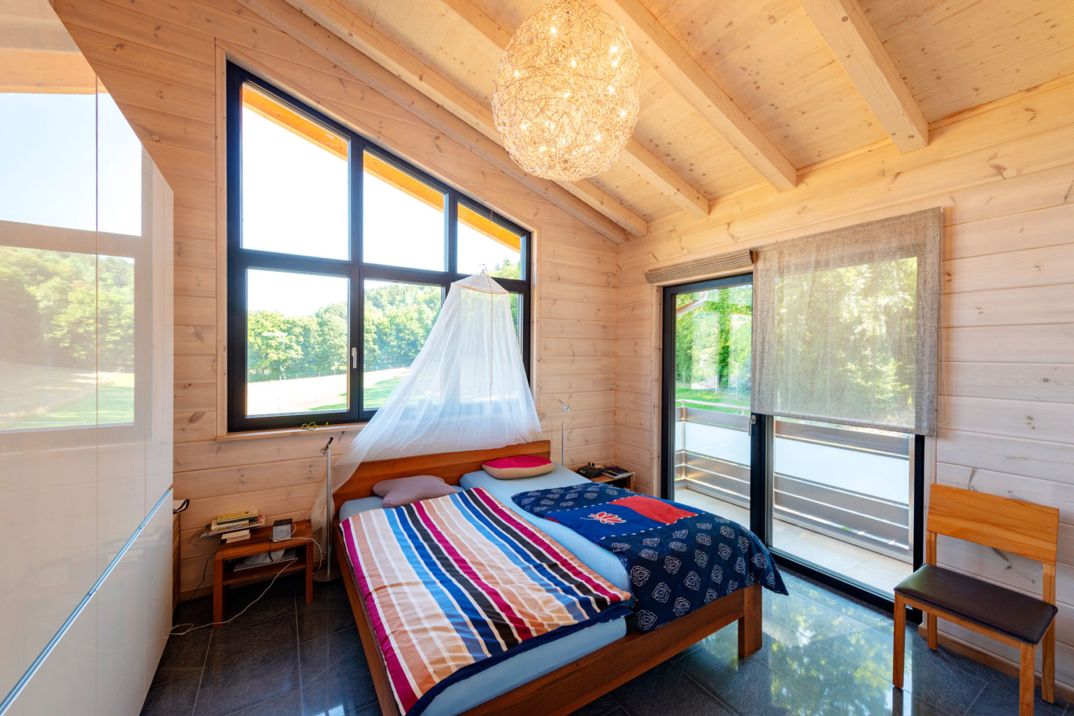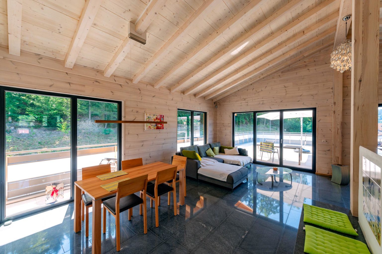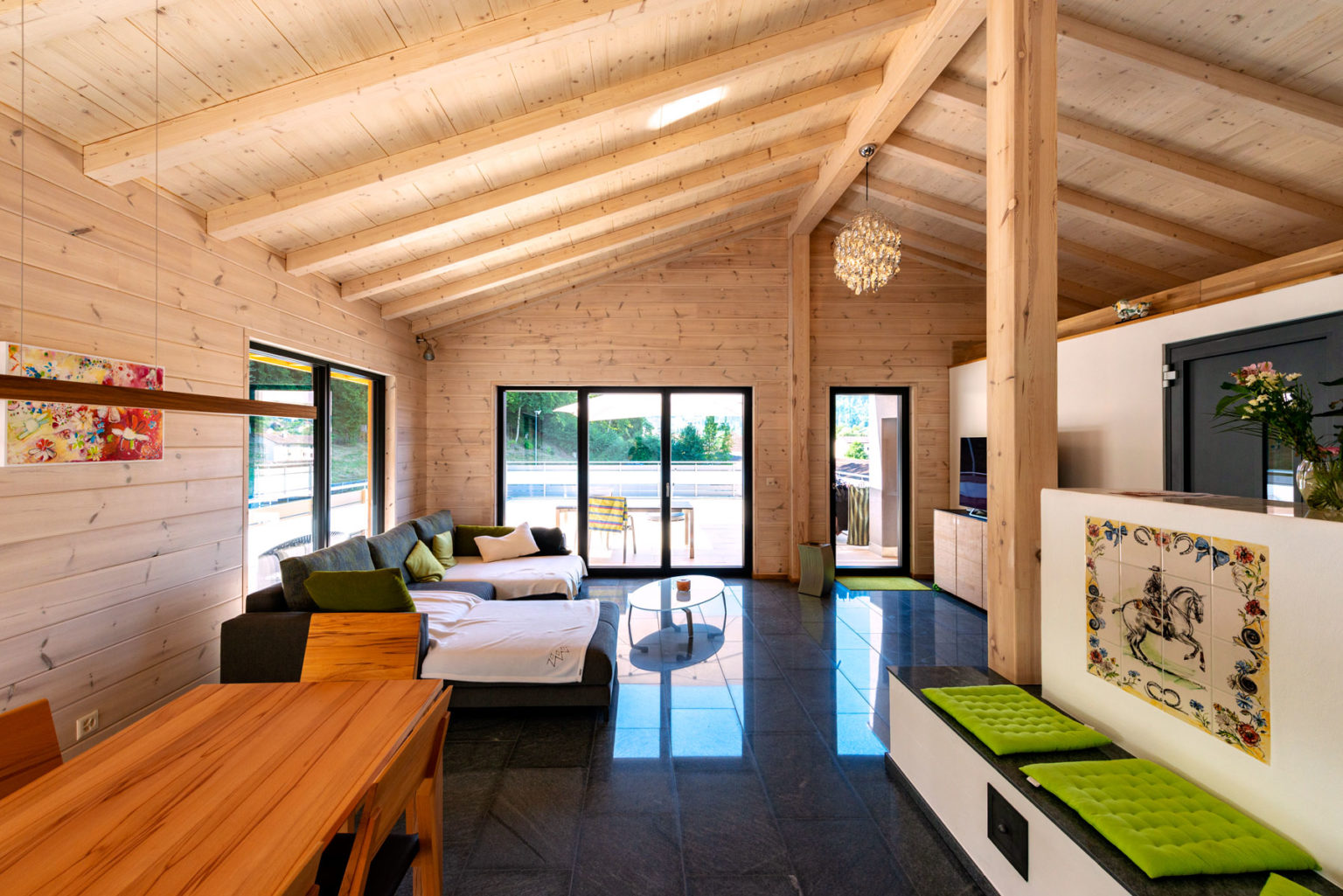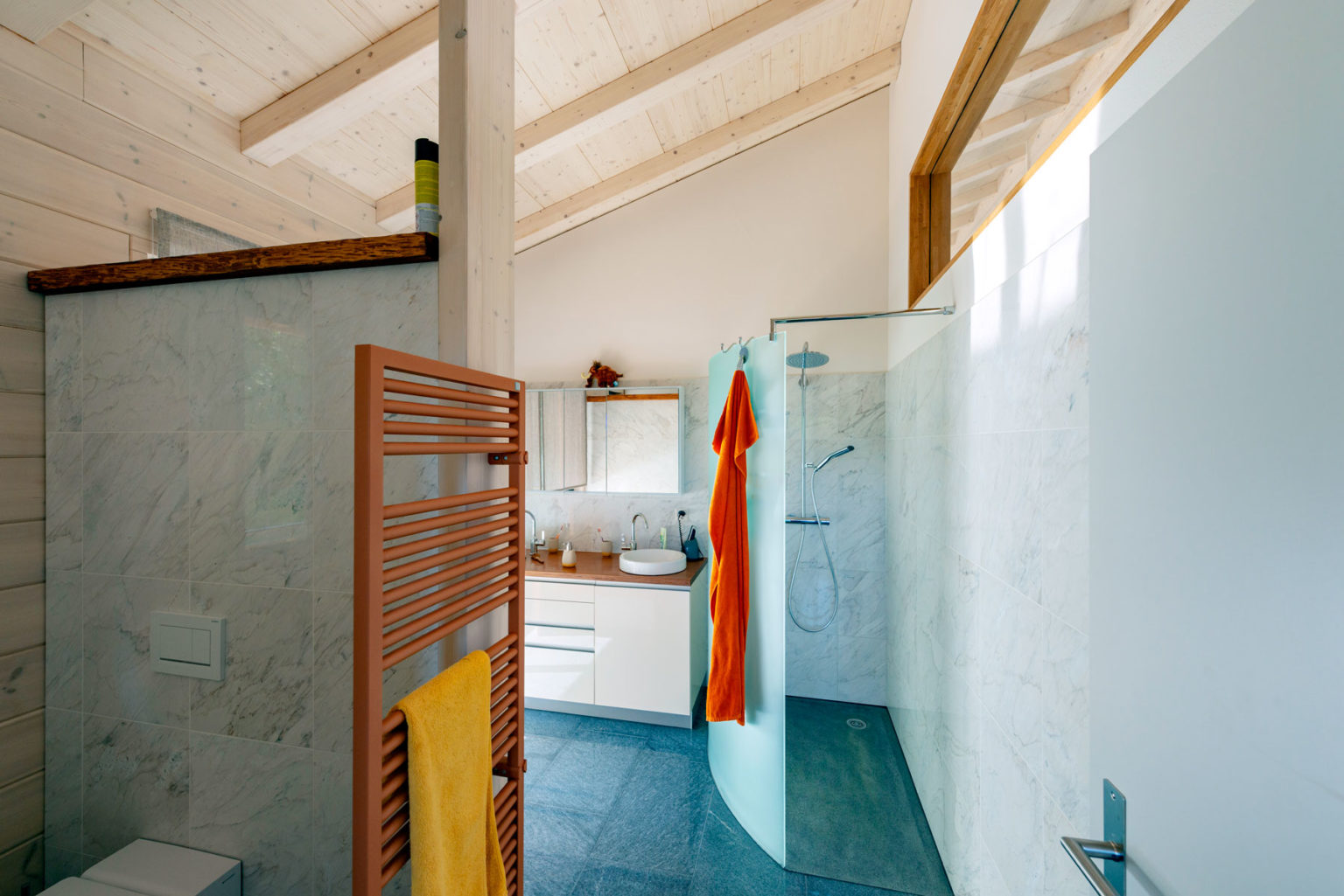 Um ein für ihren Geschmack Zuviel an Holz zu vermeiden, wählte das Eigentümerpaar Granitfliesen aus dem Tessin als Bodenbelag, anstelle von Holzdielen. Außerdem setzten sie leichte Ständerwände als Raumtrenner, die sie weiß verkleideten. Die Fensterrahmen sind innen aus anthrazit gestrichenem Holz und außen aus Aluminium, ebenfalls in anthrazit, was farblich mit dem Granitboden und dem Hausdach identisch ist. Moderne, geradlinige Möbel unterstreichen den modernen Charakter von Holzhaus Wynental, ohne dass dessen Holzhaus-Charme verloren geht. Durch den einheitlich im gesamten Wohnhaus gelegten Granitboden entsteht noch mehr Weitläufigkeit aber auch optische Ruhe im Holzhaus. Ergänzt wird das Gestein im Bad mit weißen Marmor-Wandfliesen, die ebenfalls aus dem Tessin stammen.