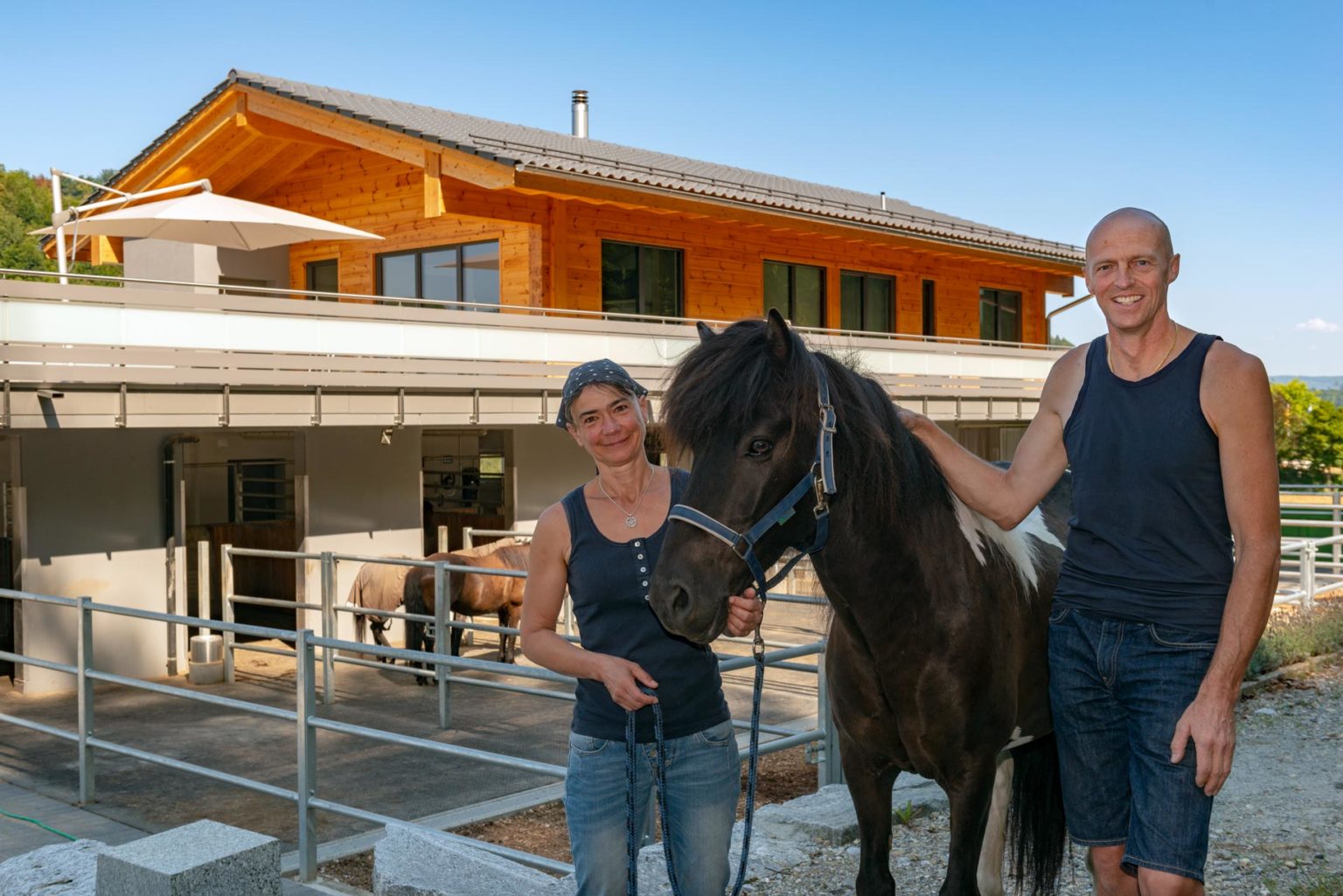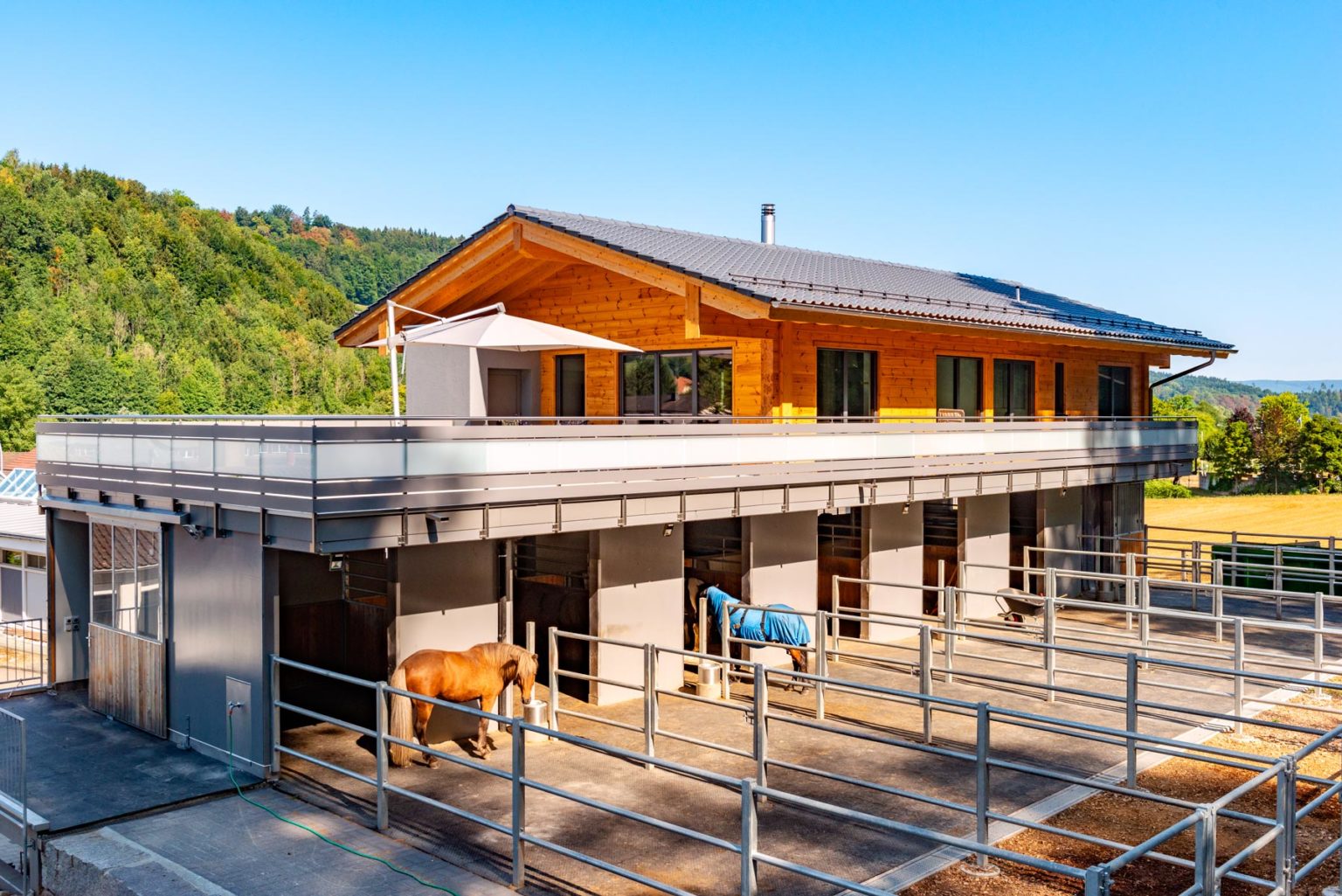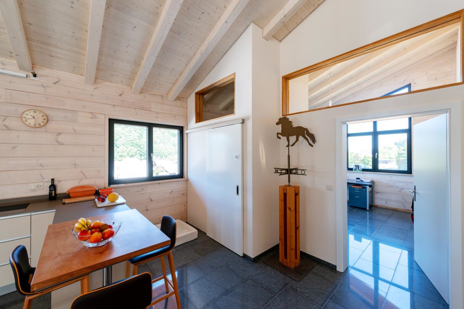 Die Pferdeställe und Wirtschaftsräume mussten schnell fertig werden, da gab es einen konkreten Termin; mit dem Wohnhaus konnte sich das Paar aber Zeit lassen. Sie wohnten solange in ihrem anderen Haus, das heute noch von drei der vier erwachsenen Söhne bewohnt wird. Dennoch ging die Hausmontage dann sehr schnell: "Die Abwicklung mit Fullwood funktionierte super und alles ging sehr schnell. Wir haben uns von der Firma die Haushülle komplett bauen lassen, ohne die Innenwände. Dann haben wir uns das alles innen angeschaut und entschieden, wie wir die Trennwände letztendlich setzen wollten, und welchen Boden wir verlegen.", erzählt Annette Baumgartner. Insgesamt brauchten sie fast zwei Jahre für den Innenausbau und die Einrichtung. Dafür engagierten sie ortsansässige Handwerker. "Die Idee mit den innenliegenden Fenstern vom Bad, Gäste-WC und Arbeitszimmer zum Wohnbereich kam uns spontan. Nun ist alles perfekt für uns!", strahlt Annette. Sie und Manfred genießen es mit ihren Pferden zusammen zu leben und diese stets im Blick zu haben, ob aus dem Holzhaus heraus oder von der großen Sonnenterrasse aus. Schöner kann es für Pferdemenschen nicht sein.
