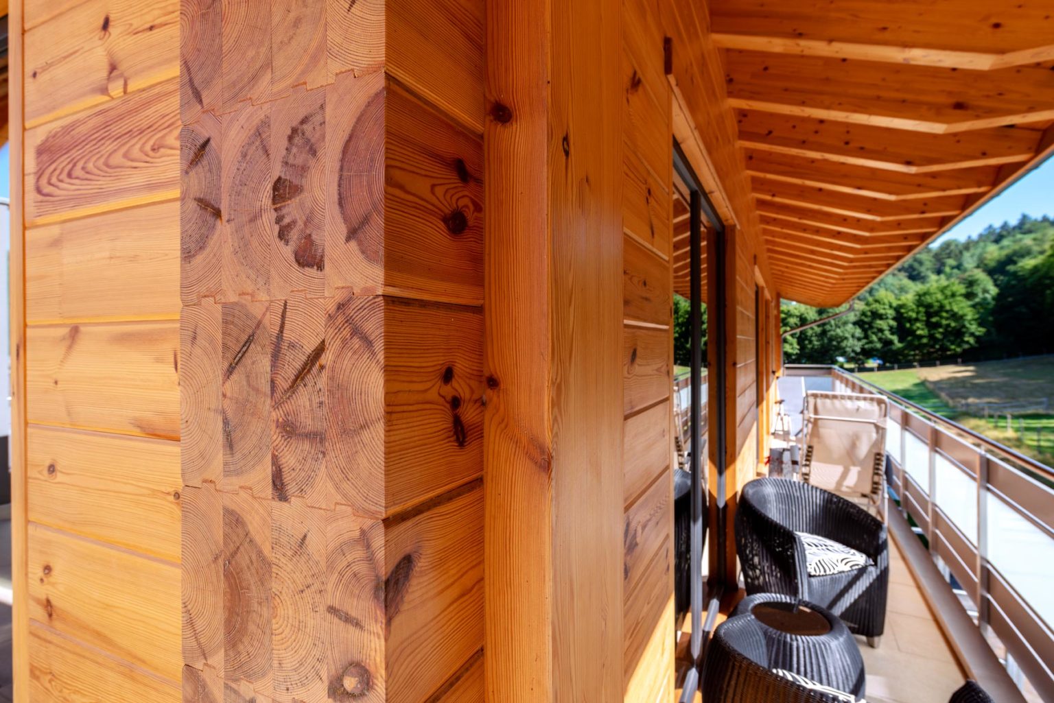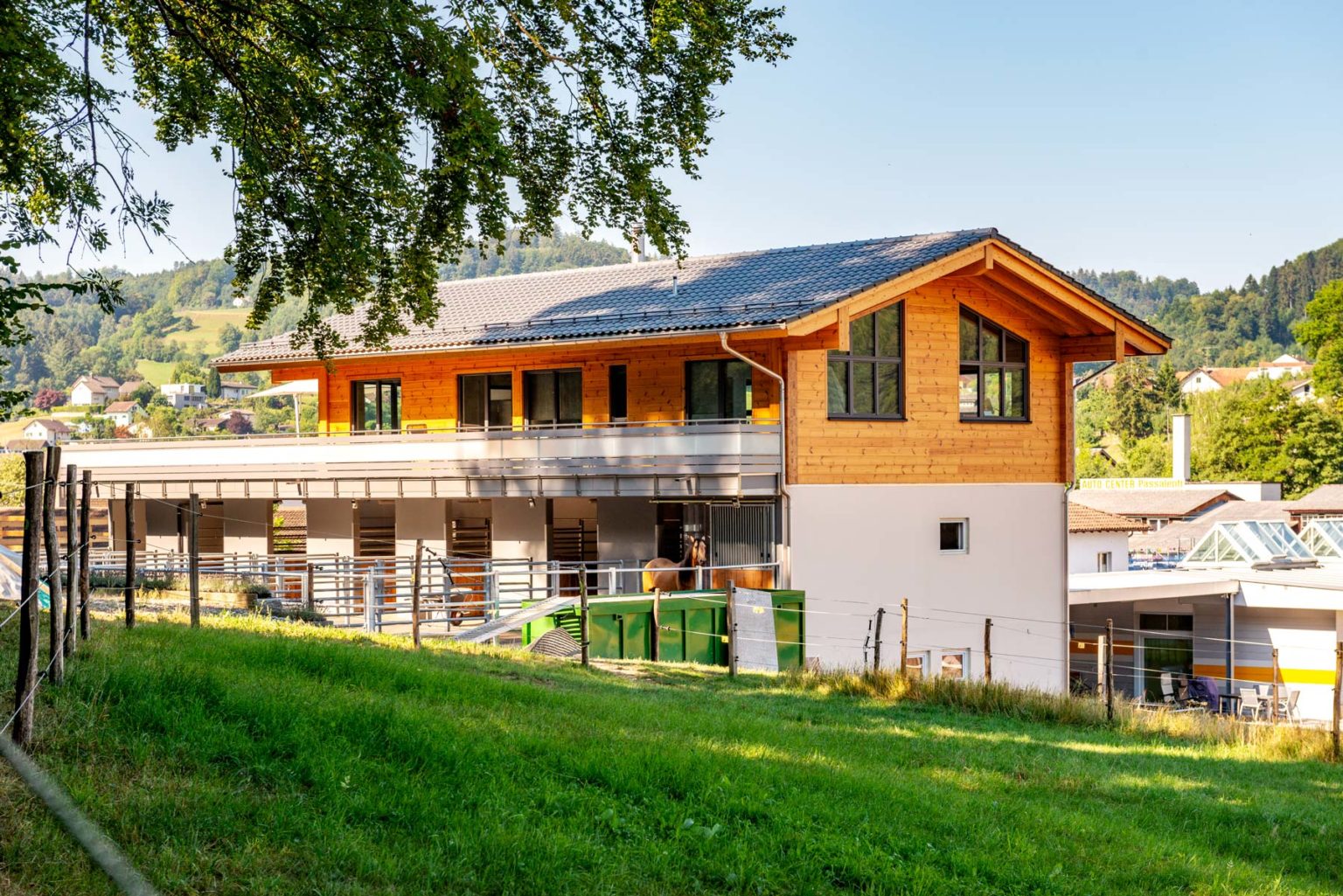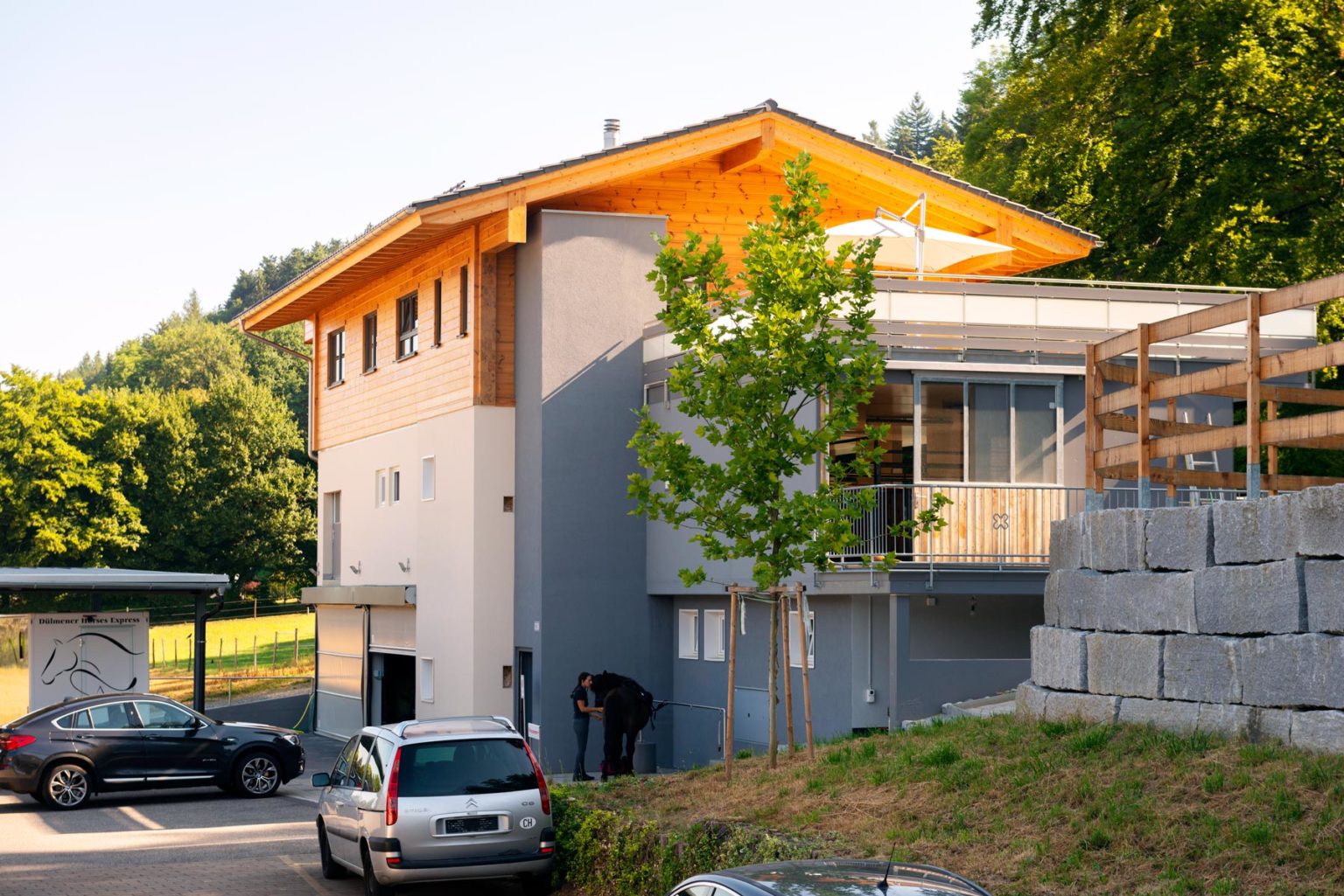Die Pferdeställe und Wirtschaftsräume mussten schnell fertig werden, da gab es einen konkreten Termin; mit dem Wohnhaus konnte sich das Paar aber Zeit lassen. Sie wohnten solange in ihrem anderen Haus, das heute noch von drei der vier erwachsenen Söhne bewohnt wird. Dennoch ging die Hausmontage dann sehr schnell: "Die Abwicklung mit Fullwood funktionierte super und alles ging sehr schnell. Wir haben uns von der Firma die Haushülle komplett bauen lassen, ohne die Innenwände. Dann haben wir uns das alles innen angeschaut und entschieden, wie wir die Trennwände letztendlich setzen wollten, und welchen Boden wir verlegen.", erzählt Annette Baumgartner. Insgesamt brauchten sie fast zwei Jahre für den Innenausbau und die Einrichtung. Dafür engagierten sie ortsansässige Handwerker. "Die Idee mit den innenliegenden Fenstern vom Bad, Gäste-WC und Arbeitszimmer zum Wohnbereich kam uns spontan. Nun ist alles perfekt für uns!", strahlt Annette. Sie und Manfred genießen es mit ihren Pferden zusammen zu leben und diese stets im Blick zu haben, ob aus dem Holzhaus heraus oder von der großen Sonnenterrasse aus. Schöner kann es für Pferdemenschen nicht sein.
