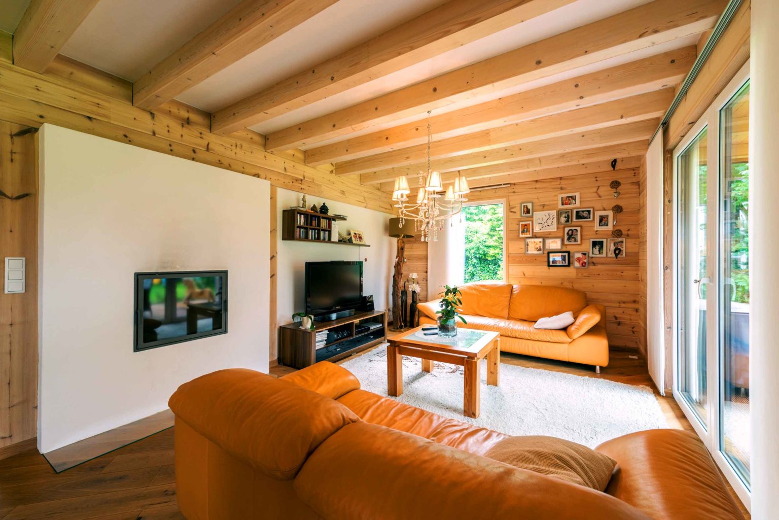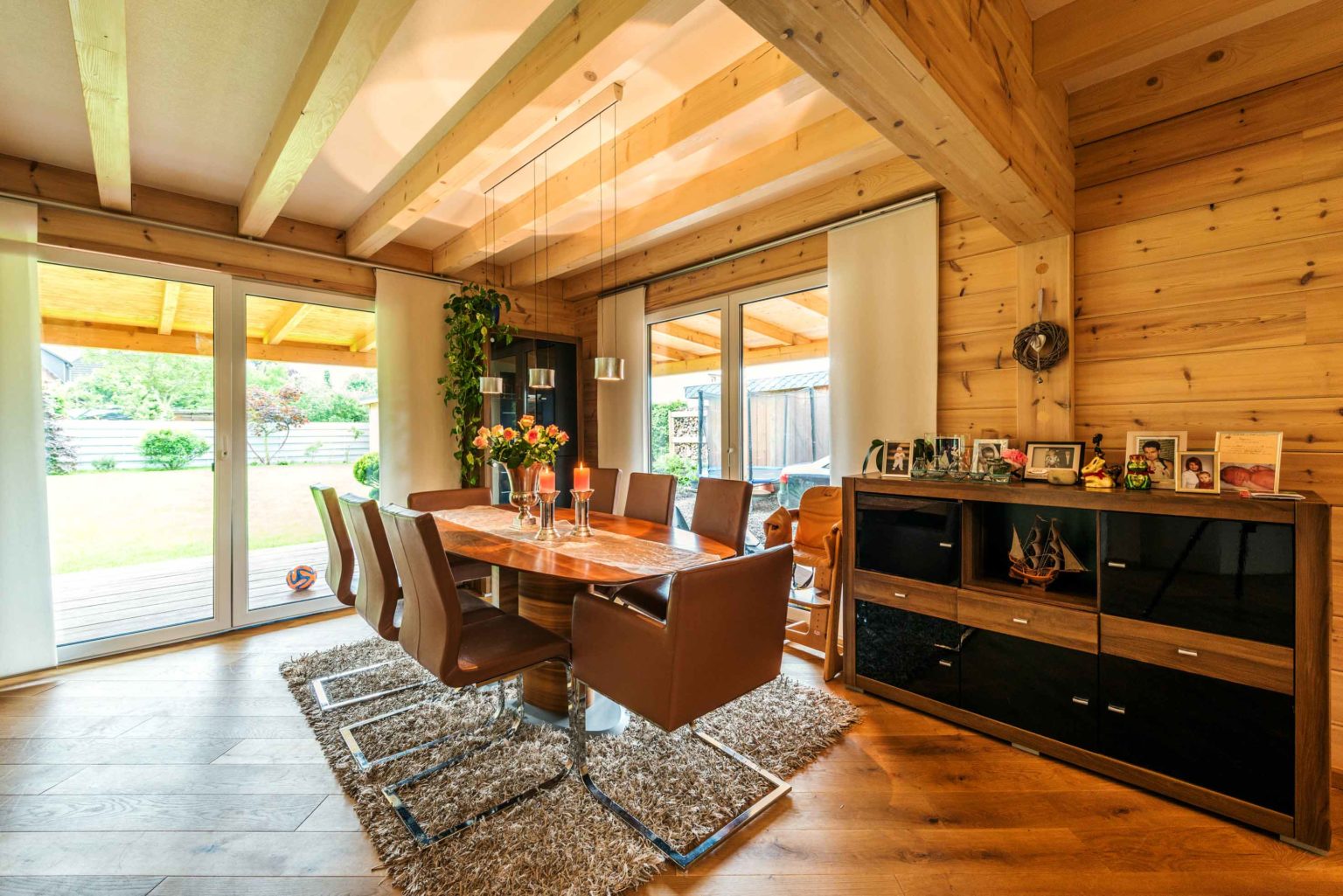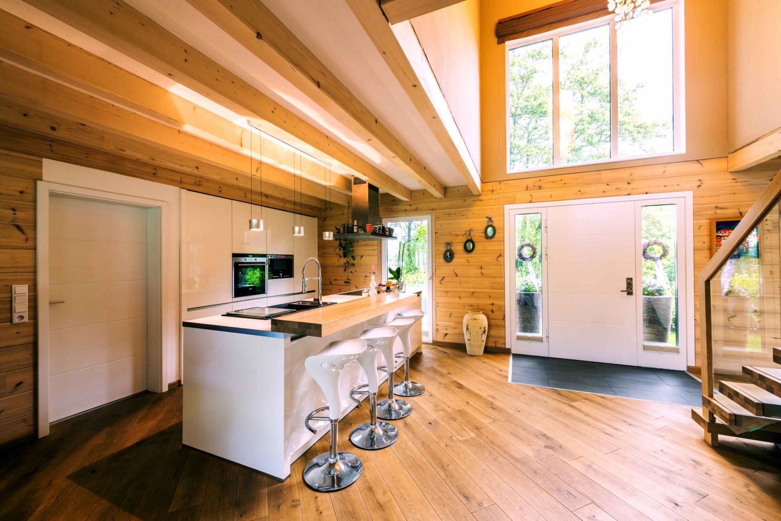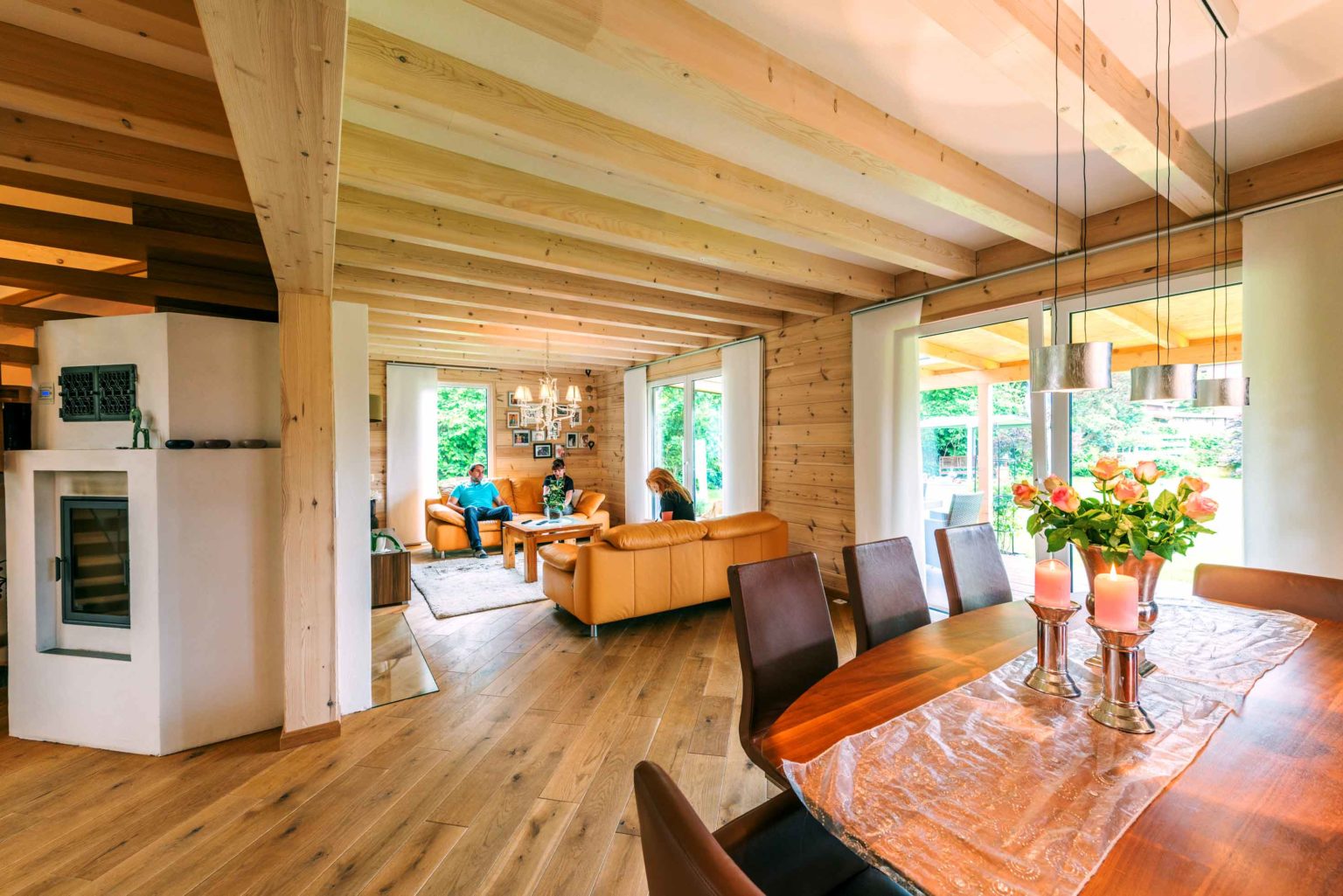 „Da ich als Zimmermann für Fullwood schon oft als „Richtmeister“ tätig war, brauchte ich nur die Hauswände von der Firma produzieren lassen und war mein eigener Richtmeister. Die hervorragende Qualität der Vollholzwände kannte ich ja schon von meinem ersten massiven Holzhaus und ich wusste, dass die Montage der in der Werkstatt passgenau vorgefertigten Wandelemente reibungslos vonstattengeht. Durch die garantierte Setzungsfreiheit der Vollholzwände, war auch eine Kombination mit den Kombiblockwandelementen kein Problem.“, schwärmt Jürgen Buck, und fährt fort: „Zusammen mit einem meiner Angestellten habe ich mein neues Holzhaus aufgebaut und den Innenausbau dann ebenfalls von einem Angestellten machen lassen.“ Absolut winddicht sind die Wände von Fullwood auch und sie erfüllen locker die aktuellen Energieeinsparverordnungen. Holzhaus „Zevener Geest“ besitzt sogar Effizienzhausstandart. Beheizt wird das Gebäude ausschließlich mit einem großen, wasserführenden Kaminofen, der ungefähr mittig im Holzhaus platziert ist und von zwei Seiten befeuerbar ist. Er besitzt zwei Glasscheiben – die eine zur Sofaecke, die andere zur Küche und dem Eingangsbereich ausgerichtet – so dass das attraktive Flammenspiel vielerorts sichtbar ist, und neben seiner Strahlungswärme auch vermehrt optische Gemütlichkeit verbreitet. Hell und modern, aber auch gemütlich ist es im ganzen Haus! In den sonnigen Monaten unterstützt eine solare Warmwasseranlage die Wassererwärmung.