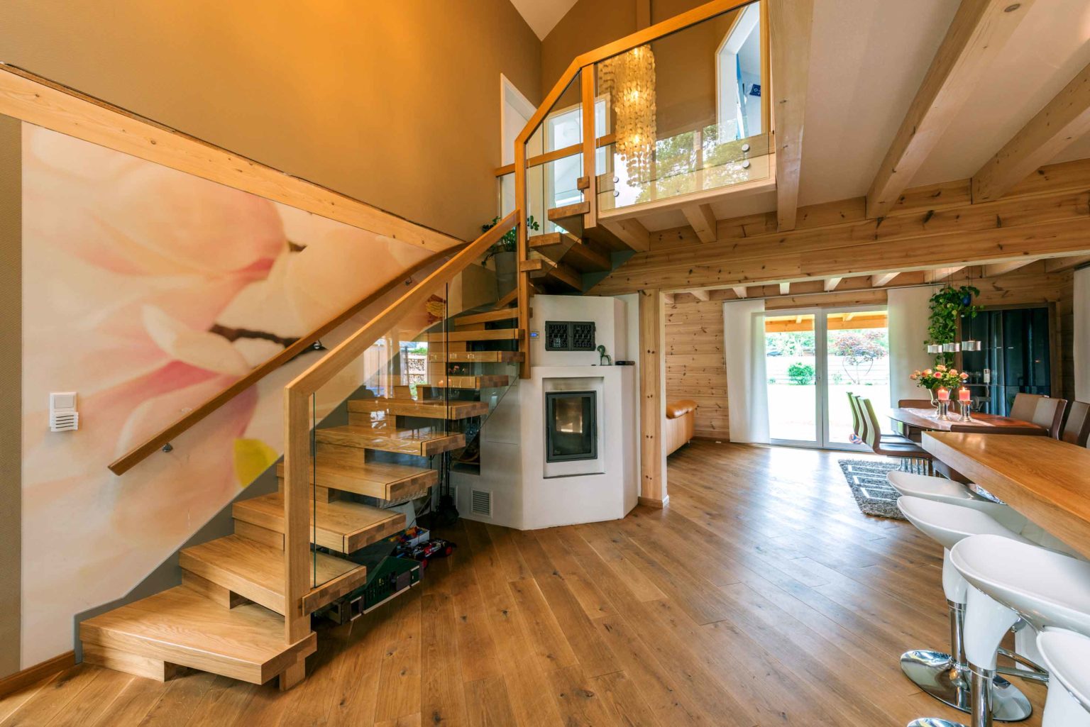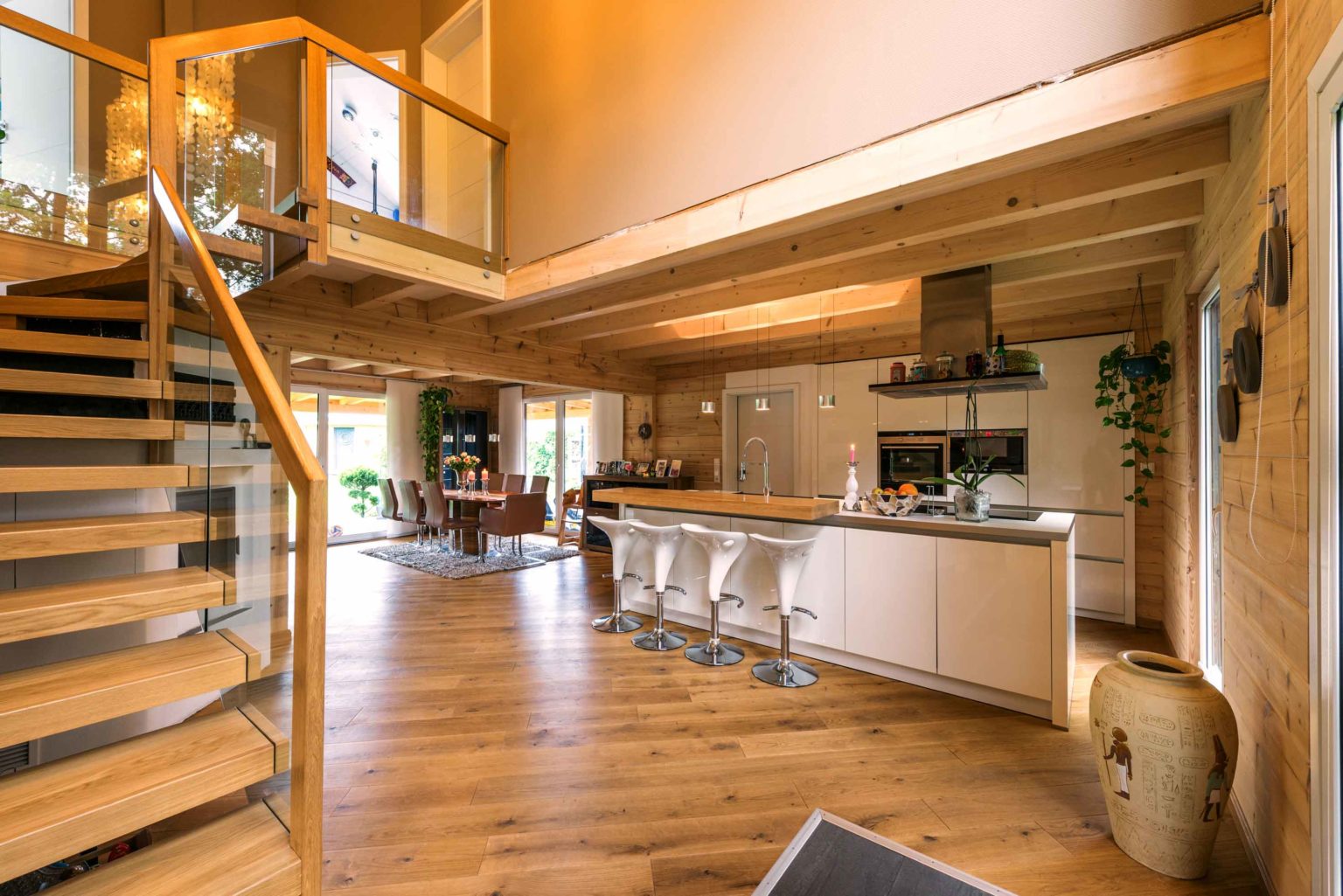 „Die naturhellen Kiefernwände haben wir außen mit einem Vergrauungsschutz gestrichen, damit sie ihre Optik erhalten. Dazu gefiel uns für die verputzten Elemente ein helles, warme gelb, weil es fast denselben Ton hat, wie das Kiefernholz.“, sagt Jürgen Buck. Dazu kombinierte das Ehepaar Fenster, Türen und Dacheindeckung in anthrazit, um ein modernes Bild zu kreieren, und wählte fast ausschließlich bodentiefe Fenster in schlanker Rechteckform, die den modernen, sachlichen Look des Gebäudes unterstreichen. „Drinnen haben wir die Trennwände nicht komplett in weiß gestrichen, da uns der Kontrast zur warmen Holzfarbe zu stark gewesen wäre. Stattdessen haben wir größtenteils einen sanften, warmen Sand-Ton gewählt, der sehr modern wirkt.“, beschreibt die Hausherrin. Offene Holzbalken sind an der ansonsten weiß gestrichenen Geschossdecke sichtbar, während der Dachstuhl im Obergeschoss weiß verkleidet wurde. „Von den schönen Eichendielen im ganzen Haus und der passende Geschosstreppe dazu konnte ich meine Frau glücklicherweise überzeugen.“, freut sich der Hausherr. Recht hat er, denn der Fußboden trägt sehr zum hellen aber warmen Ambiente im Holzhaus bei. Die halb gewendelte Treppe wirkt transparent und modern, da ihre hellen Eichentritte fast im Raum zu schweben scheinen, und sie von einem Geländer aus hölzernem Handlauf und Glasscheiben auf die Galerie hinauf begleitet wird. „Damit alles noch größer und luftiger wird, haben wir uns für einen großflächigen offenen Wohnbereich entschieden, wo Eingangshalle, Küche, Esszimmer und Wohnzimmer fließend ineinander übergehen. Außerdem wollten wir auch vertikale Offenheit im Eingangsbereich, weshalb der Luftraum dort bis zum First offen ist.“, erklärt Lina Buck das Raumkonzept. Auch im Dachgeschoss sind alle Räume offen bis zum First und erhalten dadurch mehr Raumhöhe und Luftigkeit. Und um das sehr helle Innenlaben von Holzhaus „Zevener Geest“ noch mehr zu betonen, wählten die Hauseigentümer drinnen weiße Fensterrahmen und Türen.
