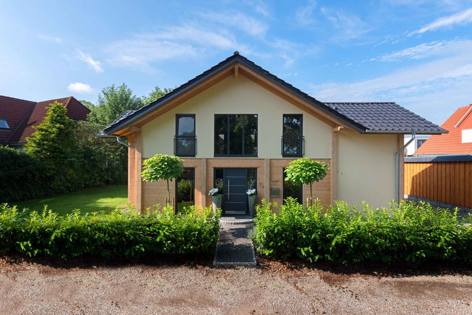 Was tun, wenn zwei, die sich lieben, ein Haus bauen wollen, aber die Geschmäcker weit auseinander gehen? Da heißt es Kompromisse machen, damit beide glücklich und zufrieden sind. Jürgen Buck und seiner Frau Lina ist dieses Kunststück gelungen, und dabei herausgekommen ist das schöne Einfamilien Holzhaus „Zevener Geest“. Da der Hausherr schon mit seinem ersten Holzhaus von Fullwood sehr zufrieden war, nahm das bauinteressierte Paar Kontakt zu dem Holzhausspezialisten auf, um sich beraten zu lassen. „Unsere gegensätzlichen Geschmäcker und Vorstellungen wurden dort ernst genommen, und man hat nicht versucht, mir meinen Haustraum auszureden, sondern möglichst alle Wünsche unter einen Hut zu bekommen.“, betont die Hausherrin. Überzeugt, dass ein helles, modernes Holzhaus ihr doch gefallen könnte, hatte sie der Besuch des Musterhauses: „Die glatten, hellen Außenwände des Musterhauses waren zwar aus massivem Kiefernholz, aber drinnen gab es weiß verputzte Trennwände, hohe, lichte Räume und große Fensterflächen, die alles sehr hell erscheinen ließen. Das kam mir alles sehr entgegen.“ Trotzdem sollte es auch äußerlich etwas weniger Holz sein, weshalb sich die Bucks für eine Kombination zweier Wandtypen entschieden: Die tragenden Außenwände des Erdgeschosses bestehen aus 20cm starken Kiefernbohlen (Vollholzwand), während die Wände des Dachgeschosses aus einer leichteren Holzständerwand bestehen, die außen hellgelb verputzt wurde.