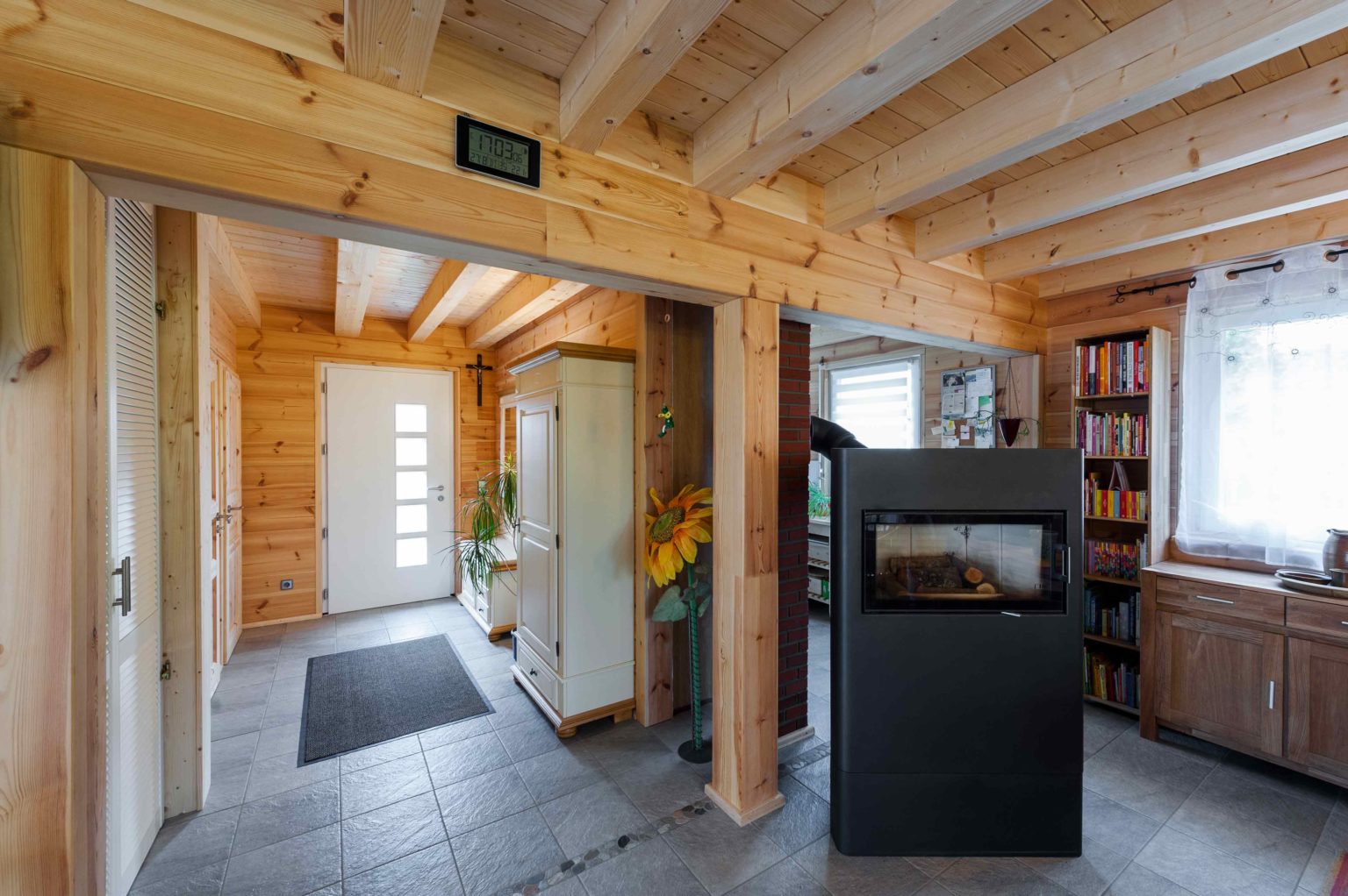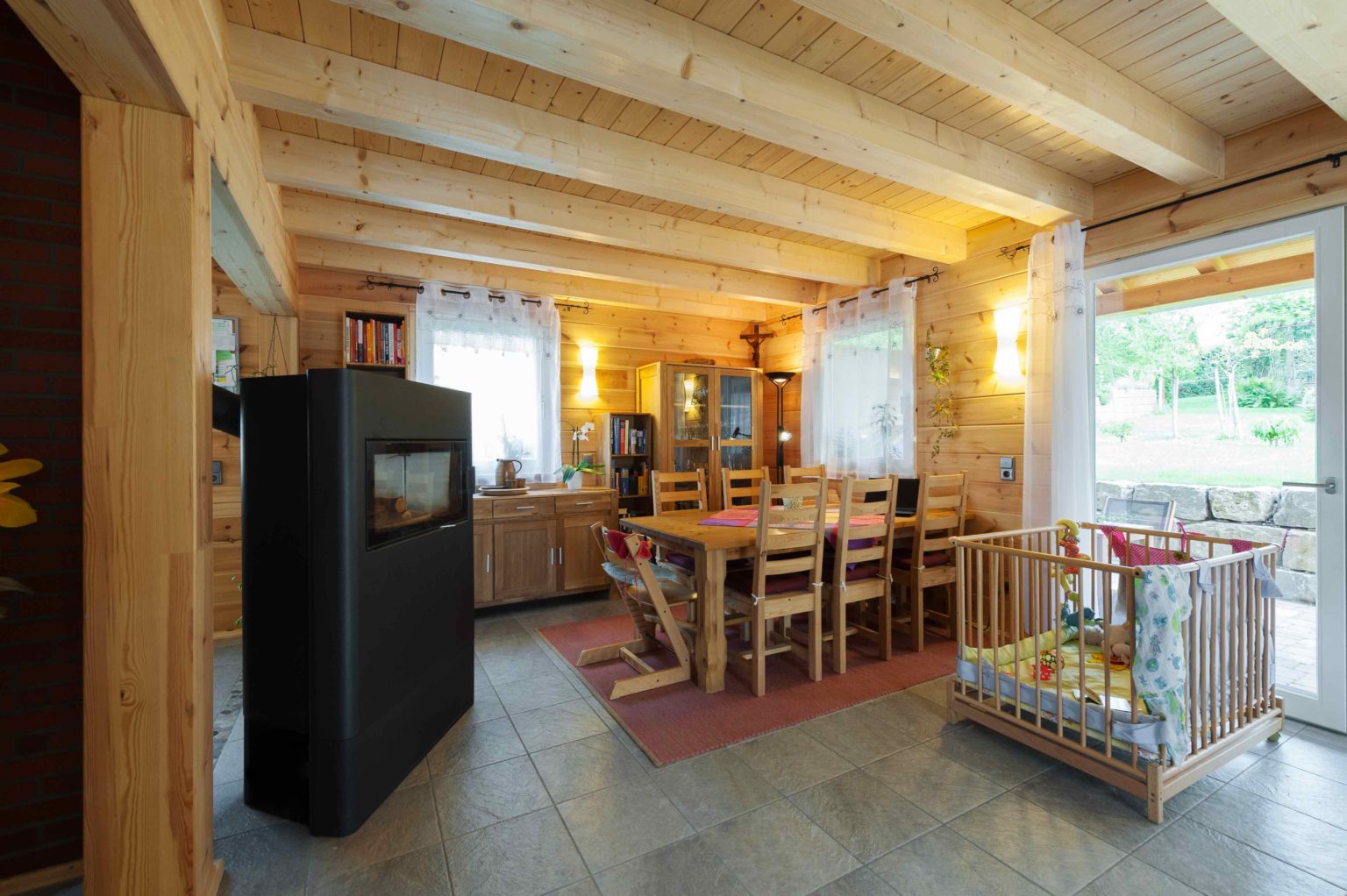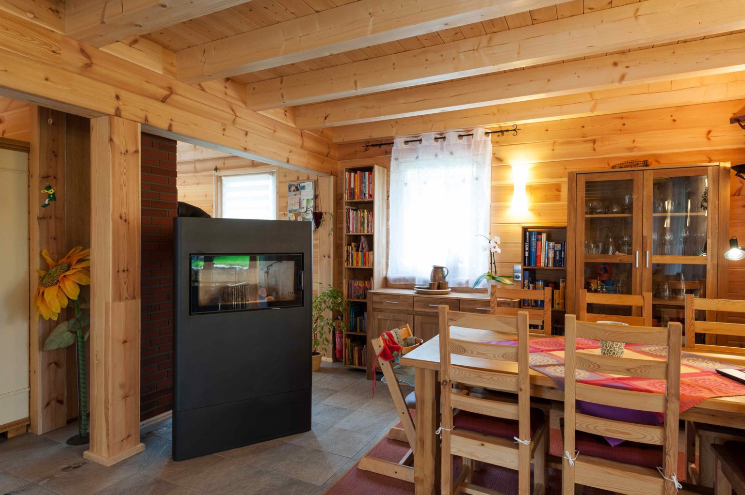 Schon lange schwärmte der Hausherr von massiven Holzhäusern, als er in einer Zeitschrift auf ein Musterhaus von Fullwood aufmerksam wurde. Bald darauf besuchte er zusammen mit seiner Frau ein Musterhaus des Holzhaus Spezialisten ganz in der Nähe, und war sofort begeistert von der hellen Optik des Gebäudes innen und außen. Auch die kompetente aber unaufdringliche Beratung der Firma gefiel ihm und schnell war man von der hohen Qualität überzeugt. Bei der Bemusterung und Heizungsart wurde den Bauherren freie Hand gelassen, so dass Holzhaus „Zollernalb“ heute über eine Fußbodenheizung von einer Ressourcen schonenden Holzpellets-Zentralheizung beheizt wird, die besonders in den Übergangszeiten noch von einer solaren Warmwassererwärmung unterstützt wird. Da die Kiefernwände hervorragend dämmen, braucht die Familie erst spät im Jahr (frühestens im November) anfangen zu heizen – und das trotz Kleinkind. Zusätzlich nutzen die Hausbewohner im offenen Wohnbereich einen voluminösen Kaminofen, dessen Brennfach besonders große Holzscheite aufnimmt. Der Ofen verbreitet schnell gemütliche Strahlungswärme, die sich über den Kaminabzug auch im Dachgeschoss ausbreitet, und der Blick durch die große Glasscheibe auf die lodernden Flammen zaubert sofort eine unnachahmliche Gemütlichkeit herbei.