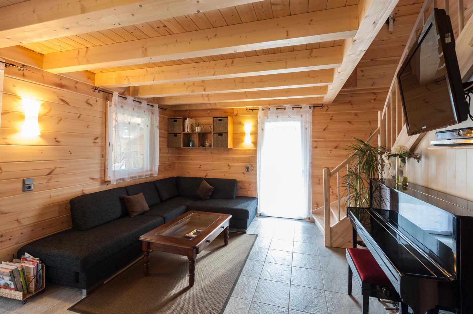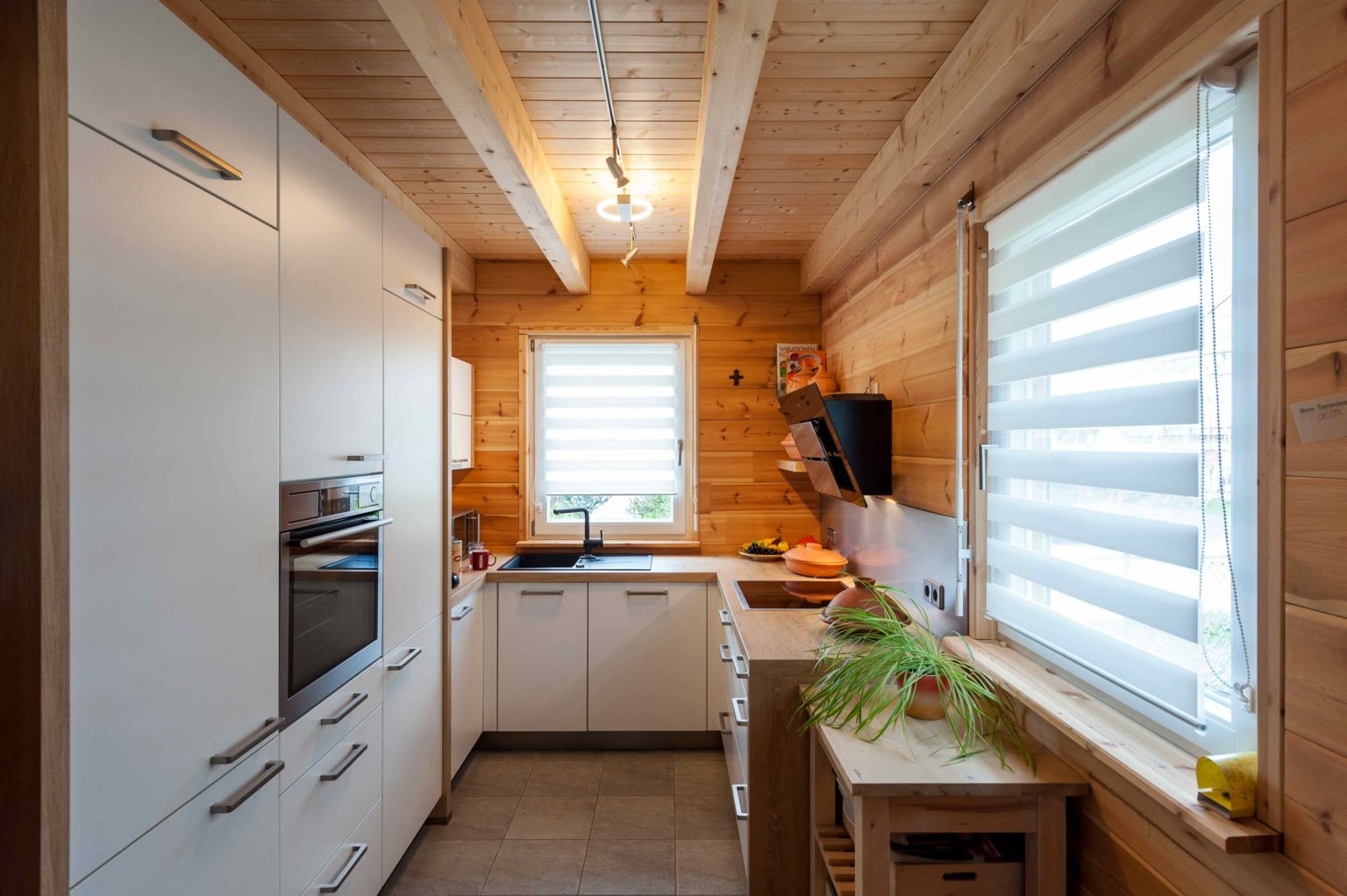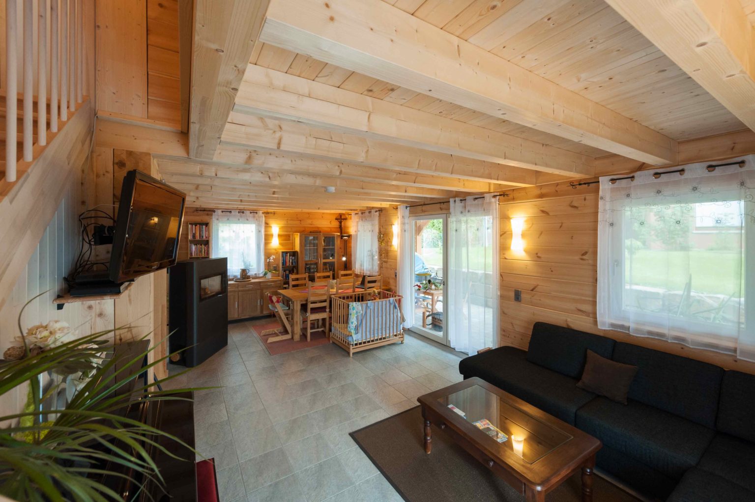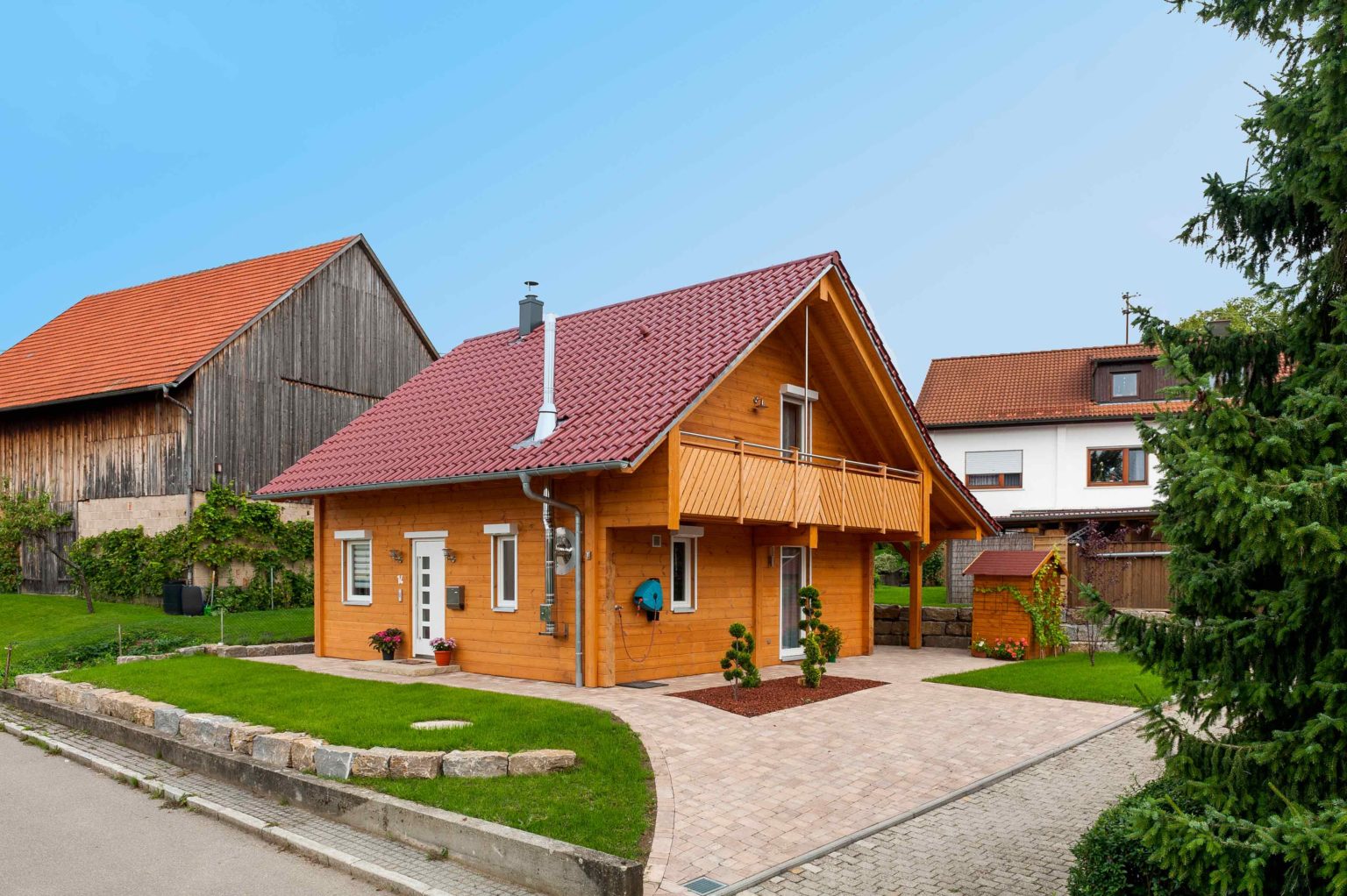 Schon lange schwärmte der Hausherr von massiven Holzhäusern, als er in einer Zeitschrift auf ein Musterhaus von Fullwood aufmerksam wurde. Bald darauf besuchte er zusammen mit seiner Frau ein Musterhaus des Holzhaus Spezialisten ganz in der Nähe, und war sofort begeistert von der hellen Optik des Gebäudes innen und außen. Auch die kompetente aber unaufdringliche Beratung der Firma gefiel ihm und schnell war man von der hohen Qualität überzeugt. Bei der Bemusterung und Heizungsart wurde den Bauherren freie Hand gelassen, so dass Holzhaus „Zollernalb“ heute über eine Fußbodenheizung von einer Ressourcen schonenden Holzpellets-Zentralheizung beheizt wird, die besonders in den Übergangszeiten noch von einer solaren Warmwassererwärmung unterstützt wird. Da die Kiefernwände hervorragend dämmen, braucht die Familie erst spät im Jahr (frühestens im November) anfangen zu heizen – und das trotz Kleinkind. Zusätzlich nutzen die Hausbewohner im offenen Wohnbereich einen voluminösen Kaminofen, dessen Brennfach besonders große Holzscheite aufnimmt. Der Ofen verbreitet schnell gemütliche Strahlungswärme, die sich über den Kaminabzug auch im Dachgeschoss ausbreitet, und der Blick durch die große Glasscheibe auf die lodernden Flammen zaubert sofort eine unnachahmliche Gemütlichkeit herbei.