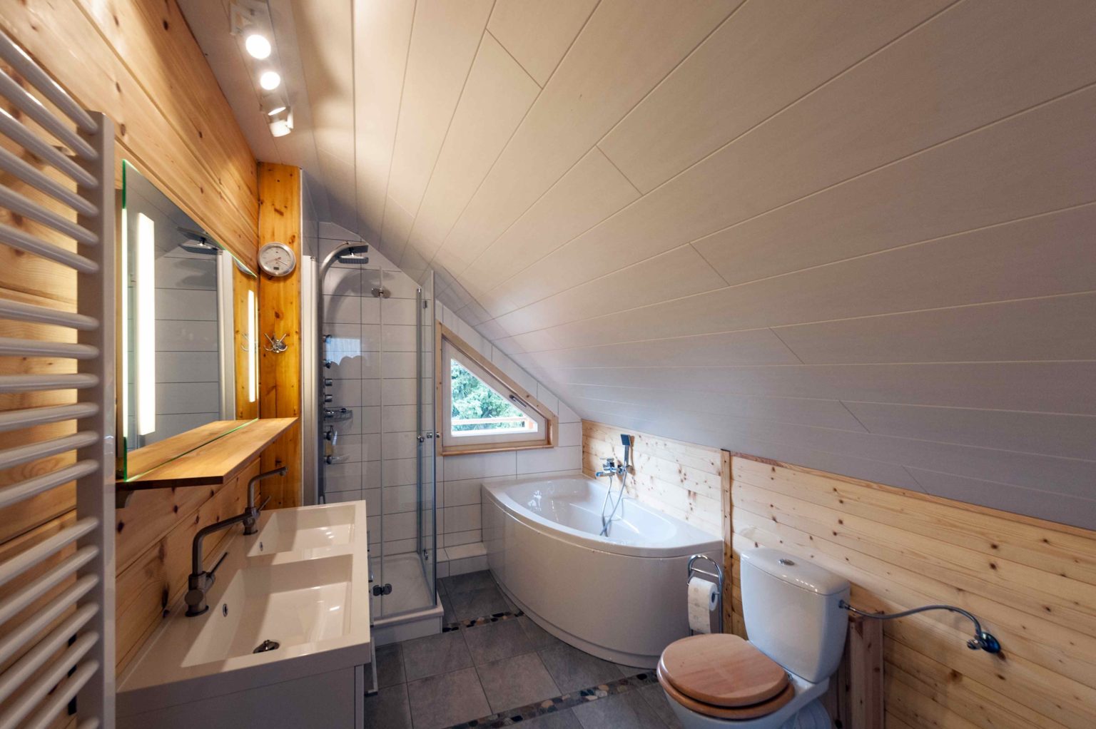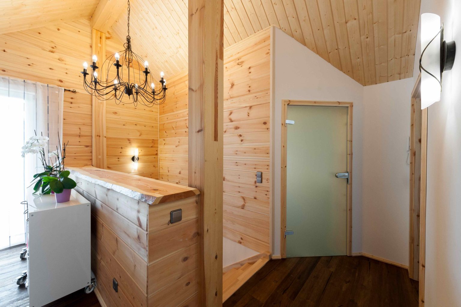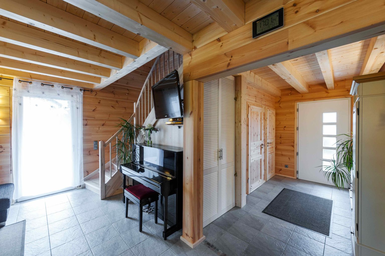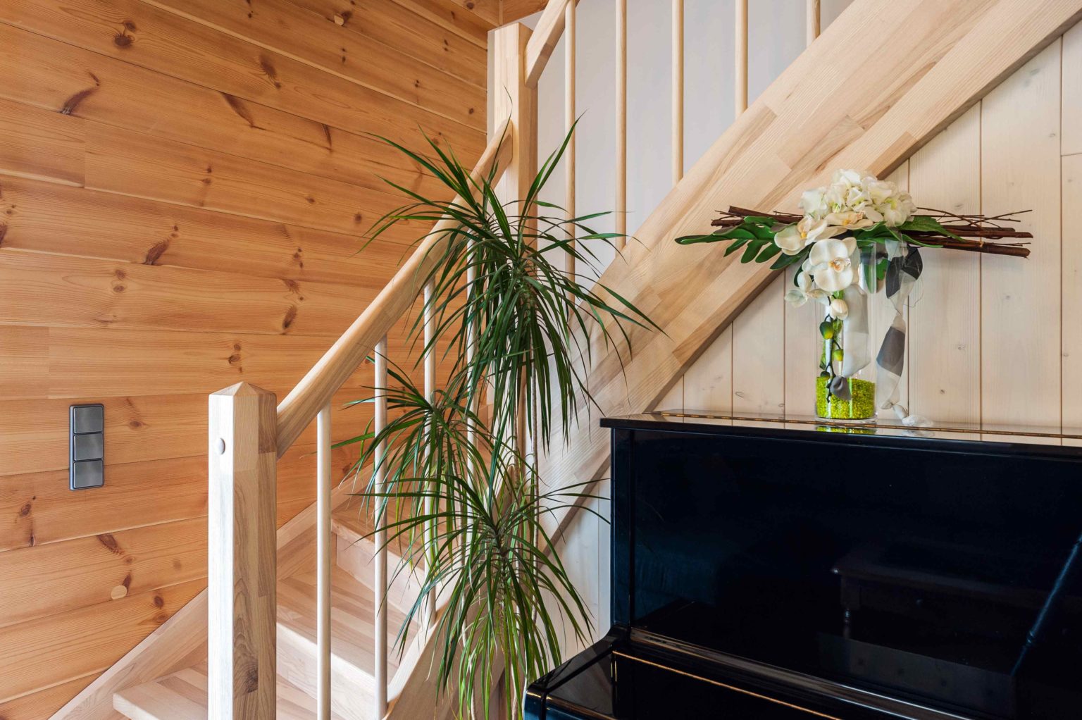 Die Behaglichkeit und das wohngesunde Klima in ihrem Heim schätzt das Eigentümerpaar ganz besonders; ein dunkles, drückendes Holzhaus wollten sie nicht, weshalb die naturhellen Kiefernwände von großen Fenstern (mit weißen Rahmen) unterbrochen werden. Eine weiß gestrichene Trennwand (Ständerwerk mit Rigipsplatte), an der die Geschosstreppe hinauf führt, ergänzt die unbehandelten Holzwände. Im Dachgeschoss sind die Trennwände auf der Galerie ebenfalls weiß gestrichen und die Dachschräge im Bad mit weiß gestrichener Holzschalung verkleidet. Die weiße Haustüre und durchweg sehr helle Möbel (hauptsächlich aus Holz) sowie hellgraue Bodenfliesen verstärken den Eindruck von Helligkeit ebenfalls. Im Dachgeschoss setzte das Ehepaar auf fußwarmes Parkett, denn dort befinden sich Schlafzimmer, Kinderzimmer und Arbeitsbereich (auf der Galerie). Im Bad wurde der Boden gefliest. Das Erdgeschoss ist komplett offen gehalten, was mehr Größe erzeugt: Diele, Esszimmer, Wohnzimmer und Küche gehen fließend ineinander über, ebenso der Treppenaufgang nach oben. Die Küche wurde durch eine Wand von der Diele getrennt. Die Voraussetzung für ungehinderte Kommunikation ist somit gegeben. Hauswirtschaftsraum (mit eigenem Zugang von außen) und Gäste-WC sind selbstverständlich separiert.