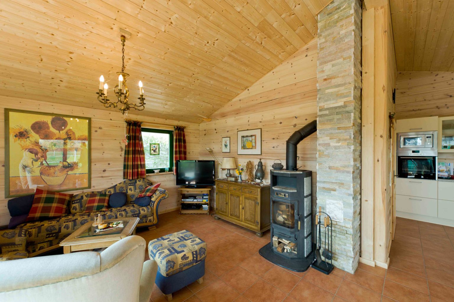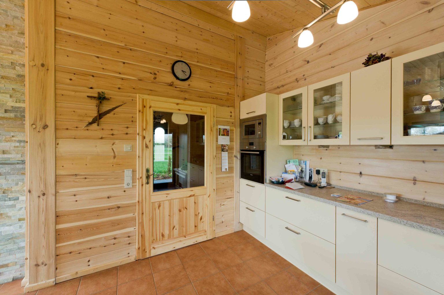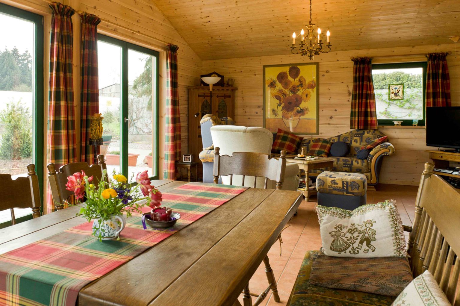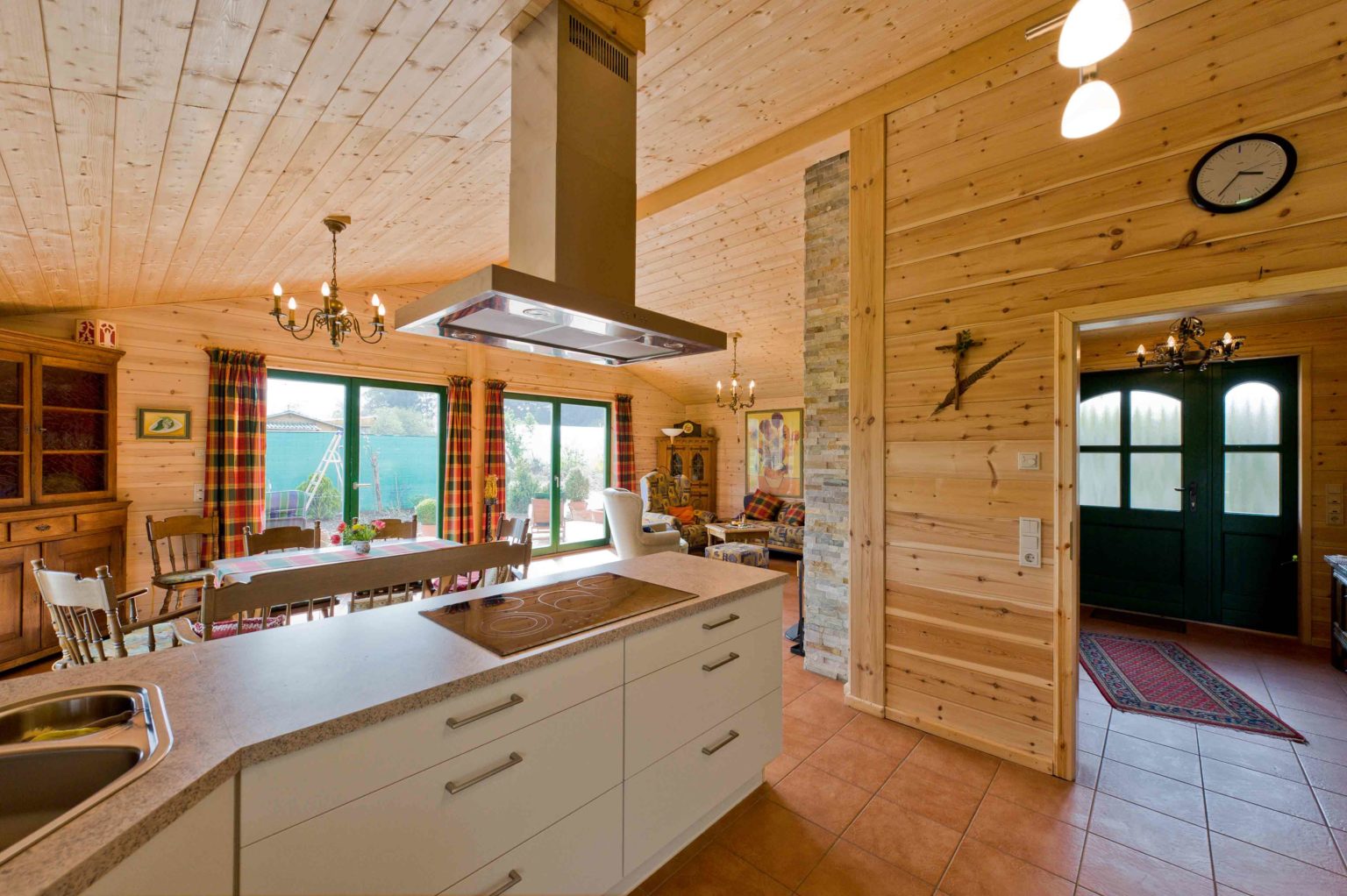 Das Baugrundstück war auf dem eigenen landwirtschaftlichen Betrieb vorhanden und gab die Form des Grundrisses vor: Auf der westlichen Längsseite des länglichen Rechtecks ist die Fassade versetzt. Im Innern verfügt Holzhaus „Zülpicher Börde“ über einen offenen Wohnbereich, in dem Küche, Esszimmer und Wohnzimmer übergangslos ineinander fließen. Das ergibt einen sehr großzügigen Raum, dessen Höhe bis zum Firstbalken reicht. Der Dachstuhl ist mit Holzbrettern verschalt und zu den tragenden Außenwänden aus massiver Kiefer gesellen sich mit passendem Holz verkleidete Trennwände in Ständerbauwise. „Weiße Wände wollten wir nicht, lieber Holz pur.“, bekräftigt der Hausherr. Lediglich der Kamin wurde in grober Maueroptik verkleidet. Dafür, dass es schön hell im Hause ist, sorgen die bodentiefen Fenster und das mit UV-Schutz behandelte, naturhelle Kiefernholz. Der Terrakotta-Ton der Bodenfliesen harmoniert mit den warmen Farben, während das Tannengrün der Fensterrahmen und der Haustür einen farblichen Kontrast setzt. Auch das mit rotbraunen Tonziegeln gedeckte Satteldach passt ins ländliche Bild von Interieur und Umgebung. „Wir haben alle liebgewonnenen Möbel aus unserem alten Bauernhaus mit hierher genommen, nur die Küche ist ganz neu.“, erzählt die Hausherrin.