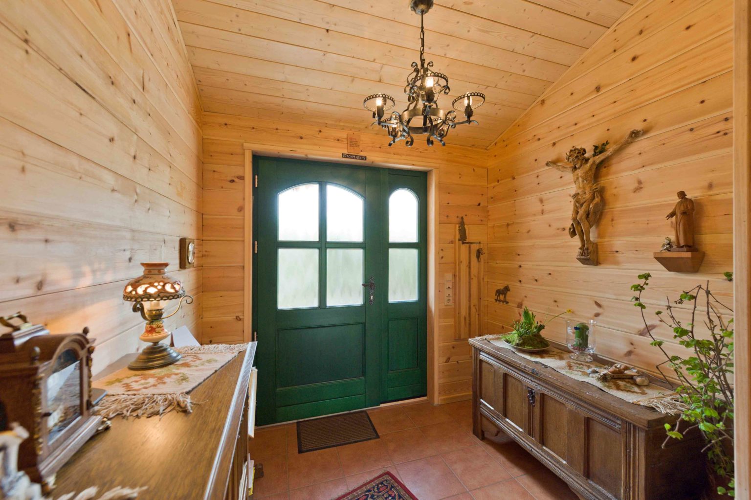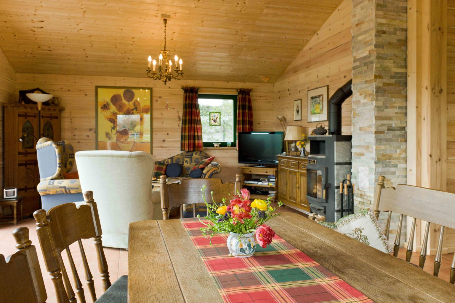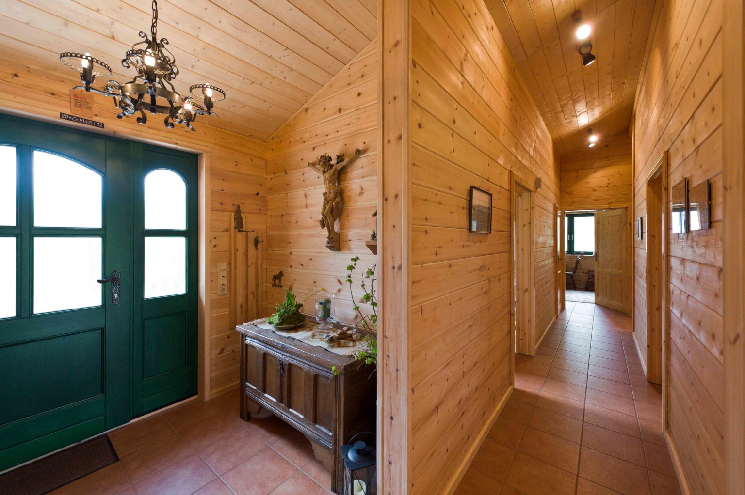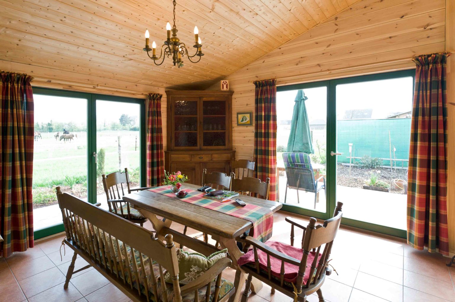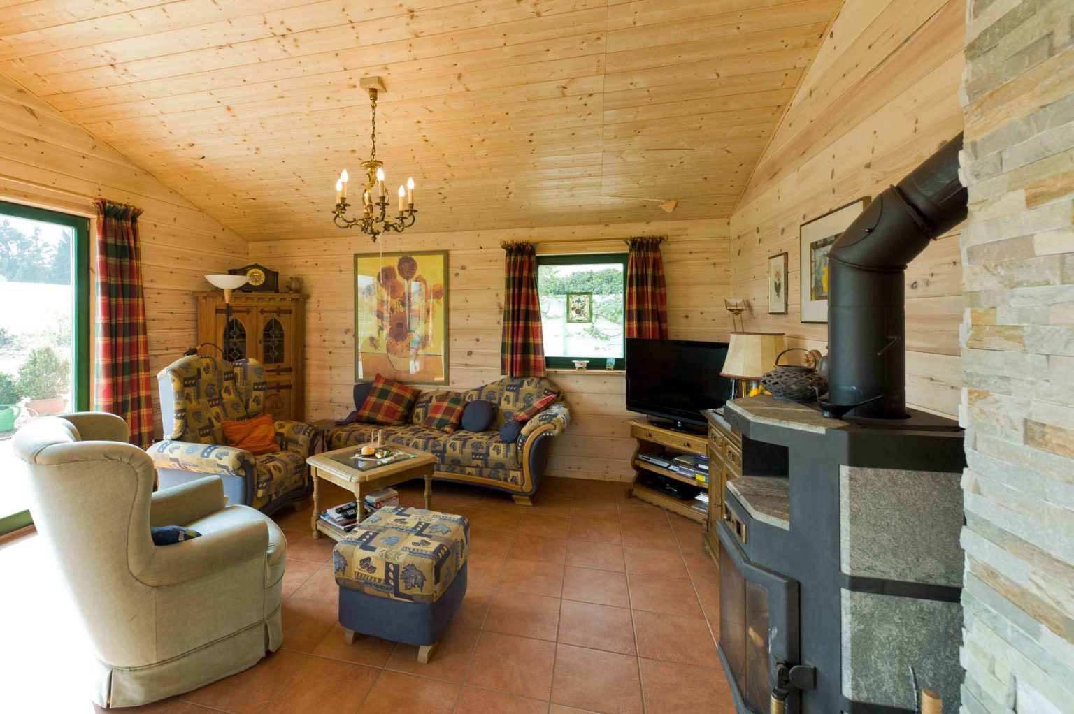 Das Baugrundstück war auf dem eigenen landwirtschaftlichen Betrieb vorhanden und gab die Form des Grundrisses vor: Auf der westlichen Längsseite des länglichen Rechtecks ist die Fassade versetzt. Im Innern verfügt Holzhaus „Zülpicher Börde“ über einen offenen Wohnbereich, in dem Küche, Esszimmer und Wohnzimmer übergangslos ineinander fließen. Das ergibt einen sehr großzügigen Raum, dessen Höhe bis zum Firstbalken reicht. Der Dachstuhl ist mit Holzbrettern verschalt und zu den tragenden Außenwänden aus massiver Kiefer gesellen sich mit passendem Holz verkleidete Trennwände in Ständerbauwise. „Weiße Wände wollten wir nicht, lieber Holz pur.“, bekräftigt der Hausherr. Lediglich der Kamin wurde in grober Maueroptik verkleidet. Dafür, dass es schön hell im Hause ist, sorgen die bodentiefen Fenster und das mit UV-Schutz behandelte, naturhelle Kiefernholz. Der Terrakotta-Ton der Bodenfliesen harmoniert mit den warmen Farben, während das Tannengrün der Fensterrahmen und der Haustür einen farblichen Kontrast setzt. Auch das mit rotbraunen Tonziegeln gedeckte Satteldach passt ins ländliche Bild von Interieur und Umgebung. „Wir haben alle liebgewonnenen Möbel aus unserem alten Bauernhaus mit hierher genommen, nur die Küche ist ganz neu.“, erzählt die Hausherrin.
