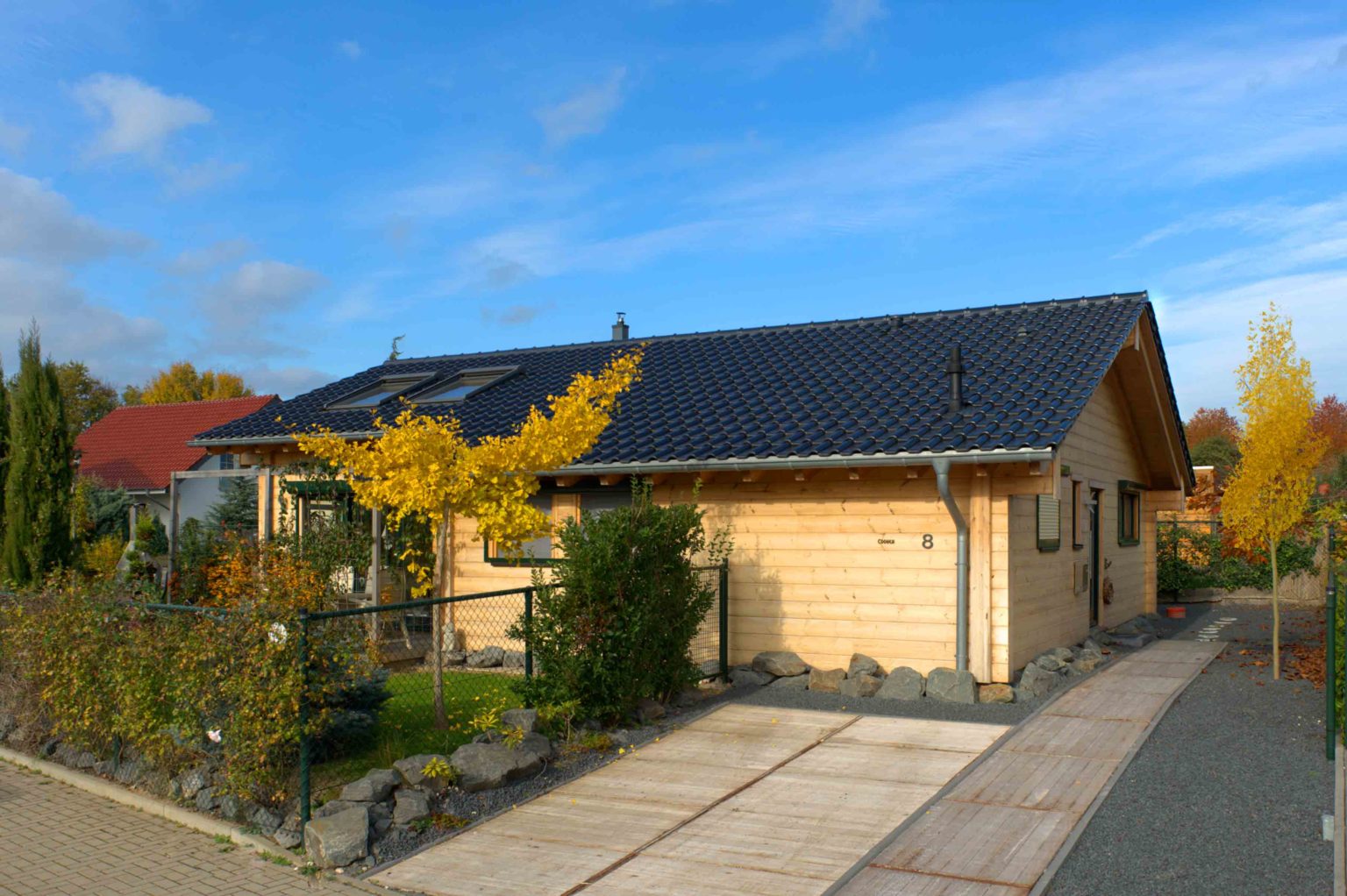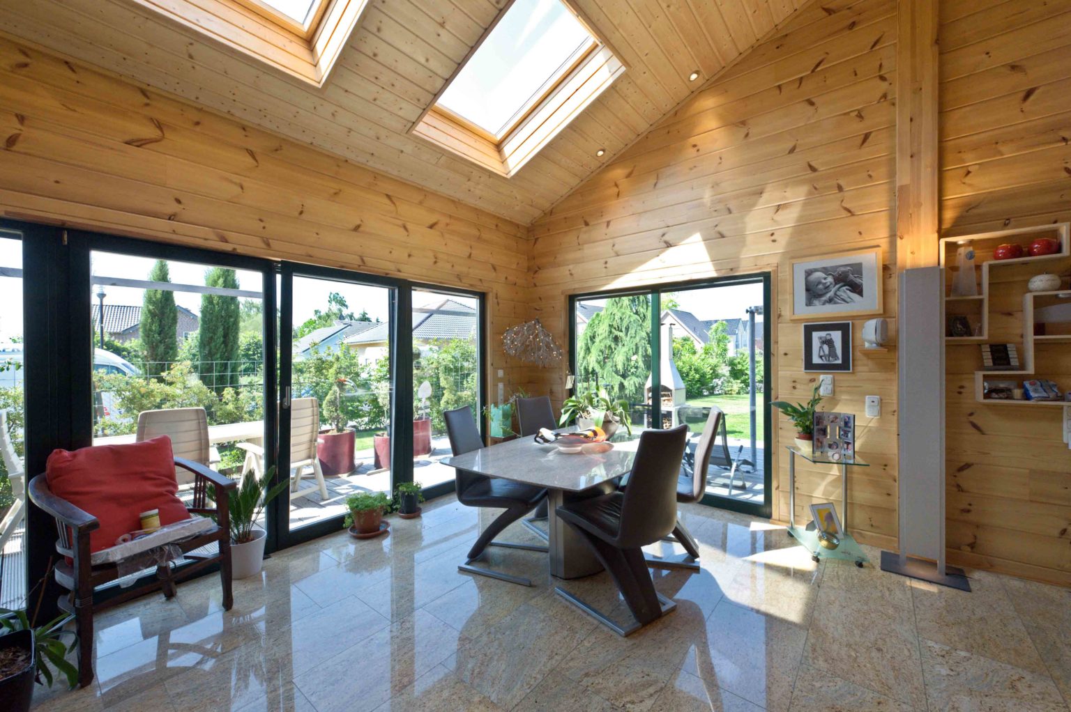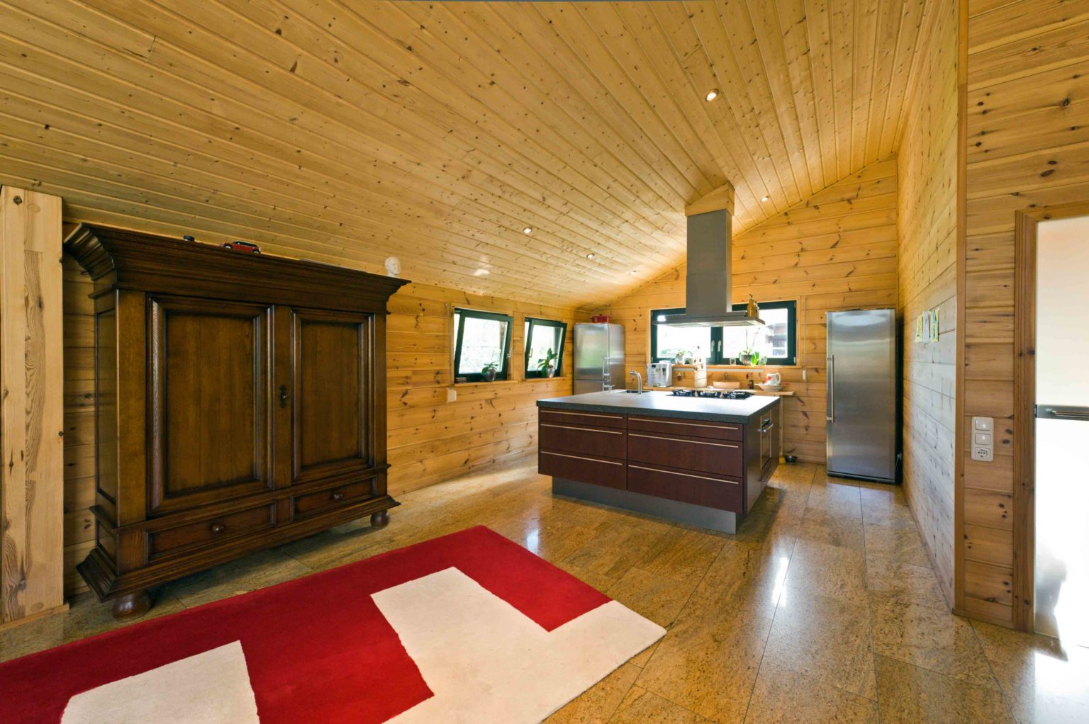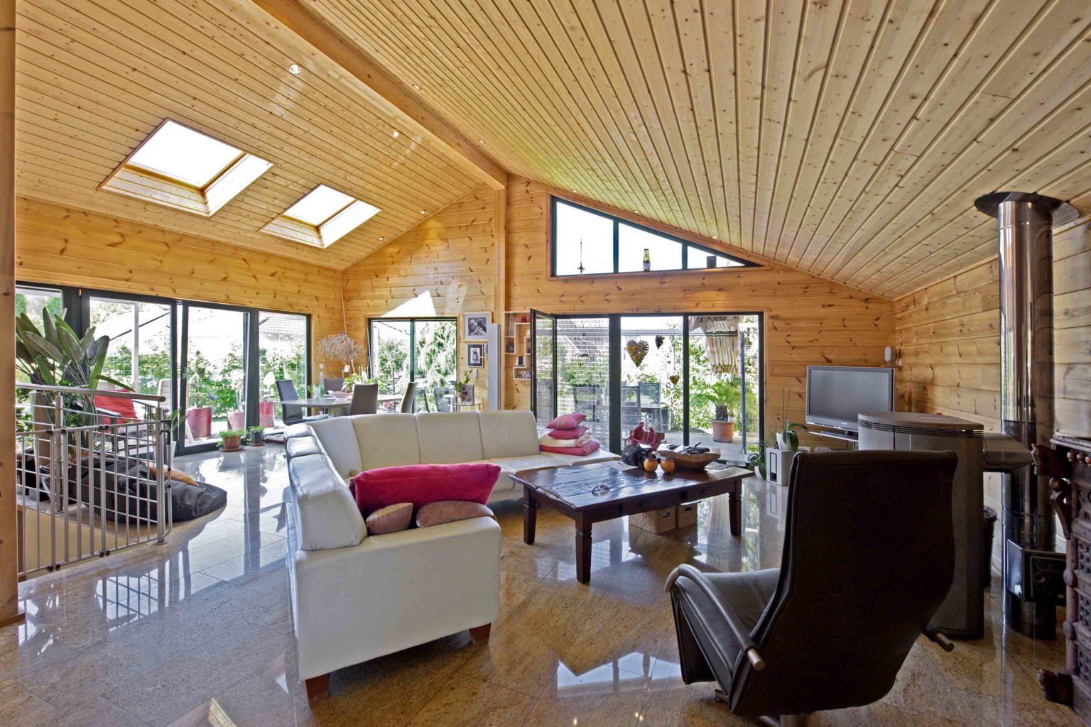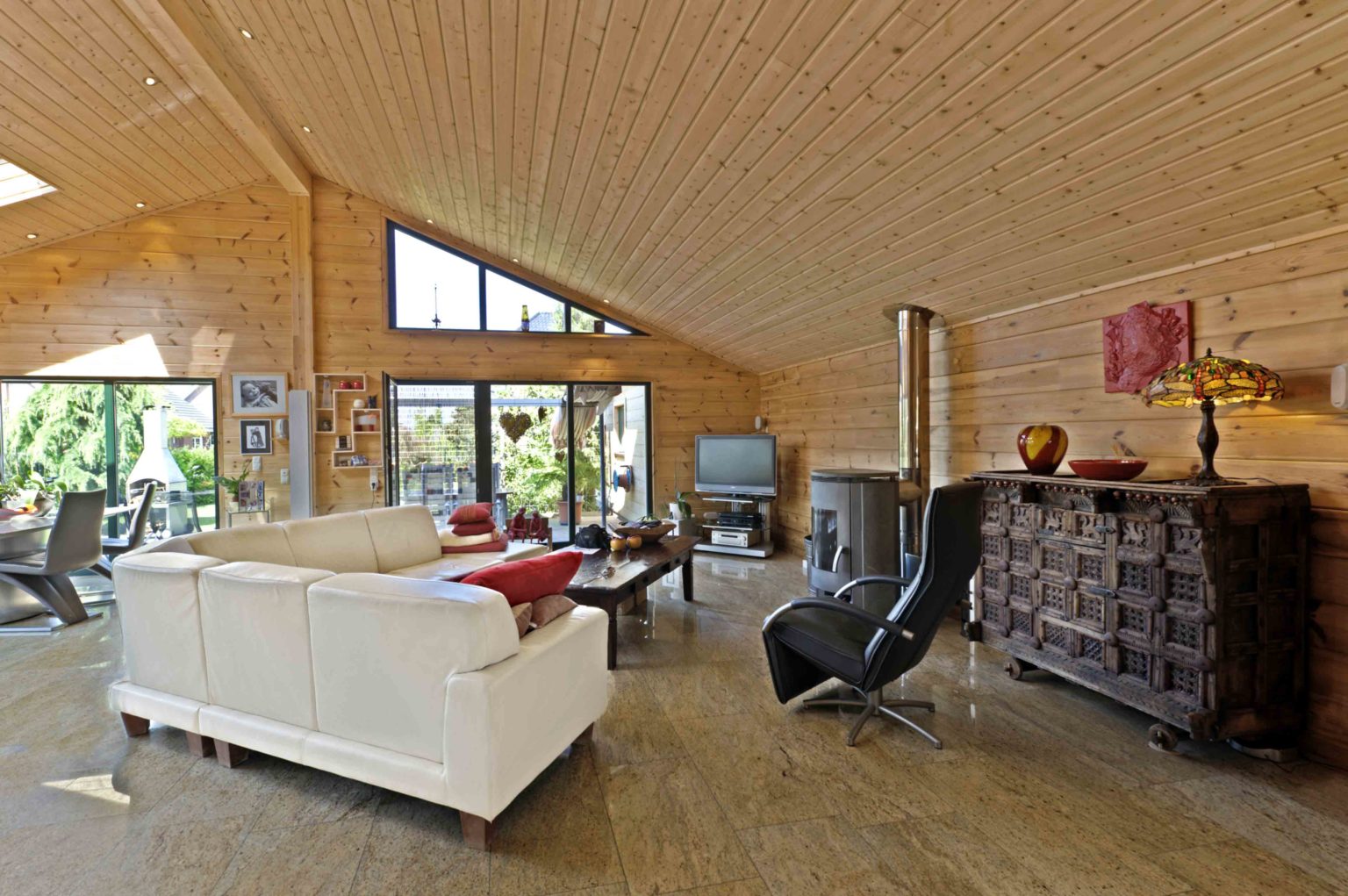 Die anspruchsvollen Hauseigentümer legten nicht nur bei ihrem Holzhaus selbst Wert auf beste Qualität, auch die Ausbaumaterialien, die Küche, der Sanitärbereich und das Mobiliar bestehen ausschließlich aus hochwertigen Materialien. Angefangen beim Granitboden über die hochmoderne Küche bis hin zur Fußbodenheizung in der Dusche bleiben keine Wünsche offen. Sämtliche Außenwände sind massiv (Vollholz) und die Trennwände (Ständerbau) mit Holzbohlen verkleidet. Einen offenen Sichtdachstuhl wollte das aus den Niederlanden stammende Paar nicht haben, weshalb sie die Dachschrägen mit langen Holzdielen verkleiden ließen. Das Holz kann weder außen noch innen nachdunkeln, da es mit UV-Schutz und Vergrauungsschutz (außen) behandelt wurde. Helligkeit im Haus ist den Hausbewohnern sehr wichtig, weshalb sie auch etliche bodentiefe Fenster einbauen ließen und sich zusätzlich für Tageslicht von oben (Dachfenster) entschieden. Der Aufbau ihres Hauses inklusive Dach, Türen und Fenstern, dauerte lediglich 8 Tage. Zuvor waren die Vollholzwände im Werk gefertigt worden und termingetreu zur Baustelle geschafft worden. Den Innenausbau erledigte der Hausherr mit Hilfe seines erwachsenen Sohnes und örtlichen Fachhandwerkern selbst. Von der Tatsache, dass die beiden Hauseigentümer Kettenraucher sind, ist in Holzhaus „zur alten Mühle“ nichts zu spüren; man riecht nichts außer einem feinen Kiefernduft, und Rauchablagerungen sind auf den hellen Holzwänden auch nicht auszumachen. Erwärmt wird das Holzhaus mit einer Gasbetriebenen Fußbodenheizung und die Warmwasserbereitung wird solar unterstützt.