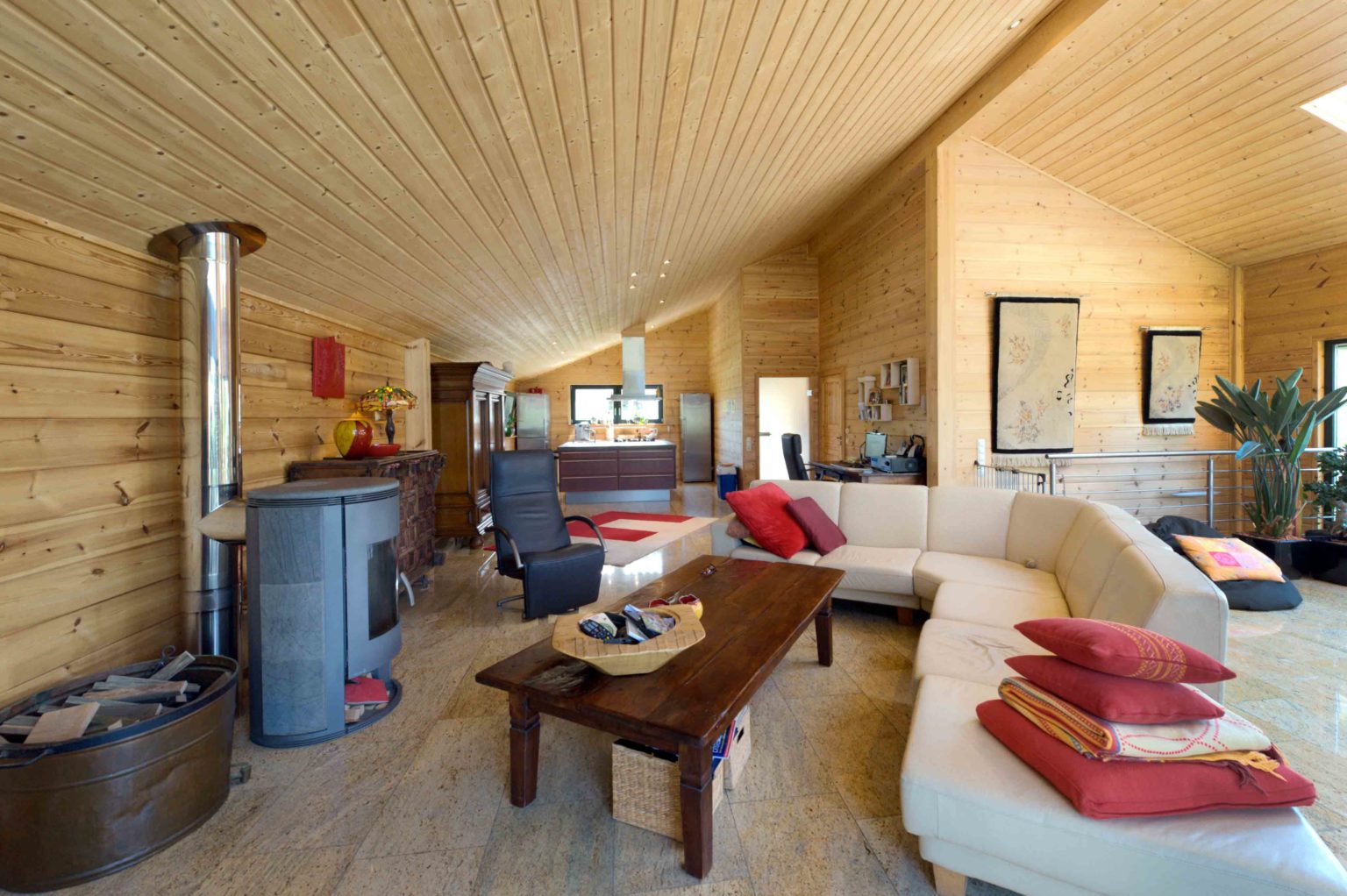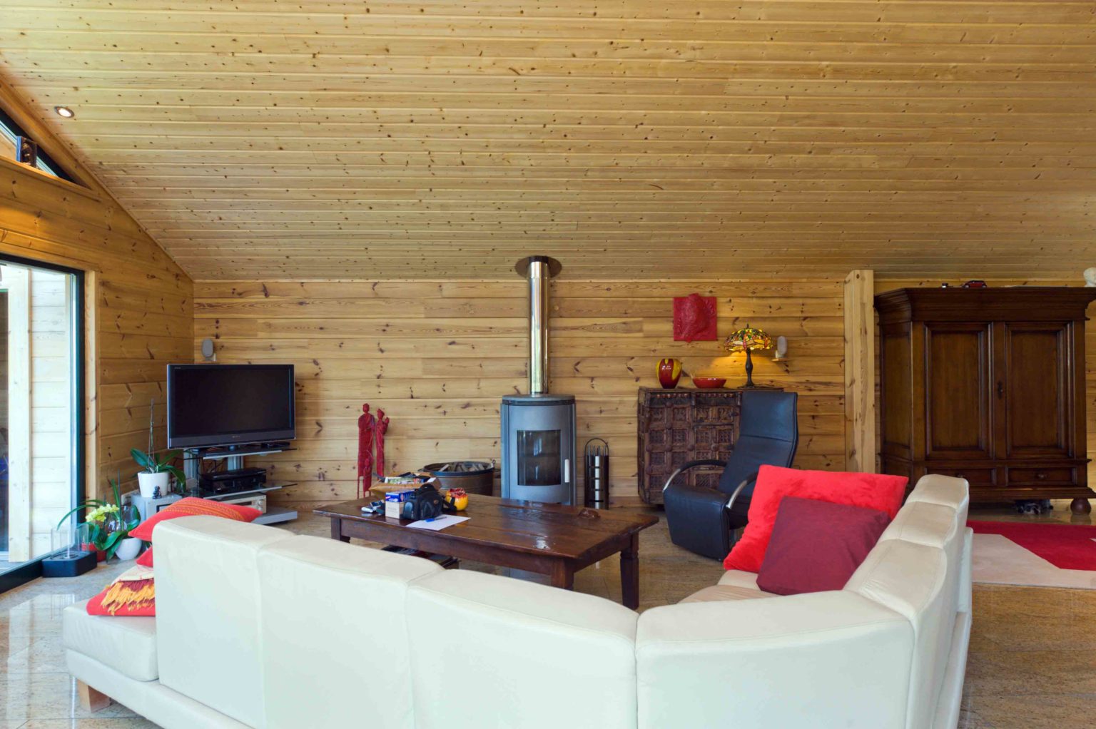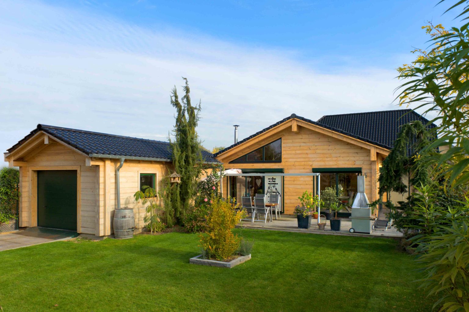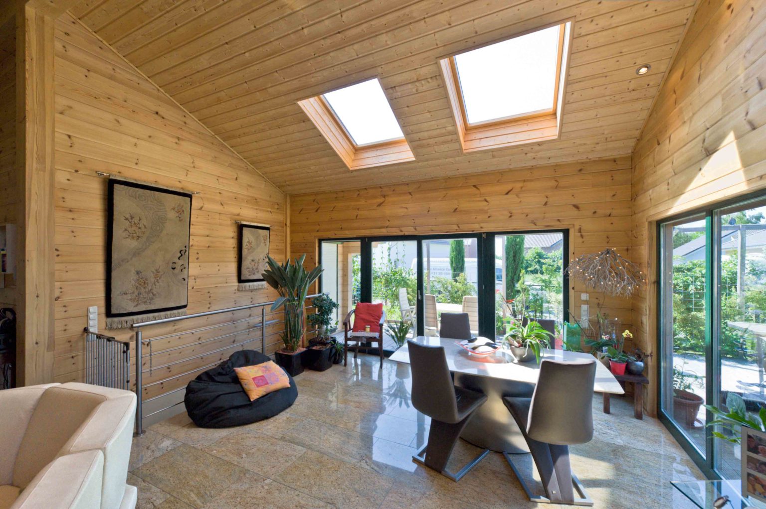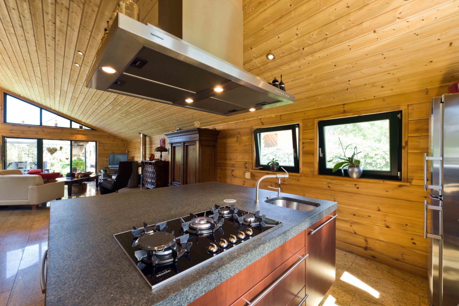 Die anspruchsvollen Hauseigentümer legten nicht nur bei ihrem Holzhaus selbst Wert auf beste Qualität, auch die Ausbaumaterialien, die Küche, der Sanitärbereich und das Mobiliar bestehen ausschließlich aus hochwertigen Materialien. Angefangen beim Granitboden über die hochmoderne Küche bis hin zur Fußbodenheizung in der Dusche bleiben keine Wünsche offen. Sämtliche Außenwände sind massiv (Vollholz) und die Trennwände (Ständerbau) mit Holzbohlen verkleidet. Einen offenen Sichtdachstuhl wollte das aus den Niederlanden stammende Paar nicht haben, weshalb sie die Dachschrägen mit langen Holzdielen verkleiden ließen. Das Holz kann weder außen noch innen nachdunkeln, da es mit UV-Schutz und Vergrauungsschutz (außen) behandelt wurde. Helligkeit im Haus ist den Hausbewohnern sehr wichtig, weshalb sie auch etliche bodentiefe Fenster einbauen ließen und sich zusätzlich für Tageslicht von oben (Dachfenster) entschieden. Der Aufbau ihres Hauses inklusive Dach, Türen und Fenstern, dauerte lediglich 8 Tage. Zuvor waren die Vollholzwände im Werk gefertigt worden und termingetreu zur Baustelle geschafft worden. Den Innenausbau erledigte der Hausherr mit Hilfe seines erwachsenen Sohnes und örtlichen Fachhandwerkern selbst. Von der Tatsache, dass die beiden Hauseigentümer Kettenraucher sind, ist in Holzhaus „zur alten Mühle“ nichts zu spüren; man riecht nichts außer einem feinen Kiefernduft, und Rauchablagerungen sind auf den hellen Holzwänden auch nicht auszumachen. Erwärmt wird das Holzhaus mit einer Gasbetriebenen Fußbodenheizung und die Warmwasserbereitung wird solar unterstützt.