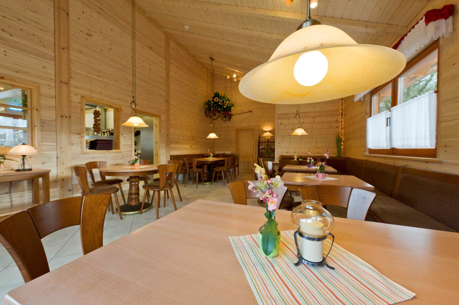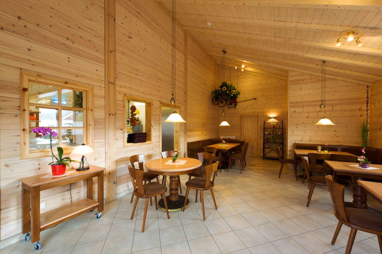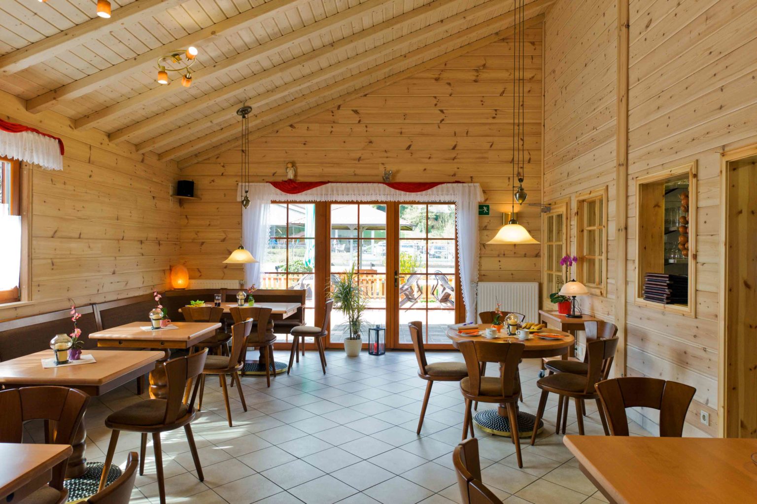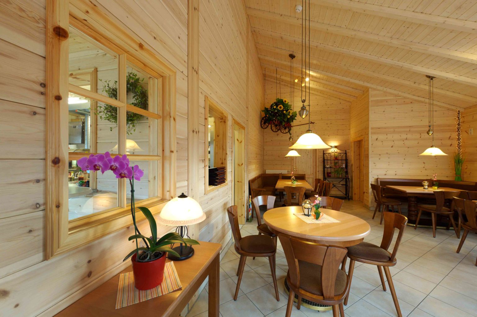 fügt Herr Wolff hinzu. Die neue „Jagdhütte“ verfügt über einen bis zum First offenen, geräumigen Gastraum, in dem am Tisch bedient wird. Durch eine verglaste Tür ist er vom Eingangsbereich mit der Selbstbedienungstheke getrennt; dort können Eilige ihr Essen gleich mitnehmen. Die sanitären Anlagen sind dem Gastraum angeschlossen. Eine große Gastronomie-Küche komplettiert das Raumprogramm. Große Fensterflächen, zum Teil sind es bodentiefe Fenstertüren, lassen sehr viel Tageslicht in das bewusst hell gehaltene Holzhaus und erlauben den einfachen Wechsel von drinnen nach draußen.