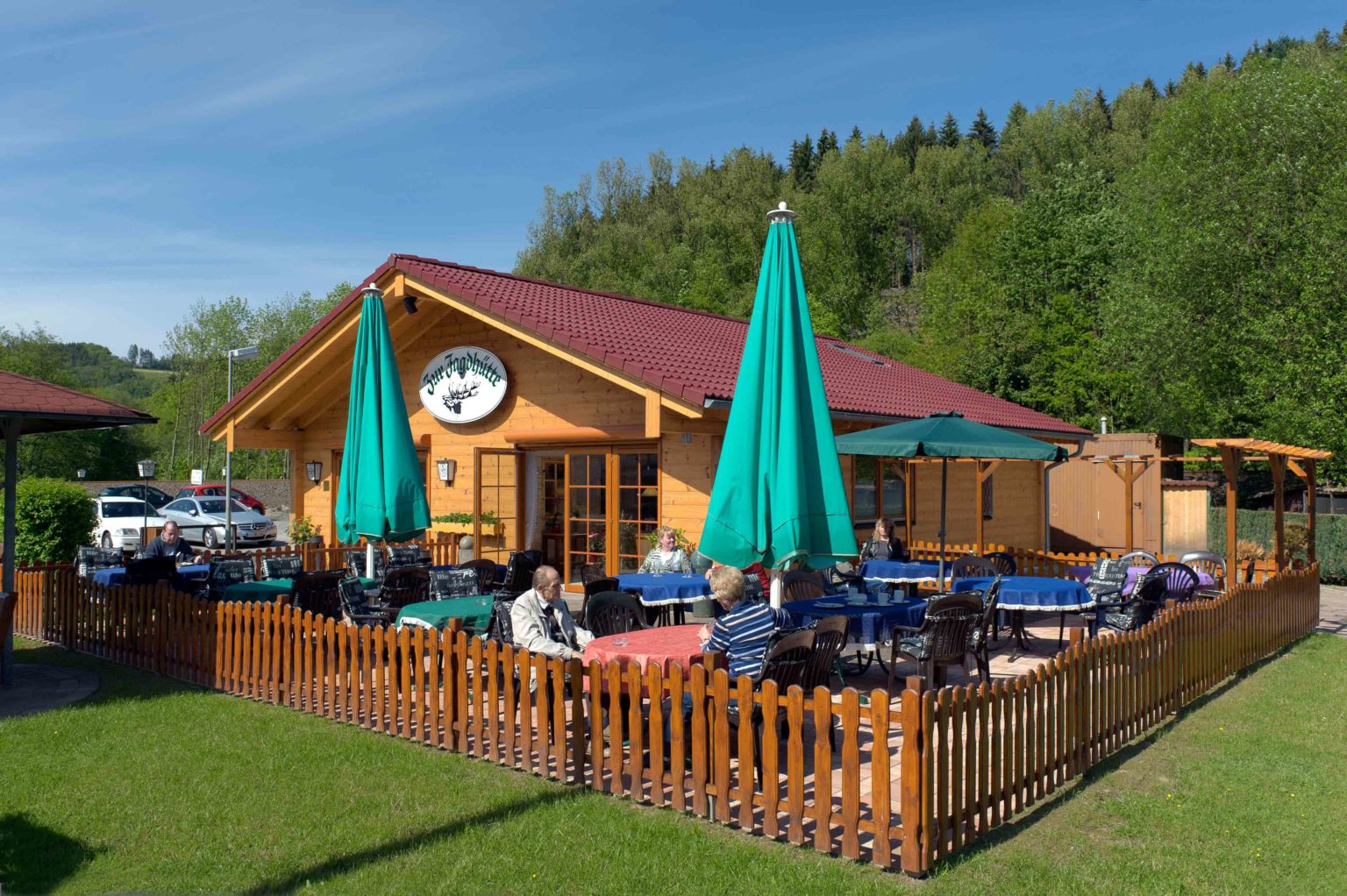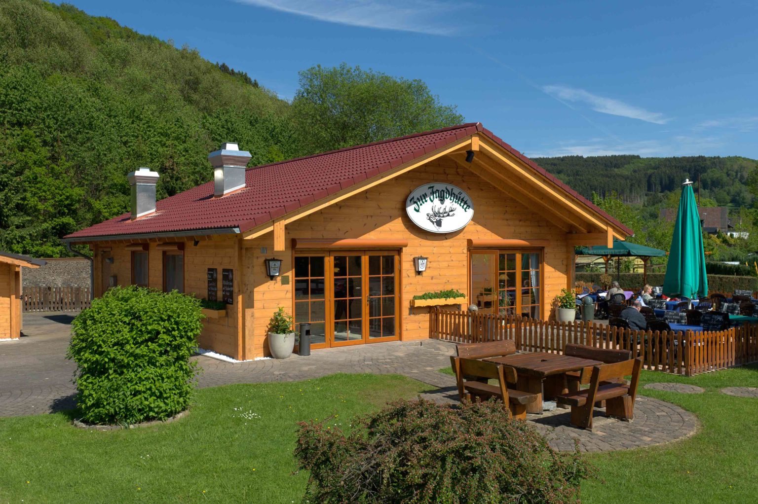 Das gemütliche, saubere Lokal ist immer gut besucht und bietet innen wie außen vielen Stammgäste aller Altersklassen das ganze Jahr über Platz. Einige Wanderwege des „Sauerländischen Gebirgsvereins“ und Sehenswürdigkeiten, wie die „Aggertalhöhle“ oder die Aussichtstürme „Hohe Warte“ und „Haldy-Turm“, locken Ausflügler nach Ründeroth, einem Ortsteil der Gemeinde Engelskirchen – gut, wenn man dann auch weiß, wo man essen und bei jedem Wetter schön sitzen kann. Auf dem riesigen Parkplatz nebenan finden viele Fahrzeuge Platz, auch große. „Wir bieten einen Catering-Service an und unser neuer Gastraum kann für Feierlichkeiten gemietet werden.“, offeriert Herr Wolff gutgelaunt. Dem Wirt der „Jagdhütte“ war vor gut zwei Jahren das Lachen vergangen, als nämlich sein voriger Imbissbetrieb komplett ausbrannte. „Wir haben nach dem Schock schnell wieder Mut gefasst und gleich ein neues, etwas größeres massives Holzhaus mit Fullwood Wohnblockhaus gebaut.“, berichtet er und betont, wie zufrieden er mit der Holzhaus Firma ist.