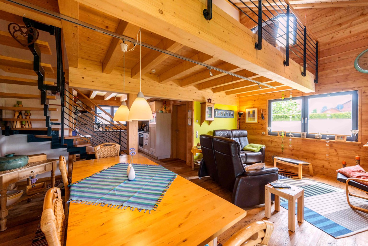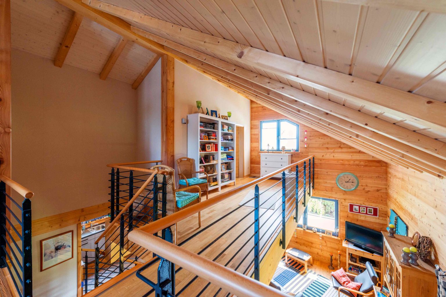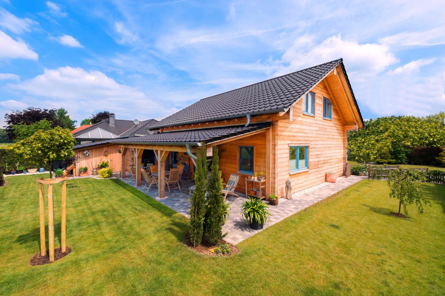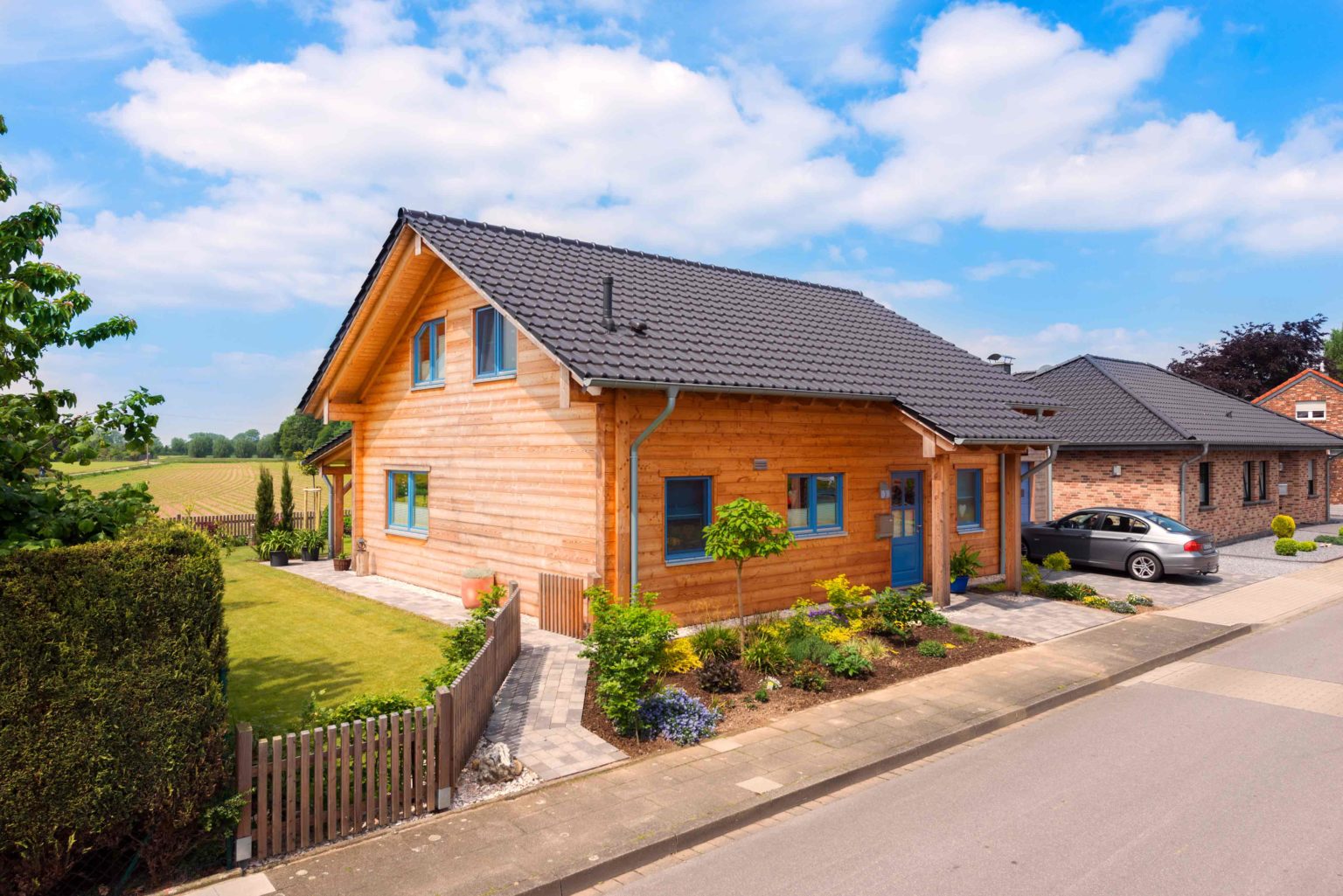 Auf Fullwood stieß das Paar, als ein Kollege von Karl-Heinz Weyenberg mit der Firma baute und rundum begeistert war. „Für seine Empfehlung sind wir heute noch dankbar!“, freut sich der Hausherr. Bei Bedarf auf einer Ebene wohnen Als die Mittfünfziger Holzhaus „Zweiland“ planten, dachten sie auch gleich ans Alter und die Möglichkeit, ausschließlich barrierefrei im Erdgeschoss wohnen zu können, falls irgendwann nötig. Der hinzugezogene Architekt machte daraufhin einen anderthalbgeschossigen Hausentwurf mit großem firsthohem Luftraum im offenen Wohn/Ess/Kochbereich, und der Möglichkeit, später mit dem Schlafzimmer vom Dachgeschoss ins Erdgeschoß zu ziehen, wo sich jetzt ein großes Büro befindet. Ein geräumiges Bad ist bereits in beiden Geschossen vorhanden, und eine große, teils überdachte Terrasse, zieht sich barrierefrei fast ums gesamte Holzhaus. Auch der Garten ist eben und im Notfall mit Rollator begehbar. Doch von körperlichen Einschränkungen sind die Weyenbergs sehr weit entfernt, im Gegenteil: Der Hausherr ist einen Tag vor dem beginnenden Hausaufbau noch den Hamburg-Marathon gelaufen! Mit Eigenleistung Geld sparen Andere bräuchten nach solch einer sportlichen Höchstleistung erst einmal Erholung. Nicht so Karl-Heinz Weyenberg, der vom ersten Bautag an dem Richtmeister des Hausherstellers bei der Hausmontage half. „Mit Freunden und Verwandten haben wir beim Hausaufbau geholfen und später auch im Innenausbau viel selbst gemacht. Dank unseres hervorragenden Richtmeisters klappte alles wunderbar und relativ entspannt! Er hat uns auch für den Innenausbau noch viele wertvolle Tipps gegeben.“, erzählt er. Nach nur vier Monaten ab Montagebeginn zog das Ehepaar schon in sein neues Holzhaus ein. „Ich würde sofort wieder ein massives Holzhaus mit Fullwood bauen!“, betont der zufriedene Hausherr. Gesundes Genusswohnen im warmen Ambiente „Wir fühlen uns total wohl in unserem Holzhaus!“, schwärmt Barbara Weyenberg. „Das muss an dem Zusammenspiel von gesunder Raumluft, behaglicher Atmosphäre und angenehmer Zimmertemperatur liegen, das die massiven Lärchenwände erzeugen.“, vermutet sie. Tatsächlich beweisen wissenschaftliche Studien, dass die gefühlte Temperatur in massiven Holzhäusern 2-3 Grad höher ist, als beispielsweise in Steinhäusern. Dieser Effekt schafft, neben dem zarten Duft und der warmen Ausstrahlung von Holz, eine Behaglichkeit, die es so nur in massiven Holzhäusern gibt. Genau die lieben Holzhaus Bbesitzer wie die Weyenbergs an ihrem Eigenheim. Außerdem heizt man weniger, was den Energieverbrauch und die Heizkosten senkt sowie der Raumluft im Winter zugutekommt. „Bei uns im Haus ist es immer gemütlich, egal wie das Wetter draußen ist.“, findet die Hauseigentümerin. Nicht nur Holzwände In Holzhaus „Zweiland“ bestehen nicht nur die Außenwände aus Massivholz (Lärche), auch die blauen Fensterrahmen, die blaue Haustür, die offene Balkendecke (Kiefer), der Dielenfußboden, die Zimmertüren, die Treppentritte und viele Möbel sind aus dem Naturmaterial. Lediglich das Treppen- und Galeriegeländer ist aus schwarzem Edelstahl, aber mit hölzernem Handlauf - der schmeichelt den Händen. Zu den tragenden Vollholzwänden ergänzte das Ehepaar weiß verputzte Trennwände (Ständerbauweise), die für zusätzliche Helligkeit im Holzhaus sorgen. „Wir hatten Angst, dass uns ausschließlich Holzwände doch zu viel würden.“, erklärt Barbara Weyenberg. Dank der großen, oft bodentiefen Fenster fällt reichlich natürliches Licht ins Hausinnere, so dass alles hell und luftig (offener Luftraum) wirkt. Außen wurde zudem eine Garage mit direktem Zugang in die Diele angebaut, selbstverständlich auch aus Holz. So gelangt man bei jedem Wetter trockenen Fußes vom Auto ins Holzhaus. Da das Dach zur Gartenseite weit abgeschleppt ist, können die Weyenbergs auch verregnete Sommer auf ihrer schönen Terrasse genießen. Und sollte ein Besucher vor der Haustür warten müssen, lässt ihn das Ehepaar nicht „im Regen stehen“, sondern bietet ein kleines, abgeschlepptes Vordach über der Haustür. Praktischer Grundriss im Quadrat Nahezu quadratisch ist der Grundriss von Holzhaus „Zweiland“. Im Erdgeschoss befindet sich an der Ostseite der straßenseitige Eingang, von dort tritt man in eine geräumige, geschlossene Diele, die zum Gäste-Bad/WC, zur Garage, in die Küche und ins Büro führt. Der zum Wohn/Ess-Bereich hin offenen Küche ist ein Hauswirtschaftsraum angeschlossen, in dem Vorräte gelagert werden und Waschmaschine und Trockner stehen. Zwischen Küche und Wohn/Ess-Zimmer befindet sich die halb gewendelte Geschosstreppe, welche auf die Galerie im Dachgeschoss führt. Oben komplettieren ein Schlafzimmer, ein Abstellraum und ein Badezimmer das Raumprogramm von Holzhaus „Zweiland“. Der Wohnbereich ist nach Süd/Westen ausgerichtet, und das Schlafzimmer an der nord-östlichen Hausecke positioniert. Die Weyenbergs stehen also morgens mit der Sonne auf und genießen ihren Feierband mit der Sonne im Wohnbereich oder auf der Terrasse.