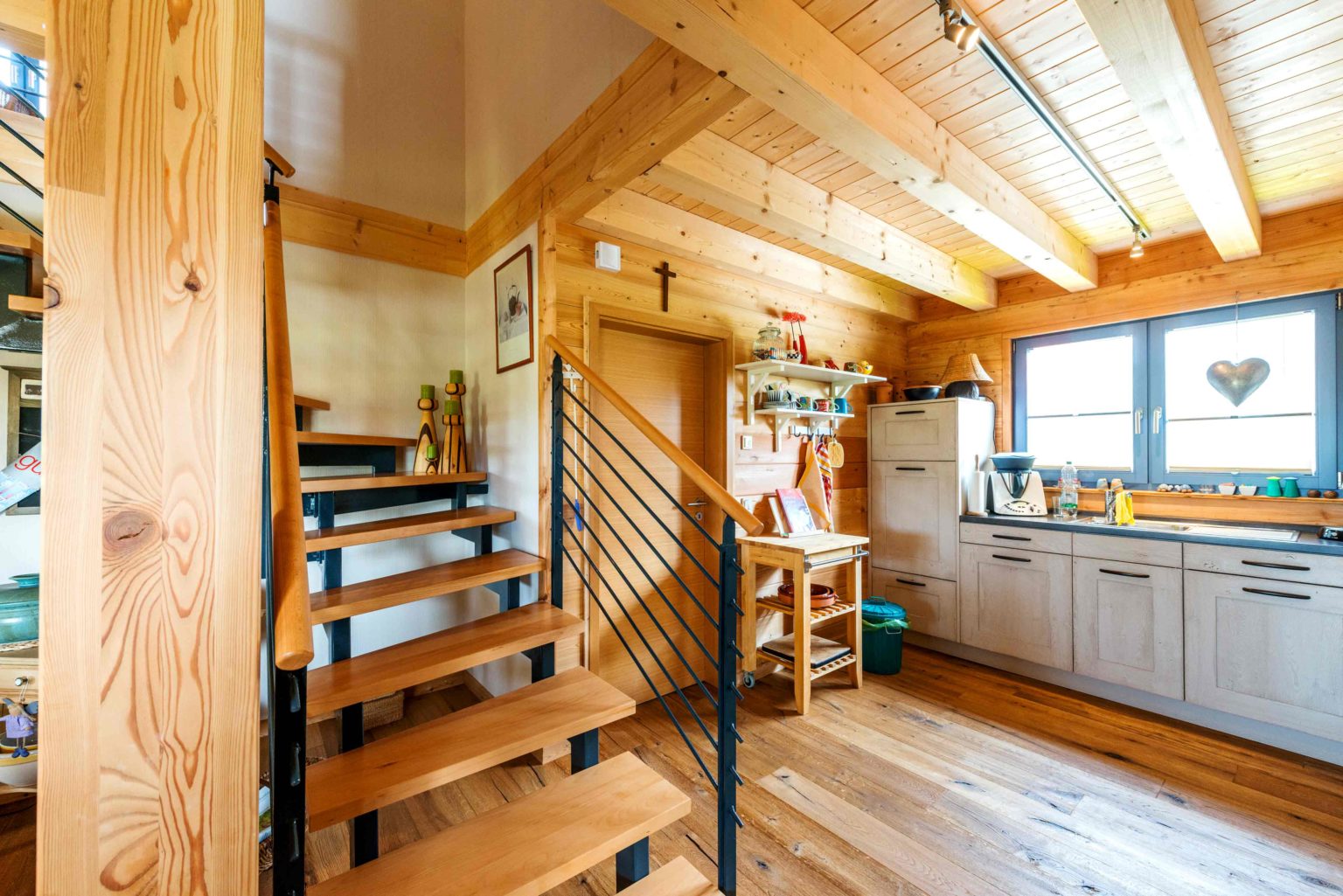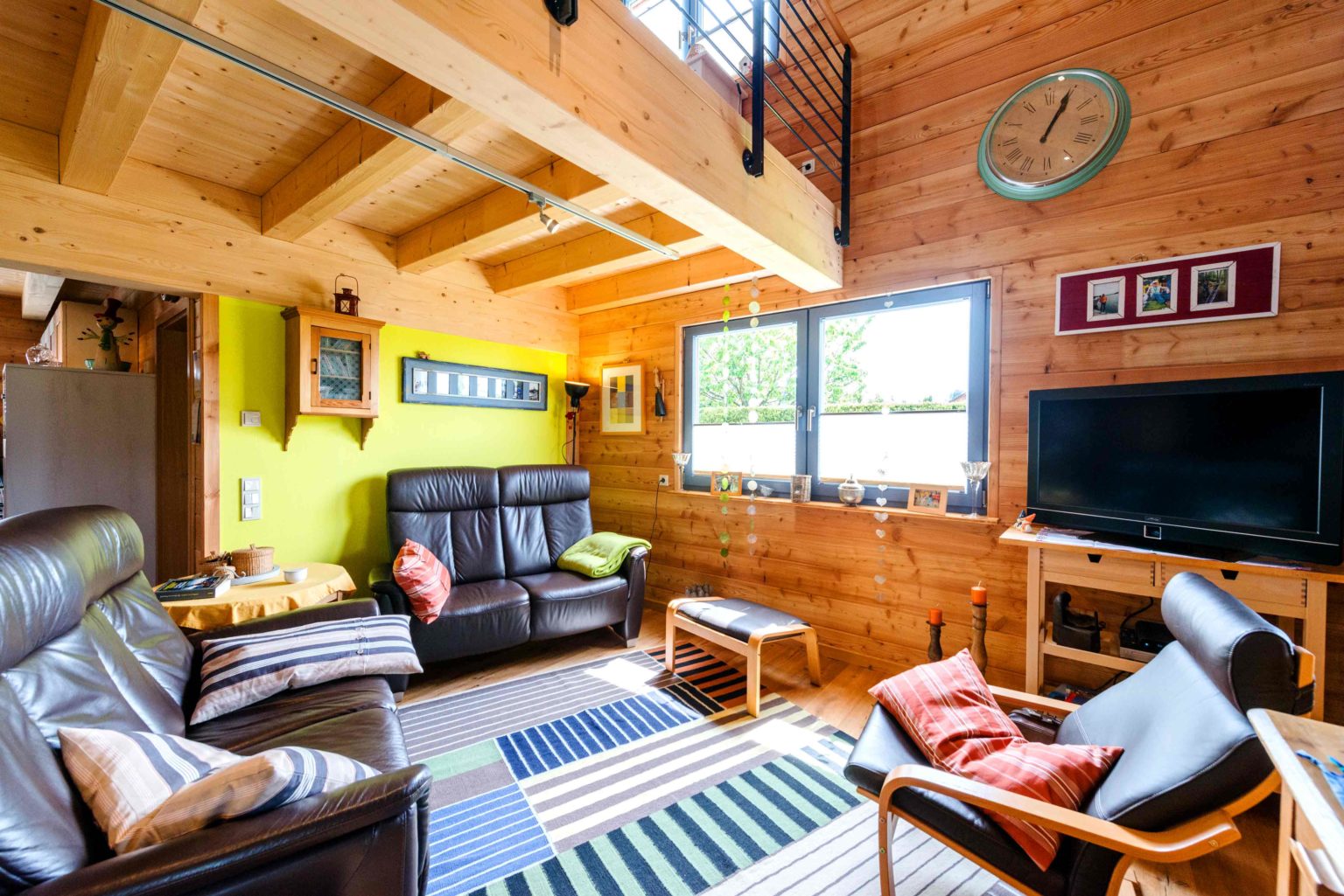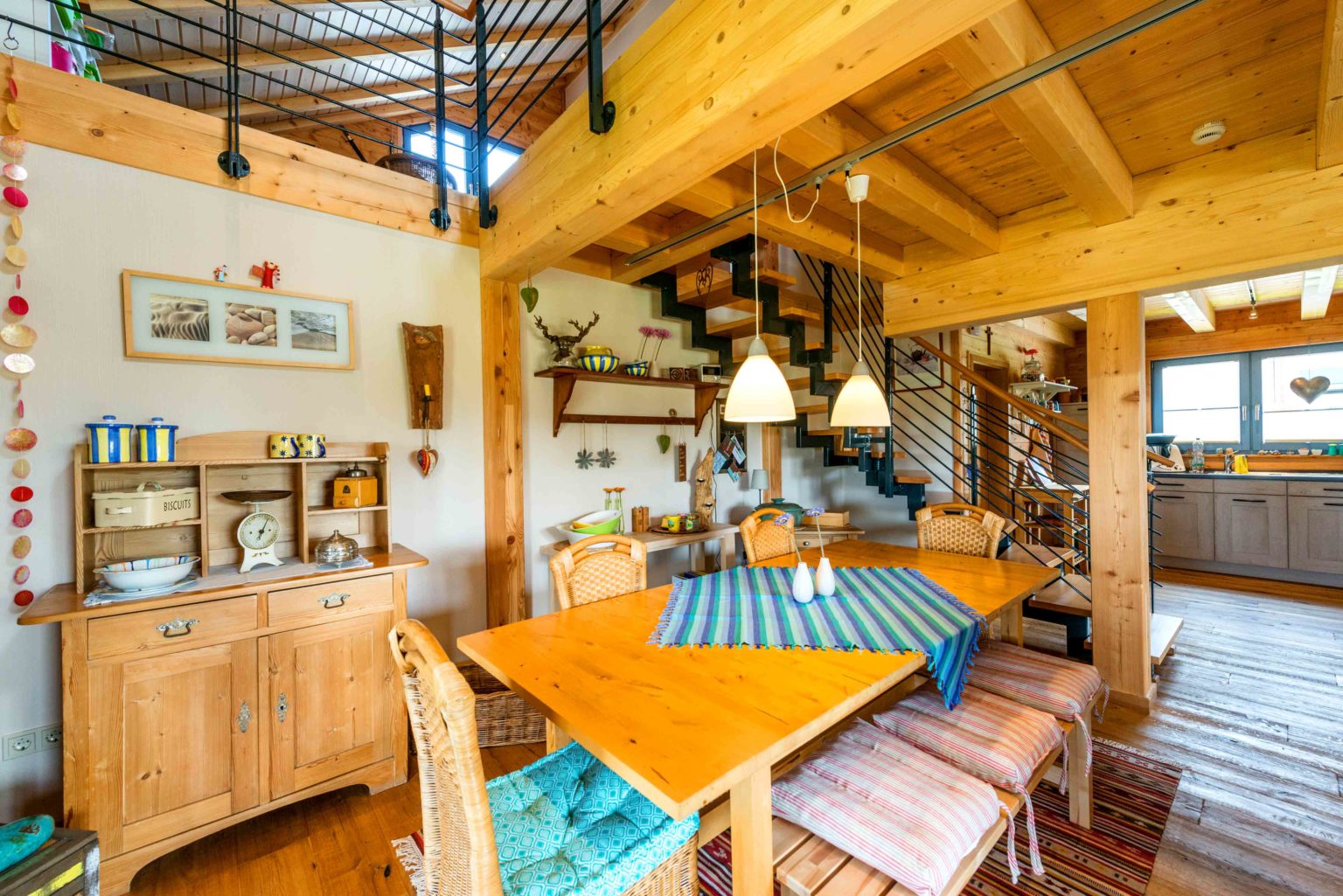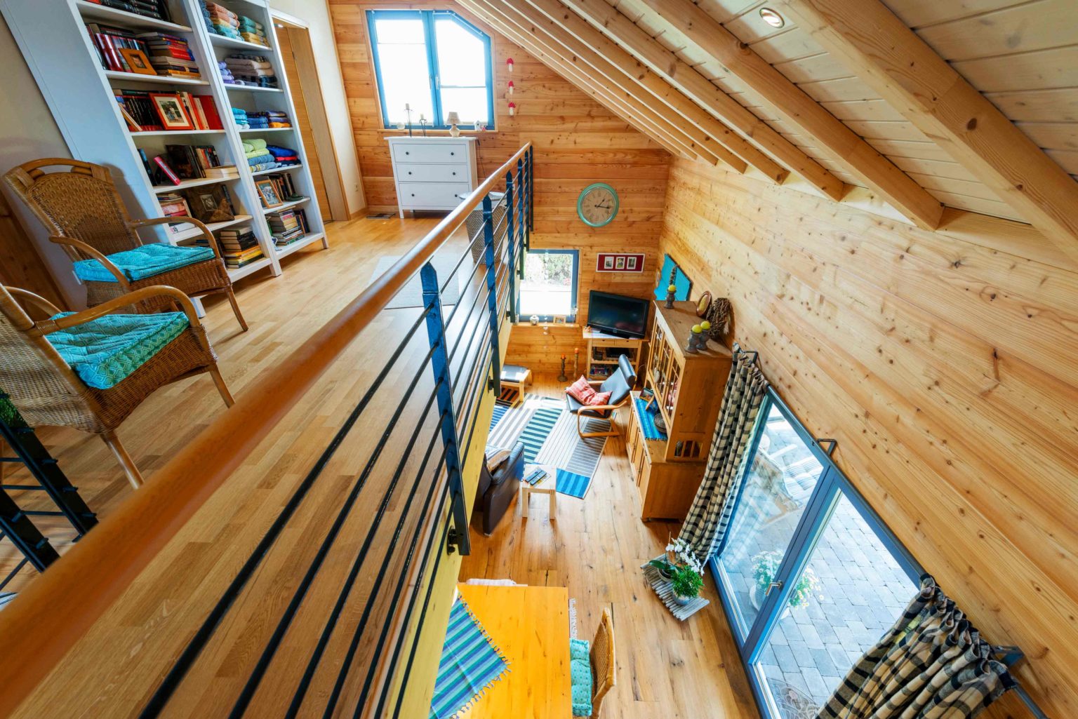 Auf Fullwood stieß das Paar, als ein Kollege von Karl-Heinz Weyenberg mit der Firma baute und rundum begeistert war. „Für seine Empfehlung sind wir heute noch dankbar!“, freut sich der Hausherr. Bei Bedarf auf einer Ebene wohnen Als die Mittfünfziger Holzhaus „Zweiland“ planten, dachten sie auch gleich ans Alter und die Möglichkeit, ausschließlich barrierefrei im Erdgeschoss wohnen zu können, falls irgendwann nötig. Der hinzugezogene Architekt machte daraufhin einen anderthalbgeschossigen Hausentwurf mit großem firsthohem Luftraum im offenen Wohn/Ess/Kochbereich, und der Möglichkeit, später mit dem Schlafzimmer vom Dachgeschoss ins Erdgeschoß zu ziehen, wo sich jetzt ein großes Büro befindet. Ein geräumiges Bad ist bereits in beiden Geschossen vorhanden, und eine große, teils überdachte Terrasse, zieht sich barrierefrei fast ums gesamte Holzhaus. Auch der Garten ist eben und im Notfall mit Rollator begehbar. Doch von körperlichen Einschränkungen sind die Weyenbergs sehr weit entfernt, im Gegenteil: Der Hausherr ist einen Tag vor dem beginnenden Hausaufbau noch den Hamburg-Marathon gelaufen! Mit Eigenleistung Geld sparen Andere bräuchten nach solch einer sportlichen Höchstleistung erst einmal Erholung. Nicht so Karl-Heinz Weyenberg, der vom ersten Bautag an dem Richtmeister des Hausherstellers bei der Hausmontage half. „Mit Freunden und Verwandten haben wir beim Hausaufbau geholfen und später auch im Innenausbau viel selbst gemacht. Dank unseres hervorragenden Richtmeisters klappte alles wunderbar und relativ entspannt! Er hat uns auch für den Innenausbau noch viele wertvolle Tipps gegeben.“, erzählt er. Nach nur vier Monaten ab Montagebeginn zog das Ehepaar schon in sein neues Holzhaus ein. „Ich würde sofort wieder ein massives Holzhaus mit Fullwood bauen!“, betont der zufriedene Hausherr. Gesundes Genusswohnen im warmen Ambiente „Wir fühlen uns total wohl in unserem Holzhaus!“, schwärmt Barbara Weyenberg. „Das muss an dem Zusammenspiel von gesunder Raumluft, behaglicher Atmosphäre und angenehmer Zimmertemperatur liegen, das die massiven Lärchenwände erzeugen.“, vermutet sie. Tatsächlich beweisen wissenschaftliche Studien, dass die gefühlte Temperatur in massiven Holzhäusern 2-3 Grad höher ist, als beispielsweise in Steinhäusern. Dieser Effekt schafft, neben dem zarten Duft und der warmen Ausstrahlung von Holz, eine Behaglichkeit, die es so nur in massiven Holzhäusern gibt. Genau die lieben Holzhaus Bbesitzer wie die Weyenbergs an ihrem Eigenheim. Außerdem heizt man weniger, was den Energieverbrauch und die Heizkosten senkt sowie der Raumluft im Winter zugutekommt. „Bei uns im Haus ist es immer gemütlich, egal wie das Wetter draußen ist.“, findet die Hauseigentümerin. Nicht nur Holzwände In Holzhaus „Zweiland“ bestehen nicht nur die Außenwände aus Massivholz (Lärche), auch die blauen Fensterrahmen, die blaue Haustür, die offene Balkendecke (Kiefer), der Dielenfußboden, die Zimmertüren, die Treppentritte und viele Möbel sind aus dem Naturmaterial. Lediglich das Treppen- und Galeriegeländer ist aus schwarzem Edelstahl, aber mit hölzernem Handlauf - der schmeichelt den Händen. Zu den tragenden Vollholzwänden ergänzte das Ehepaar weiß verputzte Trennwände (Ständerbauweise), die für zusätzliche Helligkeit im Holzhaus sorgen. „Wir hatten Angst, dass uns ausschließlich Holzwände doch zu viel würden.“, erklärt Barbara Weyenberg. Dank der großen, oft bodentiefen Fenster fällt reichlich natürliches Licht ins Hausinnere, so dass alles hell und luftig (offener Luftraum) wirkt. Außen wurde zudem eine Garage mit direktem Zugang in die Diele angebaut, selbstverständlich auch aus Holz. So gelangt man bei jedem Wetter trockenen Fußes vom Auto ins Holzhaus. Da das Dach zur Gartenseite weit abgeschleppt ist, können die Weyenbergs auch verregnete Sommer auf ihrer schönen Terrasse genießen. Und sollte ein Besucher vor der Haustür warten müssen, lässt ihn das Ehepaar nicht „im Regen stehen“, sondern bietet ein kleines, abgeschlepptes Vordach über der Haustür. Praktischer Grundriss im Quadrat Nahezu quadratisch ist der Grundriss von Holzhaus „Zweiland“. Im Erdgeschoss befindet sich an der Ostseite der straßenseitige Eingang, von dort tritt man in eine geräumige, geschlossene Diele, die zum Gäste-Bad/WC, zur Garage, in die Küche und ins Büro führt. Der zum Wohn/Ess-Bereich hin offenen Küche ist ein Hauswirtschaftsraum angeschlossen, in dem Vorräte gelagert werden und Waschmaschine und Trockner stehen. Zwischen Küche und Wohn/Ess-Zimmer befindet sich die halb gewendelte Geschosstreppe, welche auf die Galerie im Dachgeschoss führt. Oben komplettieren ein Schlafzimmer, ein Abstellraum und ein Badezimmer das Raumprogramm von Holzhaus „Zweiland“. Der Wohnbereich ist nach Süd/Westen ausgerichtet, und das Schlafzimmer an der nord-östlichen Hausecke positioniert. Die Weyenbergs stehen also morgens mit der Sonne auf und genießen ihren Feierband mit der Sonne im Wohnbereich oder auf der Terrasse.