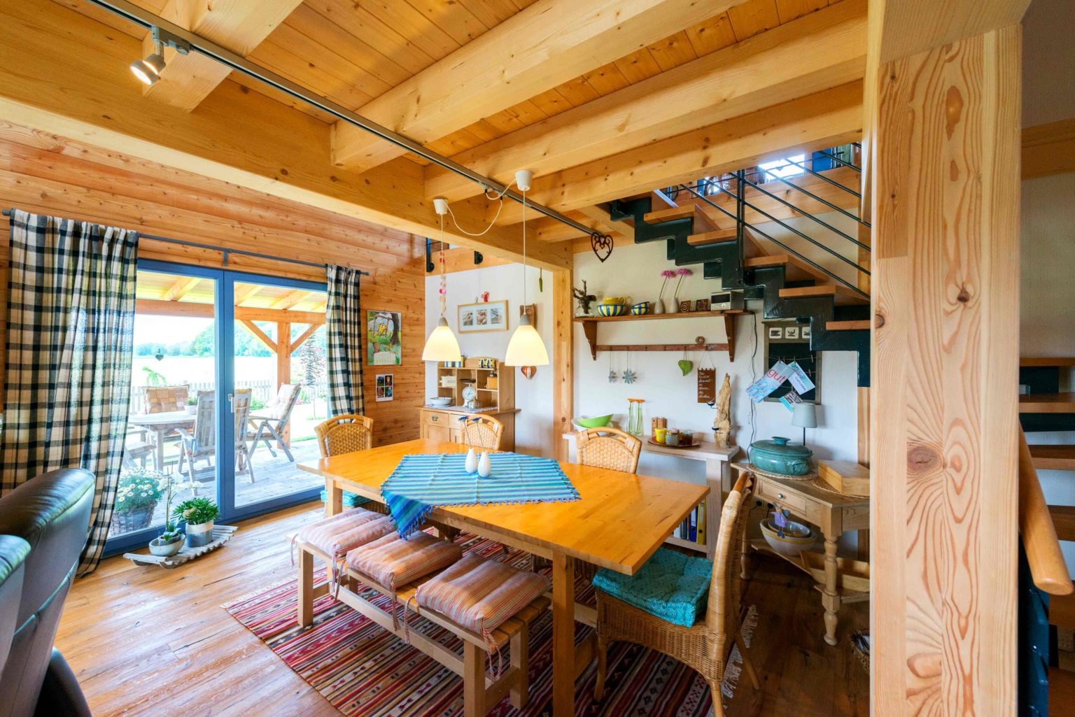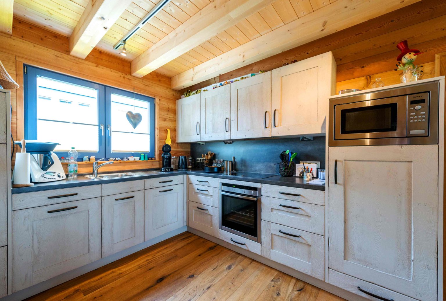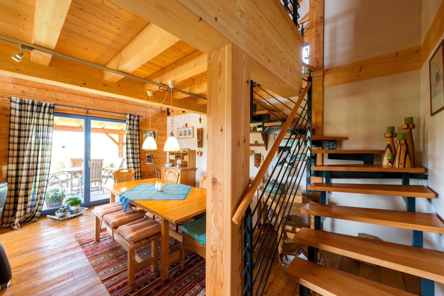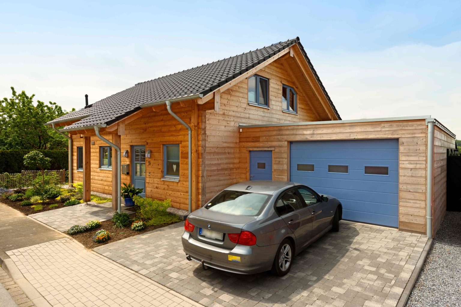 Auf Fullwood stieß das Paar, als ein Kollege von Karl-Heinz Weyenberg mit der Firma baute und rundum begeistert war. „Für seine Empfehlung sind wir heute noch dankbar!“, freut sich der Hausherr. Bei Bedarf auf einer Ebene wohnen Als die Mittfünfziger Holzhaus „Zweiland“ planten, dachten sie auch gleich ans Alter und die Möglichkeit, ausschließlich barrierefrei im Erdgeschoss wohnen zu können, falls irgendwann nötig. Der hinzugezogene Architekt machte daraufhin einen anderthalbgeschossigen Hausentwurf mit großem firsthohem Luftraum im offenen Wohn/Ess/Kochbereich, und der Möglichkeit, später mit dem Schlafzimmer vom Dachgeschoss ins Erdgeschoß zu ziehen, wo sich jetzt ein großes Büro befindet. Ein geräumiges Bad ist bereits in beiden Geschossen vorhanden, und eine große, teils überdachte Terrasse, zieht sich barrierefrei fast ums gesamte Holzhaus. Auch der Garten ist eben und im Notfall mit Rollator begehbar. Doch von körperlichen Einschränkungen sind die Weyenbergs sehr weit entfernt, im Gegenteil: Der Hausherr ist einen Tag vor dem beginnenden Hausaufbau noch den Hamburg-Marathon gelaufen! Mit Eigenleistung Geld sparen Andere bräuchten nach solch einer sportlichen Höchstleistung erst einmal Erholung. Nicht so Karl-Heinz Weyenberg, der vom ersten Bautag an dem Richtmeister des Hausherstellers bei der Hausmontage half. „Mit Freunden und Verwandten haben wir beim Hausaufbau geholfen und später auch im Innenausbau viel selbst gemacht. Dank unseres hervorragenden Richtmeisters klappte alles wunderbar und relativ entspannt! Er hat uns auch für den Innenausbau noch viele wertvolle Tipps gegeben.“, erzählt er. Nach nur vier Monaten ab Montagebeginn zog das Ehepaar schon in sein neues Holzhaus ein. „Ich würde sofort wieder ein massives Holzhaus mit Fullwood bauen!“, betont der zufriedene Hausherr. Gesundes Genusswohnen im warmen Ambiente „Wir fühlen uns total wohl in unserem Holzhaus!“, schwärmt Barbara Weyenberg. „Das muss an dem Zusammenspiel von gesunder Raumluft, behaglicher Atmosphäre und angenehmer Zimmertemperatur liegen, das die massiven Lärchenwände erzeugen.“, vermutet sie. Tatsächlich beweisen wissenschaftliche Studien, dass die gefühlte Temperatur in massiven Holzhäusern 2-3 Grad höher ist, als beispielsweise in Steinhäusern. Dieser Effekt schafft, neben dem zarten Duft und der warmen Ausstrahlung von Holz, eine Behaglichkeit, die es so nur in massiven Holzhäusern gibt. Genau die lieben Holzhaus Bbesitzer wie die Weyenbergs an ihrem Eigenheim. Außerdem heizt man weniger, was den Energieverbrauch und die Heizkosten senkt sowie der Raumluft im Winter zugutekommt. „Bei uns im Haus ist es immer gemütlich, egal wie das Wetter draußen ist.“, findet die Hauseigentümerin. Nicht nur Holzwände In Holzhaus „Zweiland“ bestehen nicht nur die Außenwände aus Massivholz (Lärche), auch die blauen Fensterrahmen, die blaue Haustür, die offene Balkendecke (Kiefer), der Dielenfußboden, die Zimmertüren, die Treppentritte und viele Möbel sind aus dem Naturmaterial. Lediglich das Treppen- und Galeriegeländer ist aus schwarzem Edelstahl, aber mit hölzernem Handlauf - der schmeichelt den Händen. Zu den tragenden Vollholzwänden ergänzte das Ehepaar weiß verputzte Trennwände (Ständerbauweise), die für zusätzliche Helligkeit im Holzhaus sorgen. „Wir hatten Angst, dass uns ausschließlich Holzwände doch zu viel würden.“, erklärt Barbara Weyenberg. Dank der großen, oft bodentiefen Fenster fällt reichlich natürliches Licht ins Hausinnere, so dass alles hell und luftig (offener Luftraum) wirkt. Außen wurde zudem eine Garage mit direktem Zugang in die Diele angebaut, selbstverständlich auch aus Holz. So gelangt man bei jedem Wetter trockenen Fußes vom Auto ins Holzhaus. Da das Dach zur Gartenseite weit abgeschleppt ist, können die Weyenbergs auch verregnete Sommer auf ihrer schönen Terrasse genießen. Und sollte ein Besucher vor der Haustür warten müssen, lässt ihn das Ehepaar nicht „im Regen stehen“, sondern bietet ein kleines, abgeschlepptes Vordach über der Haustür. Praktischer Grundriss im Quadrat Nahezu quadratisch ist der Grundriss von Holzhaus „Zweiland“. Im Erdgeschoss befindet sich an der Ostseite der straßenseitige Eingang, von dort tritt man in eine geräumige, geschlossene Diele, die zum Gäste-Bad/WC, zur Garage, in die Küche und ins Büro führt. Der zum Wohn/Ess-Bereich hin offenen Küche ist ein Hauswirtschaftsraum angeschlossen, in dem Vorräte gelagert werden und Waschmaschine und Trockner stehen. Zwischen Küche und Wohn/Ess-Zimmer befindet sich die halb gewendelte Geschosstreppe, welche auf die Galerie im Dachgeschoss führt. Oben komplettieren ein Schlafzimmer, ein Abstellraum und ein Badezimmer das Raumprogramm von Holzhaus „Zweiland“. Der Wohnbereich ist nach Süd/Westen ausgerichtet, und das Schlafzimmer an der nord-östlichen Hausecke positioniert. Die Weyenbergs stehen also morgens mit der Sonne auf und genießen ihren Feierband mit der Sonne im Wohnbereich oder auf der Terrasse.